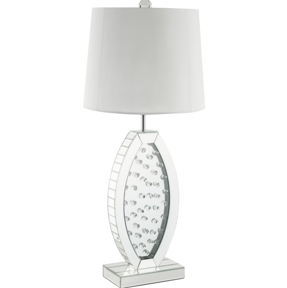 Introducing the NYSA Large Table Lamp – a glamorous addition to the Nysa Collection that effortlessly blends elegance with modern design. This striking table lamp features mirrored surfaces and faux crystals, creating a luxurious aesthetic that adds a touch of opulence to your living space.