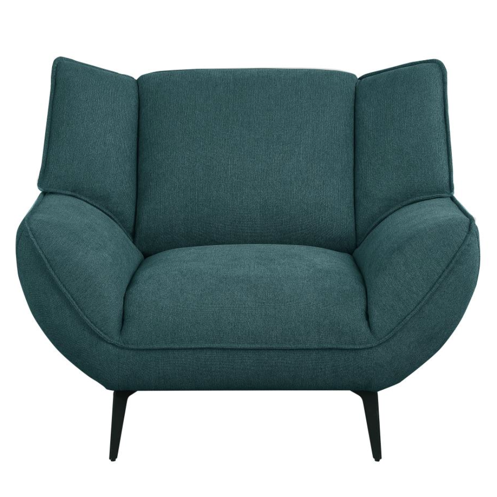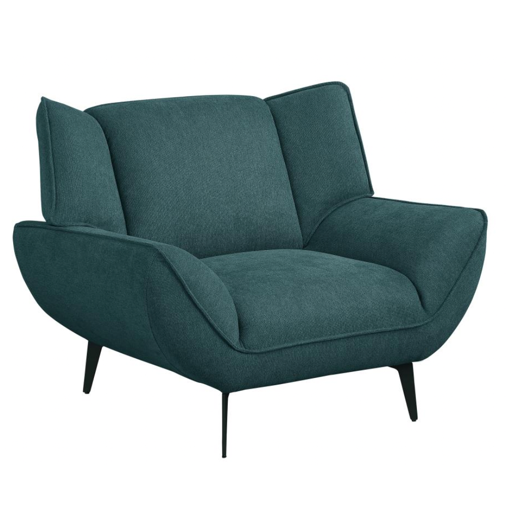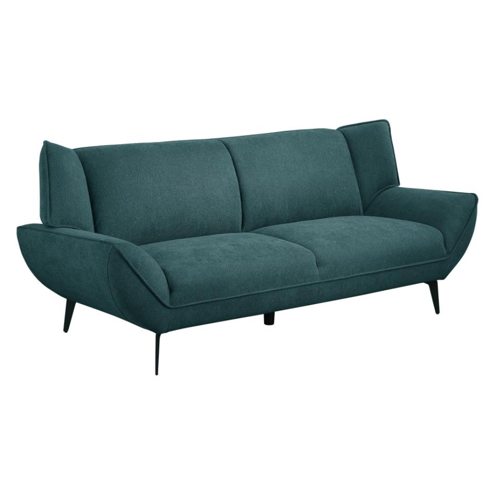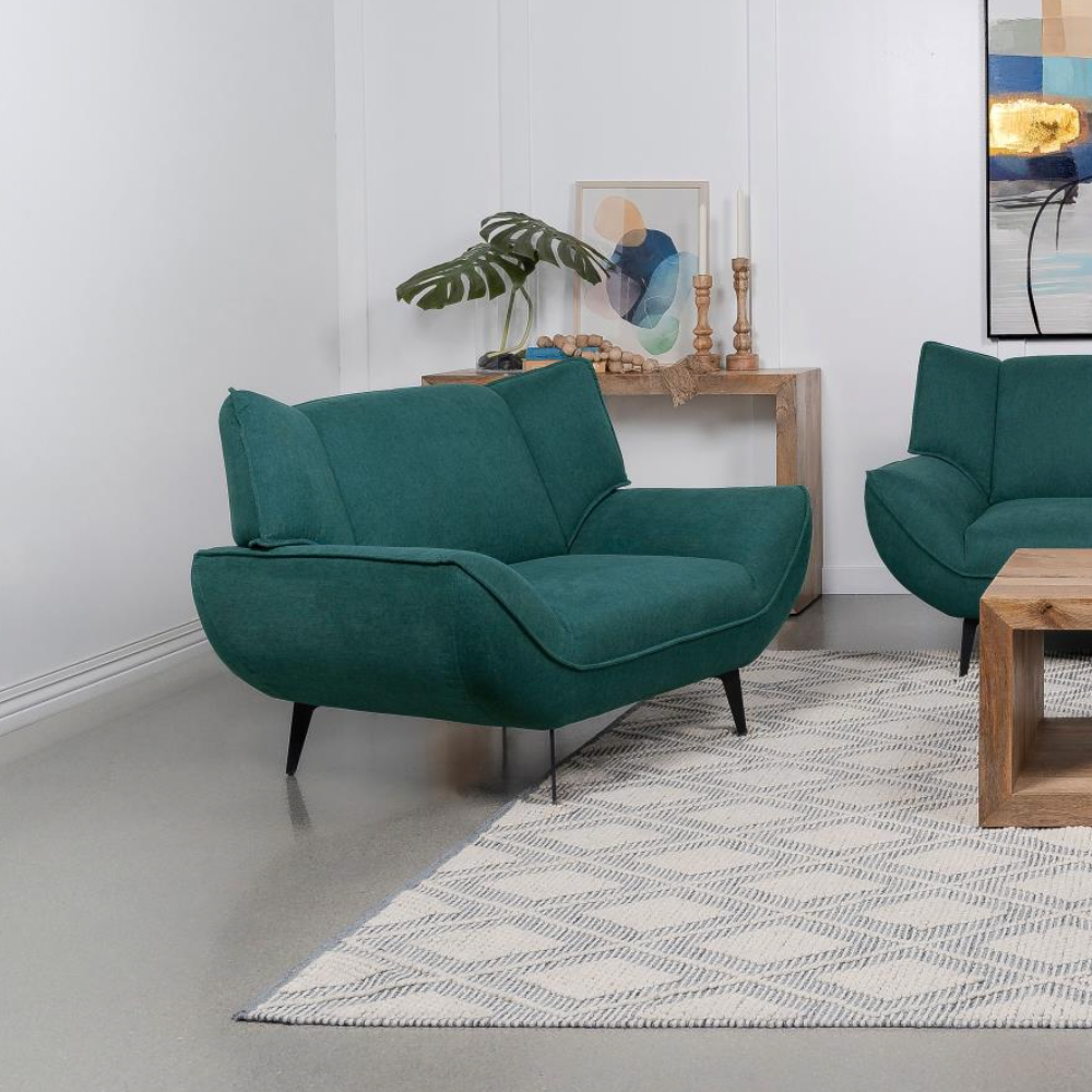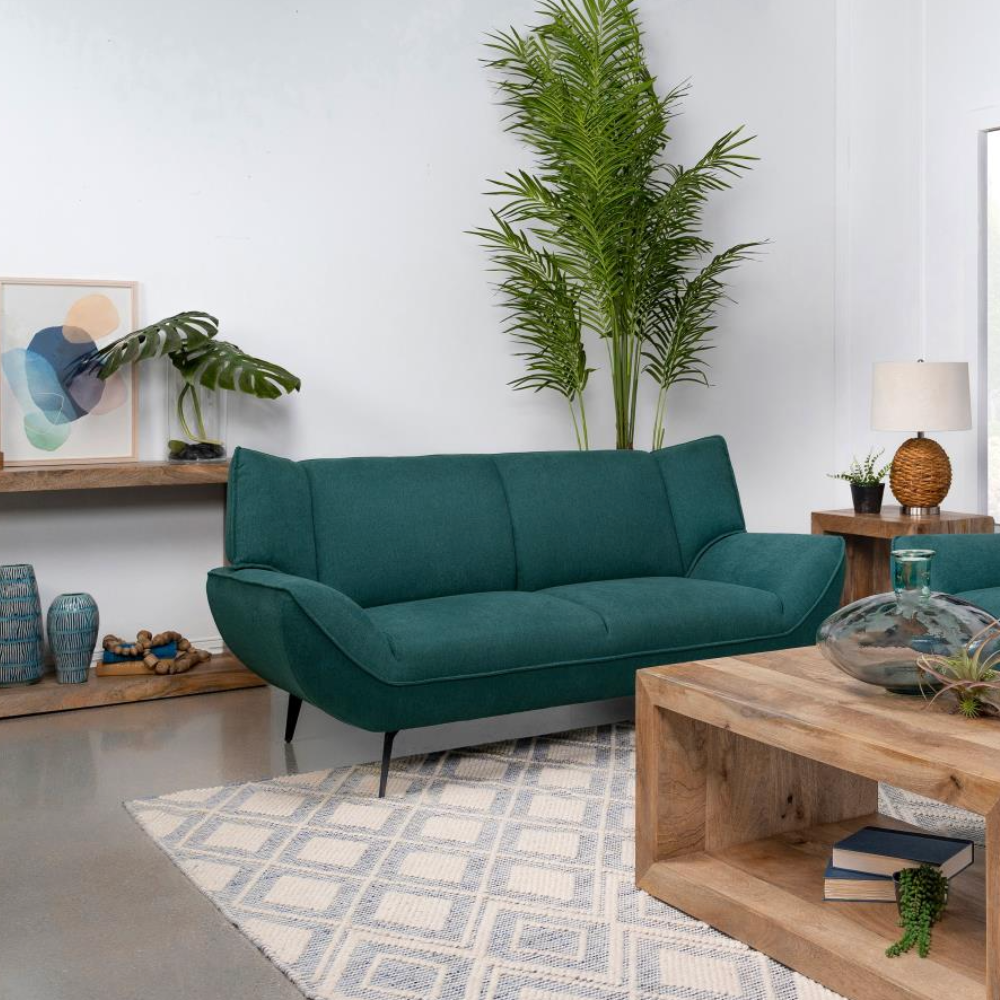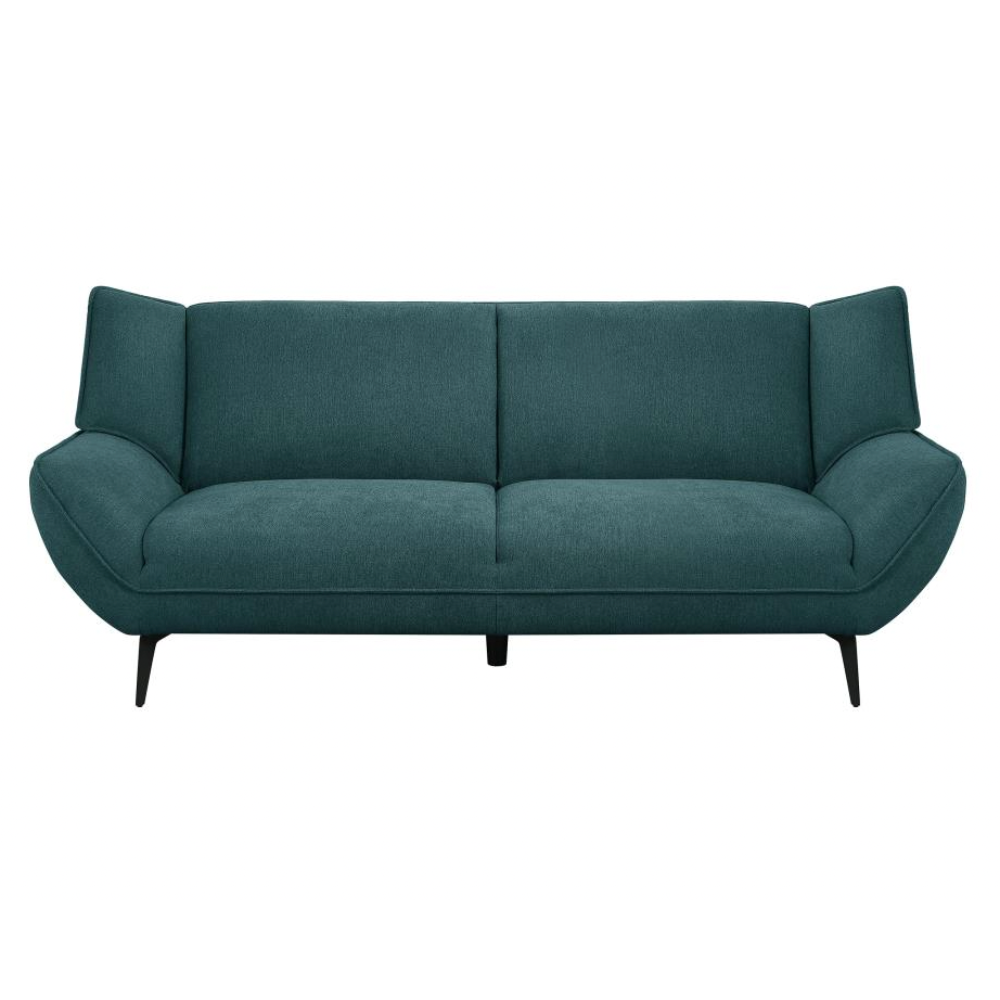 Infuse your casual living space with the charm of mid-century modern style using this inspiring sofa set. The comfy and stylish teal blue upholstery makes this set an excellent choice for enhancing your living room or family room. The fabric upholstery opens up endless palette possibilities for a rich, inviting look. Thoughtfully designed, it features flared arms and wing backs, seamlessly paired with non-removable seat and back cushions for added comfort. Tapered black metal legs provide a sturdy yet sleek foundation, perfectly complementing the vibrant teal hue. This set effortlessly creates a cozy and sophisticated ambiance in any space.