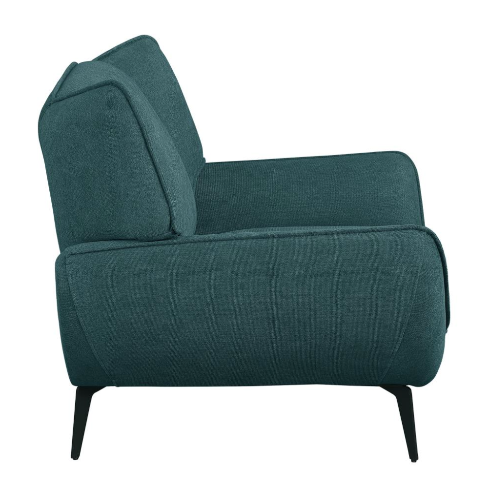 Enjoy extra comfort and style with this generously wide chair that brings mid-century modern vibes to your living space. Perfect for lounging, reading, or adding a statement piece to your room, this chair is ideal for compact spaces and apartments. The rich teal fabric upholstery enhances the ambiance, allowing for a lush color palette. Flared arms and wing backs seamlessly connect to a non-removable seat and back cushion, ensuring both style and support. Finished with tapered black metal legs, this chair provides a perfect blend of retro charm and contemporary elegance.