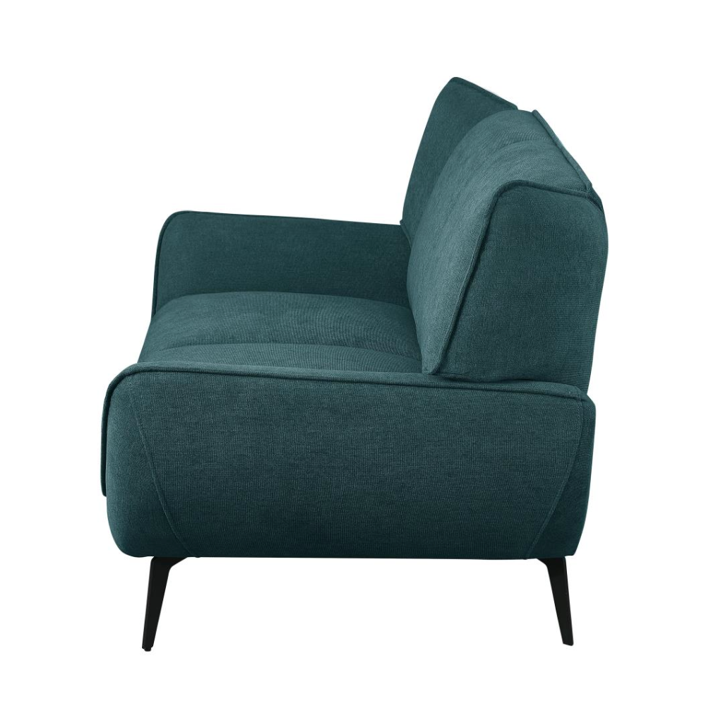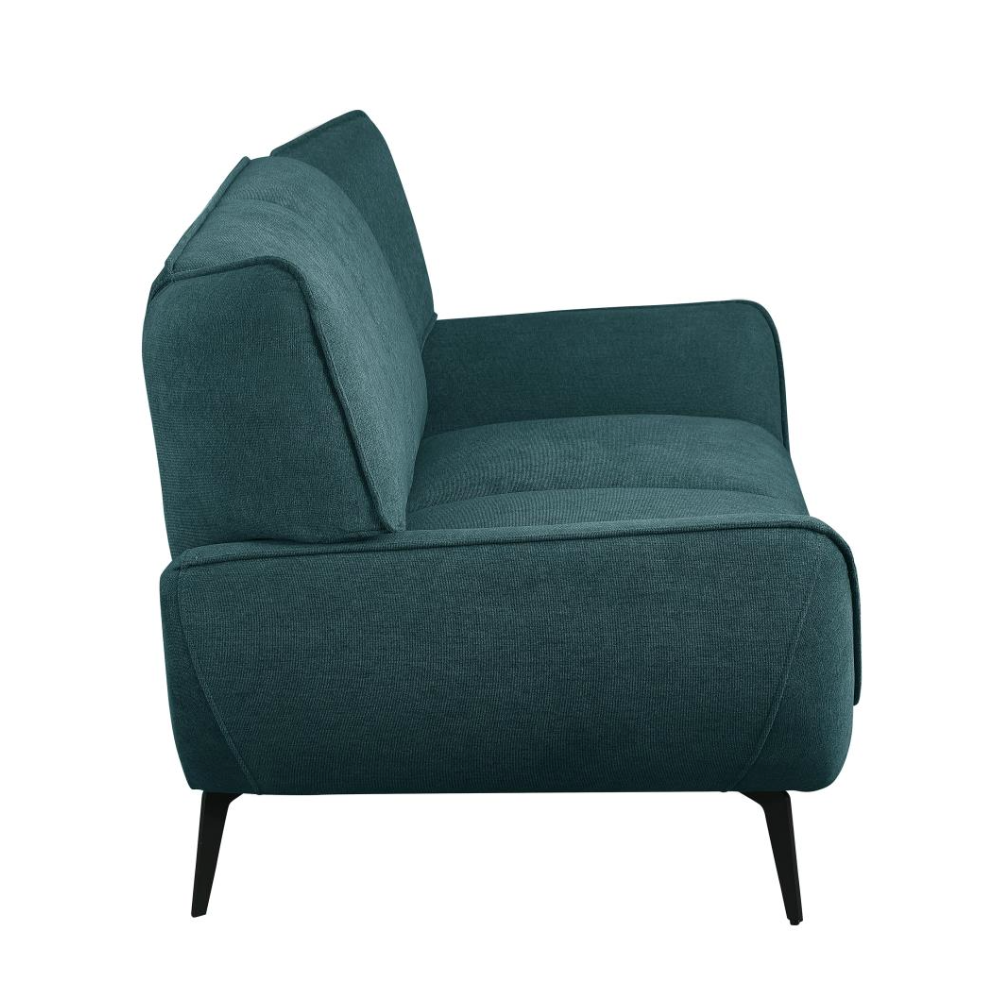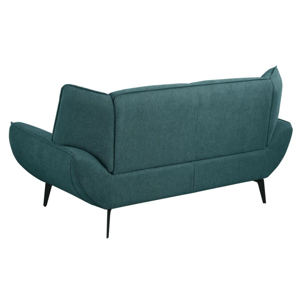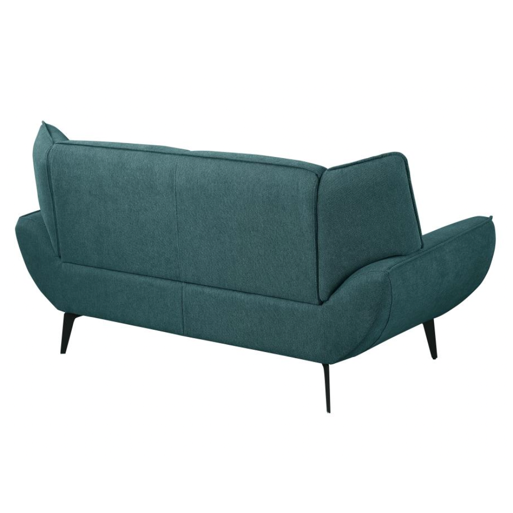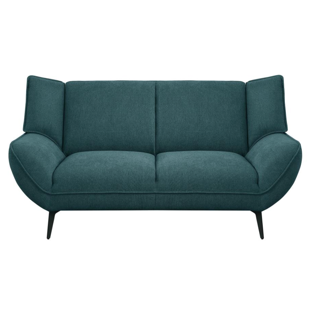 Your casual living space becomes the epitome of style and comfort with this mid-century modern two-seater loveseat. Perfectly designed for compact spaces or small apartments, it serves as a great companion piece to a sofa or as a standalone statement. The lush teal fabric upholstery opens up possibilities for creating a vibrant palette in your home. Featuring flared arms and wing backs seamlessly attached to non-removable cushions, this loveseat exudes both elegance and comfort. Tapered black metal legs complete the look, adding a touch of sophistication.