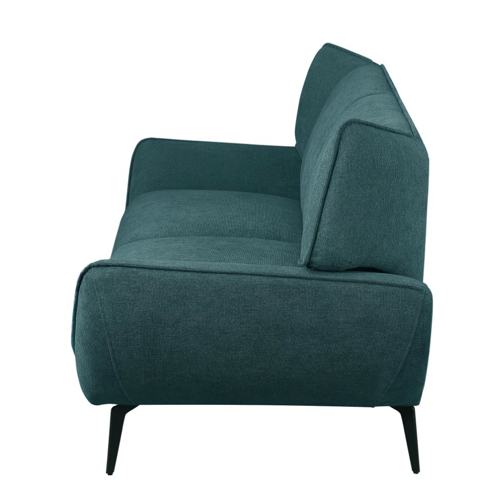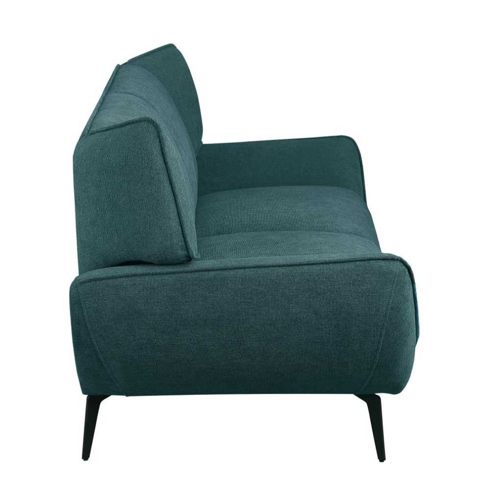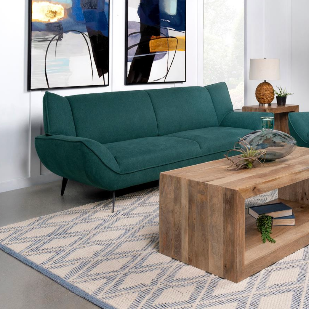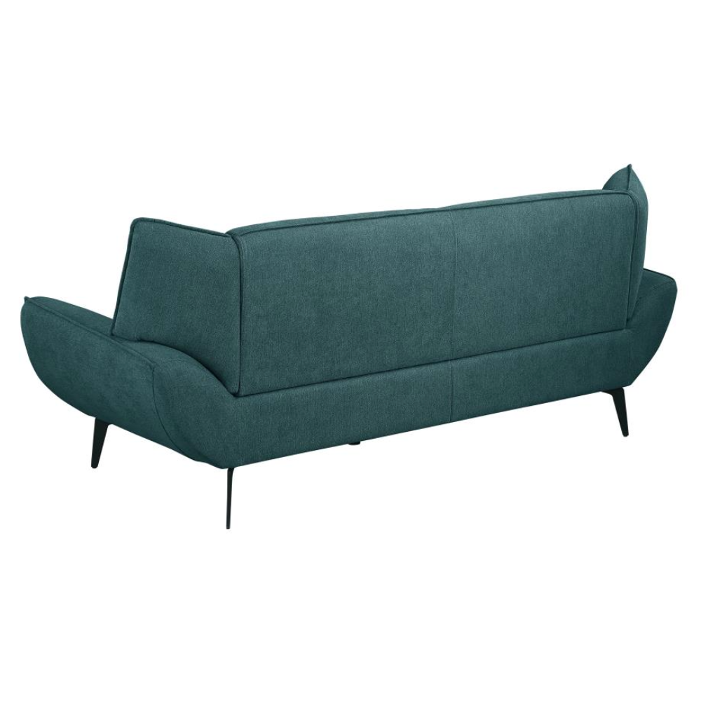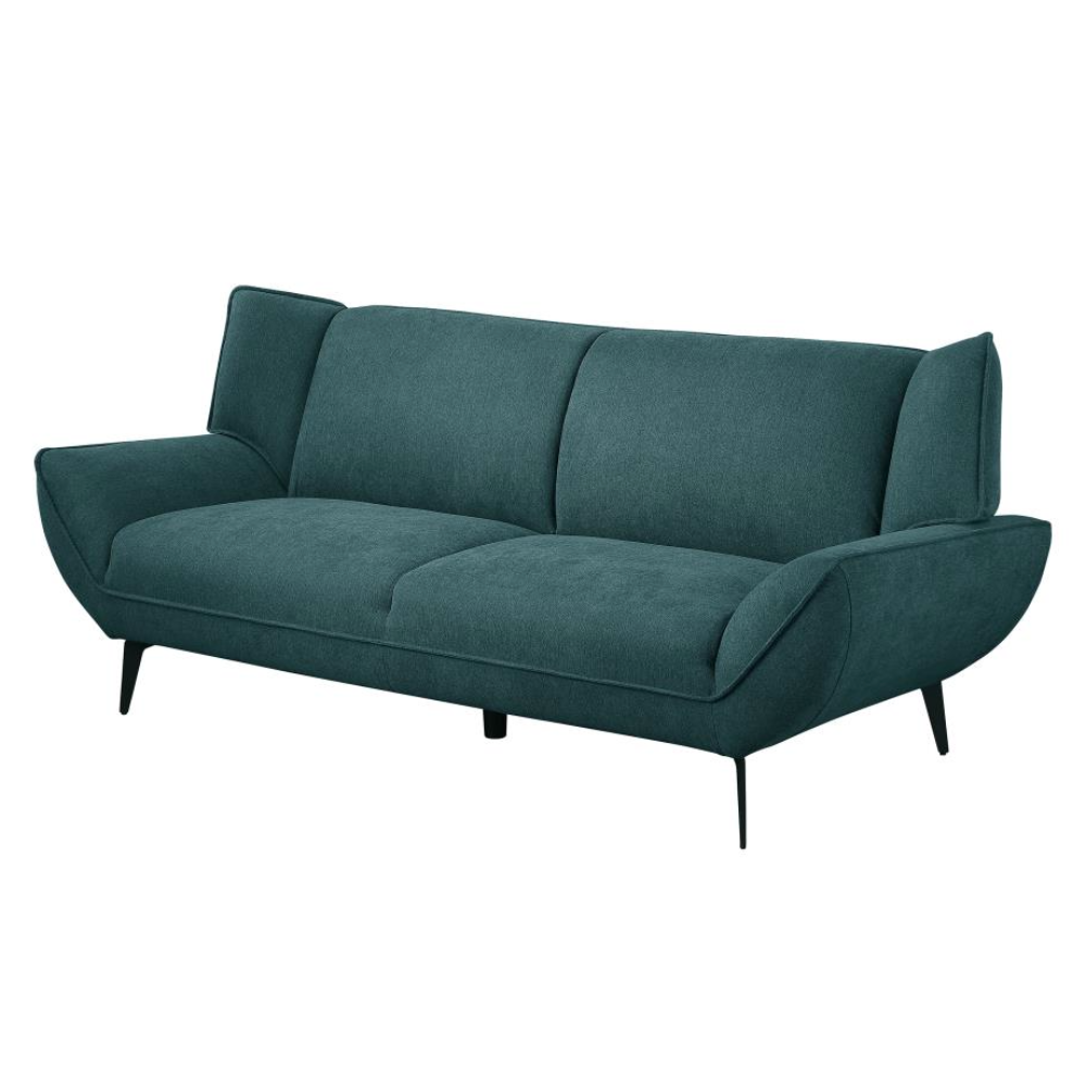 An iconic mid-century modern motif makes this sofa a perfect addition to your casual living room or den. Combining retro design elements with modern comfort, this sofa is designed for easy, relaxed lounging. The beautiful teal fabric upholstery provides a vibrant touch, allowing you to create a lush color palette in your space. Flared arms and winged backs seamlessly attach to non-removable seat and back cushions, offering both style and support. Finished with tapered black metal legs, this sofa ensures a sturdy yet stylish foundation.