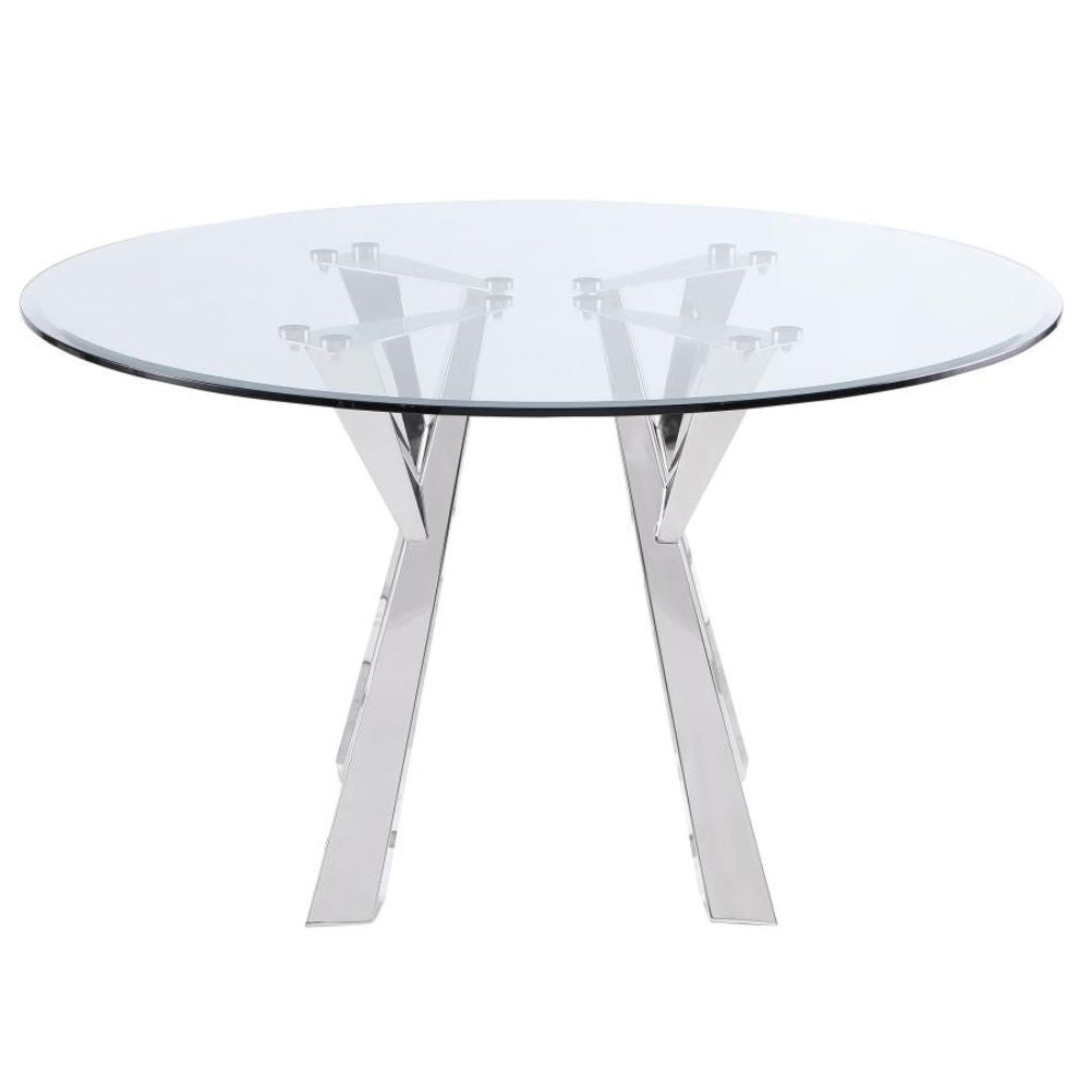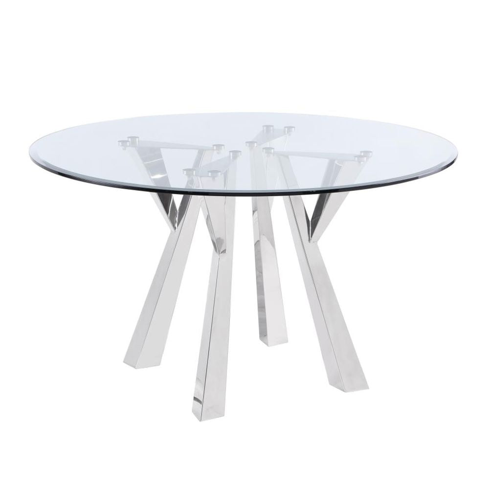 Center your sophisticated dining space on the impeccably designed Alaia round dining table. Instilling a sense of glamorous energy, the table boasts a geometric base design crafted in metal with rich angularity and elegance. A gleaming chrome finish plays up the glam look, perfect for a semi-formal space, whether in a dining room or highlighting your breakfast nook. A thick glass tabletop is stylishly detailed, complete with a 25mm beveled edge that creates a finished look and feel. Complete the look with a vase of fresh-cut flowers or serve up a delectable brunch.