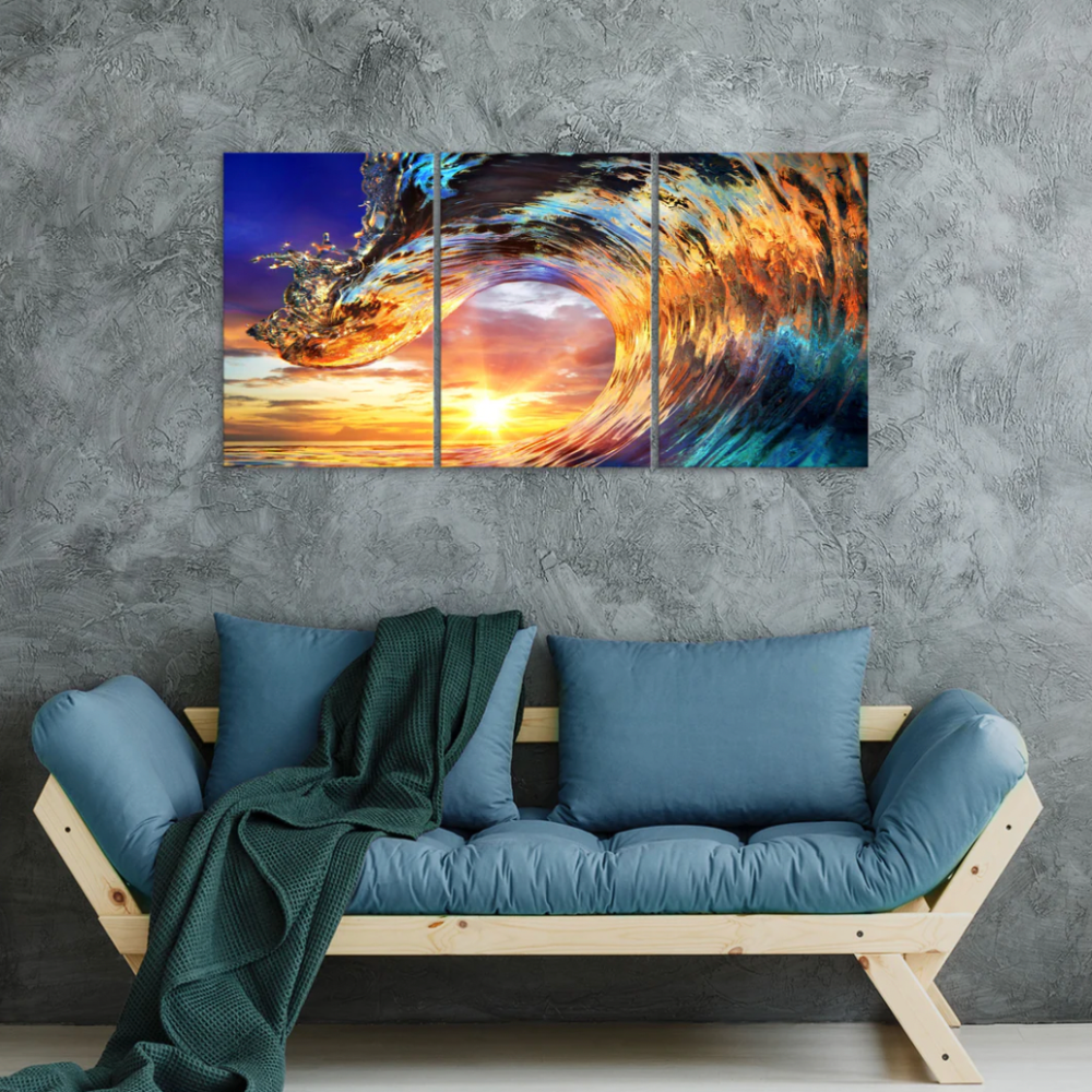 Bring the tranquility of the ocean to your living room with this stunning 3-piece tempered glass wall art. Featuring vivid orange sunset tones and ultra-realistic blue crashing waves, this modern design instantly transports you to a serene beachside setting. Perfect for creating a relaxing atmosphere, it makes a captivating centerpiece in any space.