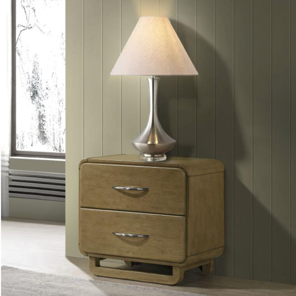 This two-drawer nightstand combines modern style with everyday functionality, making it a perfect bedside companion. The warm nutmeg wood finish adds a natural touch, while rounded edges create a sleek, contemporary look. Designed for convenience, it features smooth metal extension glides and an integrated cord management system to keep electronics organized.