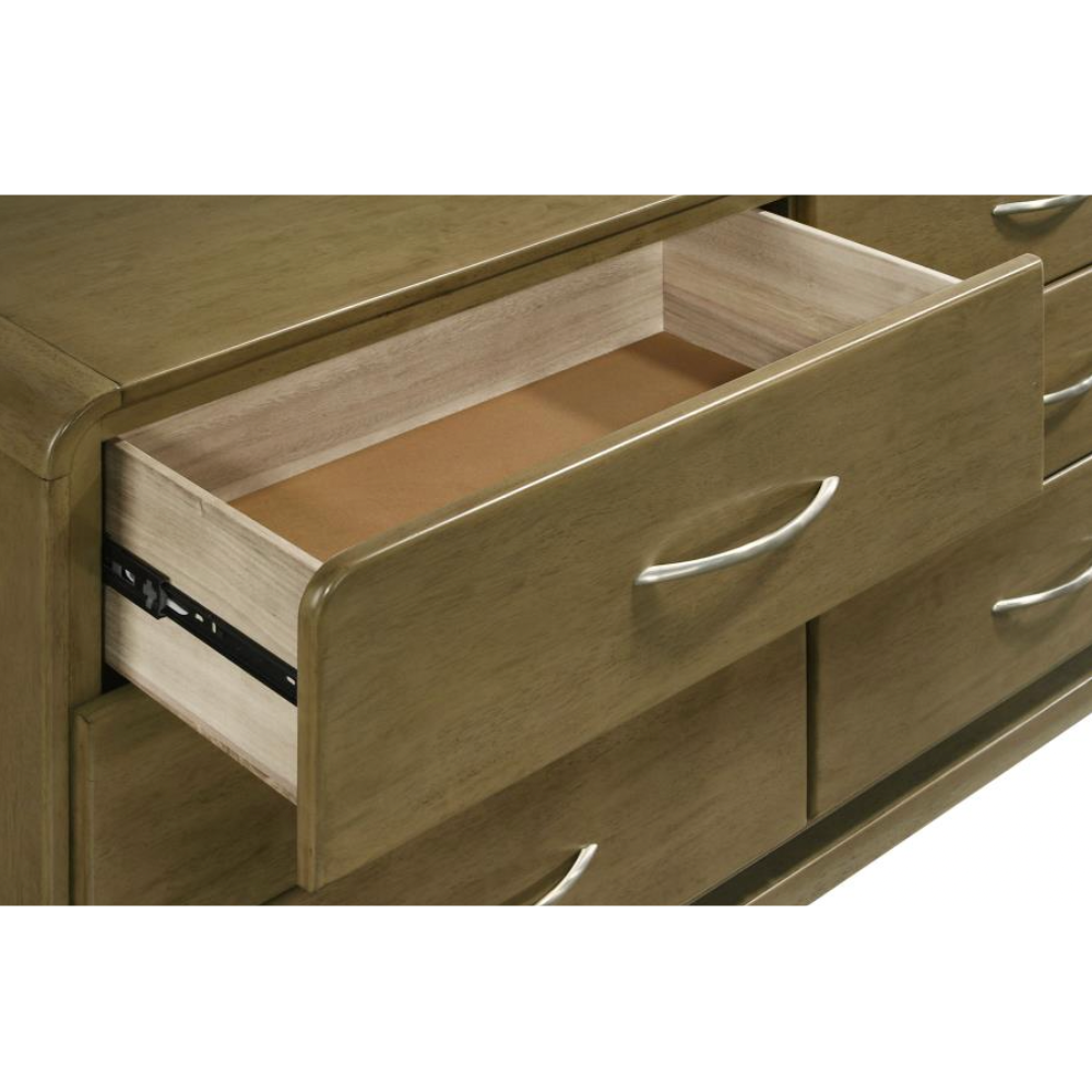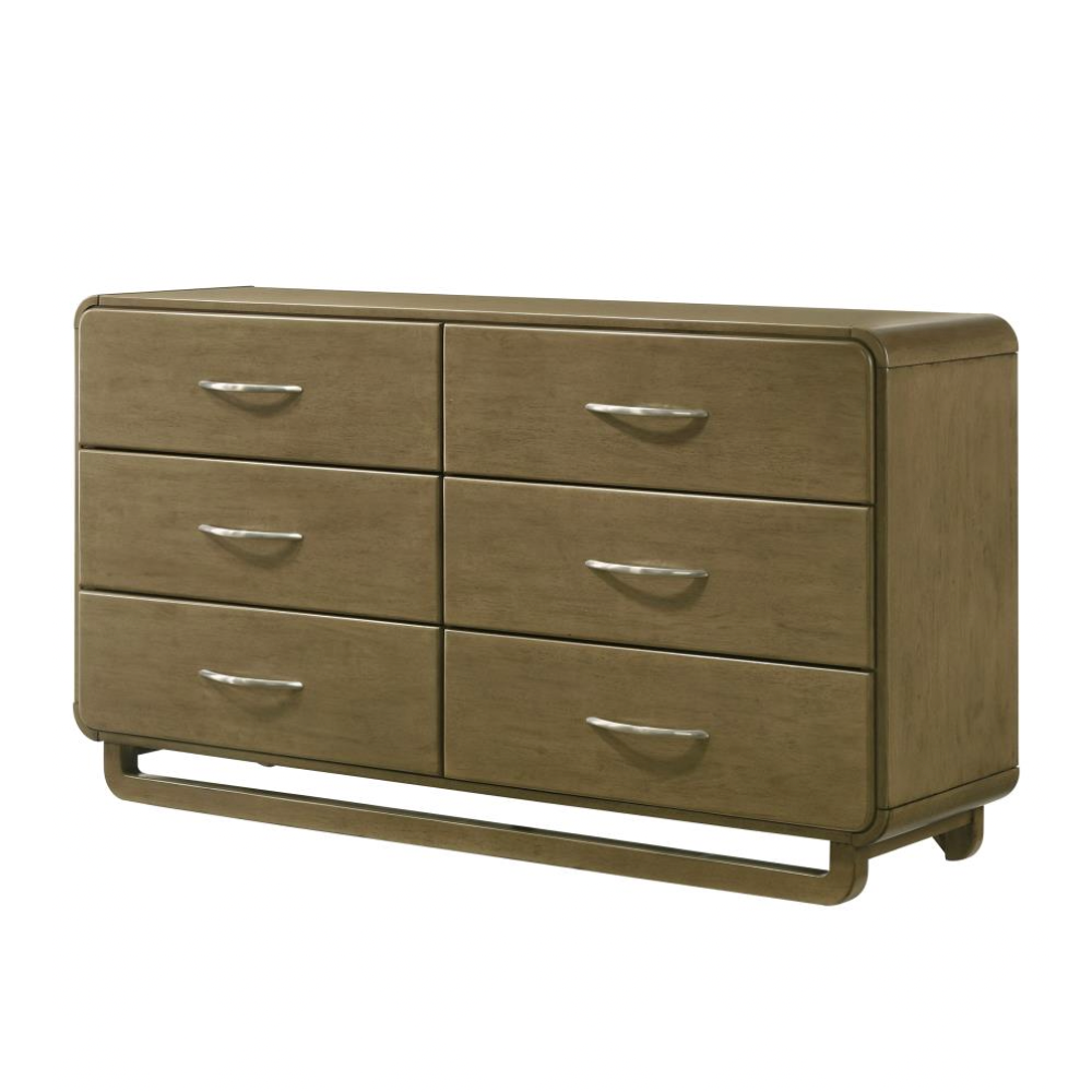 This six-drawer dresser brings modern sophistication to your bedroom with its warm nutmeg wood finish and sleek design. The rounded corners soften its contemporary profile, while matte nickel hardware adds a stylish accent. Designed for smooth functionality, each drawer features metal extension glides for effortless access. Crafted from solid Asian hardwood, this dresser provides both durability and refined elegance.