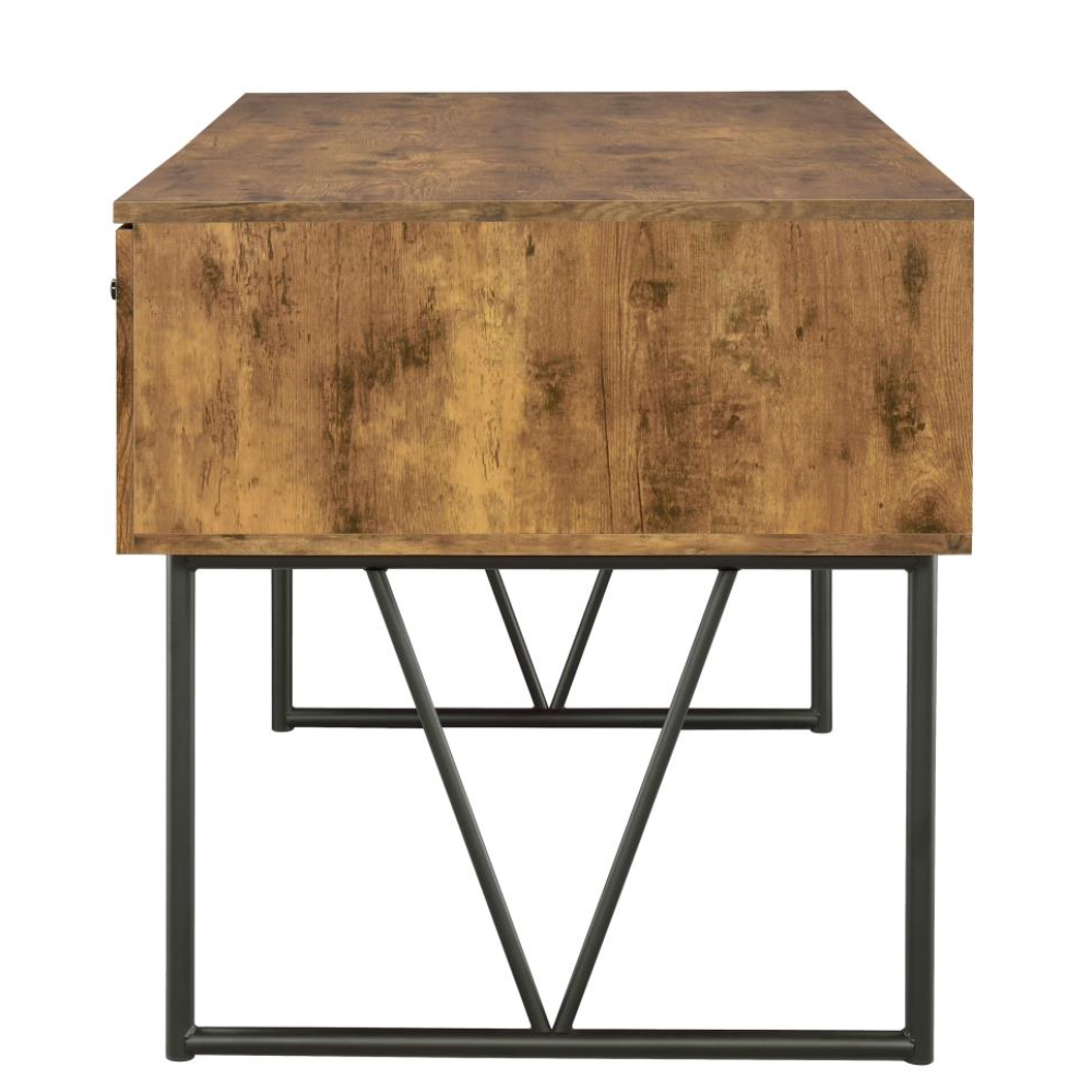 Rustic charm meets industrial influence in this inviting writing desk. Designed with minimalist lines for a crisp, clean look, it features an antique nutmeg finish that adds earthy warmth to any modern workspace. Four drawers with full extension glides ensure smooth, reliable storage for essentials, while an open shelf at the back provides additional display space. A black metal base with a bold geometric pattern introduces a striking industrial element, making this desk a standout in any home office.