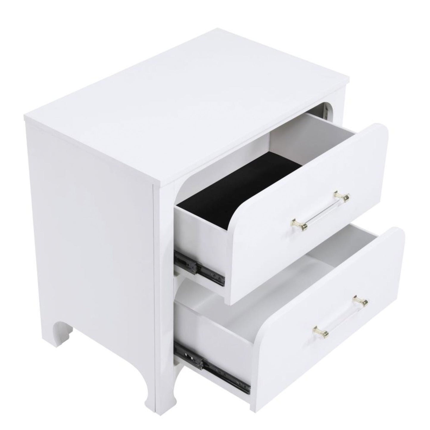 Enhance your bedside setup with this modern two-drawer nightstand, designed to elevate your lounging experience and add personalized character to your bedroom decor. With a roomy top surface, it provides ample space for a reading lamp, decor, and other bedside essentials, allowing you to create a cozy and functional space. The nightstand features a light and airy pearl white finish, complemented by clear bar pulls on each drawer front, adding a touch of modern elegance to the design. Its two drawers offer convenient storage for personal items, charging cables, and more, with the top drawer lined with felt to protect delicate items or electronics like your phone and tablet.