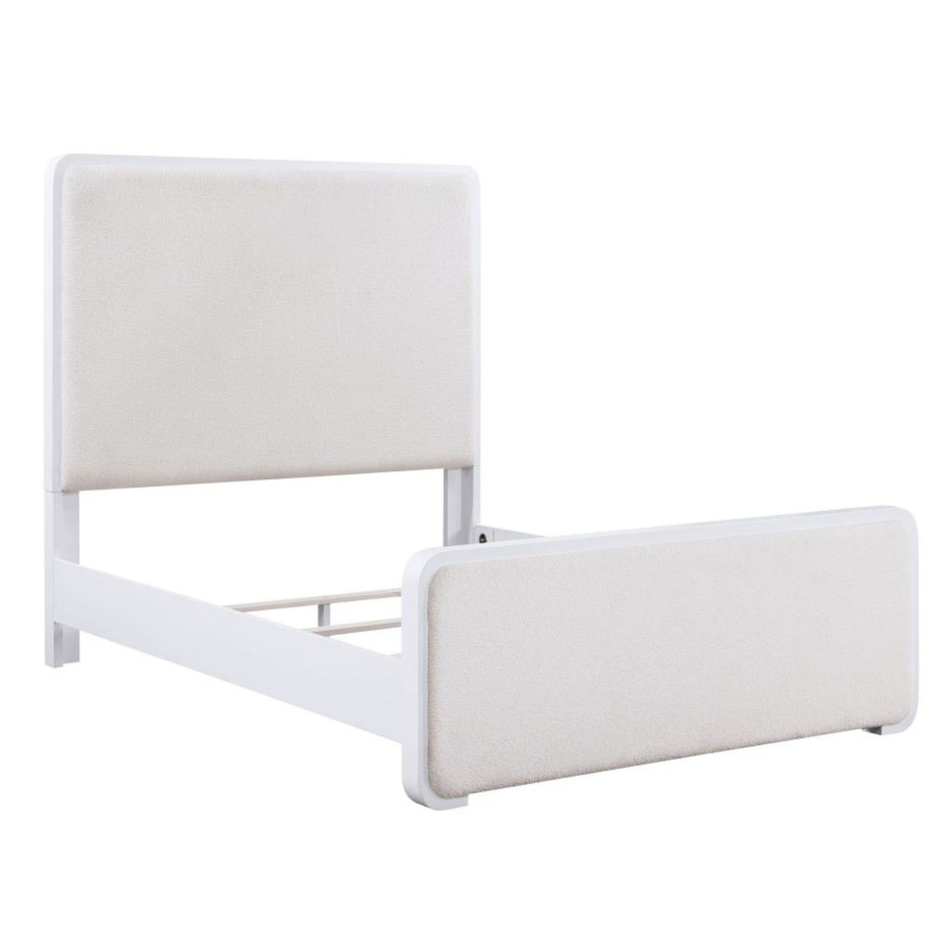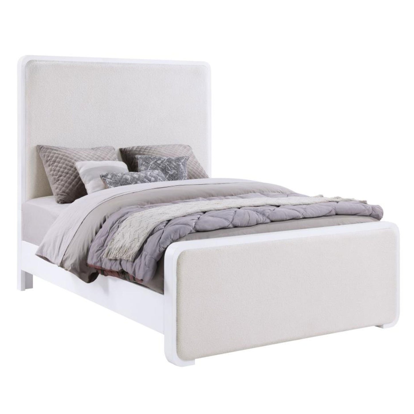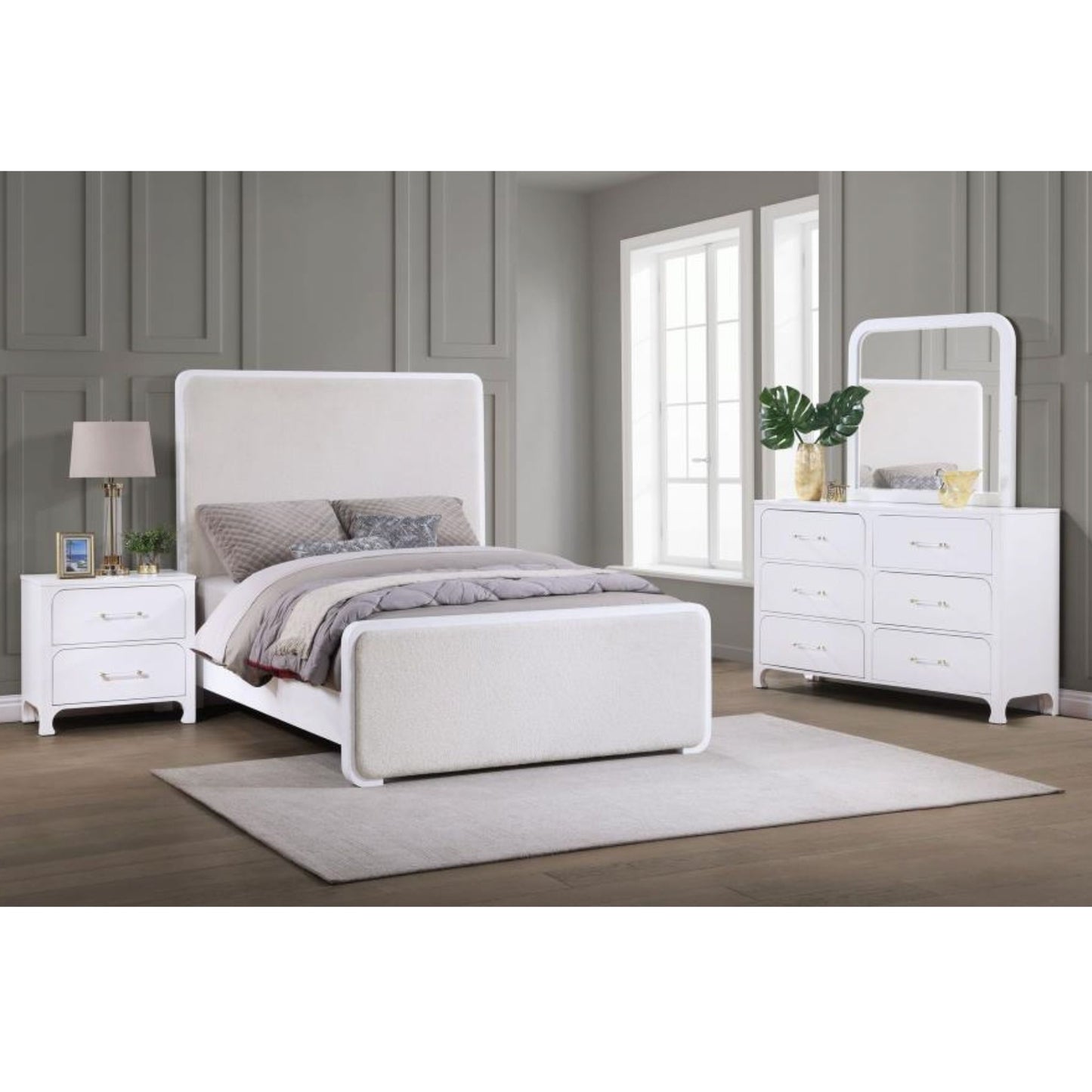 Create a serene and inviting retreat in your bedroom with this exquisite four-piece modern bedroom set in pearl white, designed to elevate your space with style and functionality. The bed features lightly textured beige upholstery on a padded head and footboard, providing a comfortable spot for evening relaxation and lounging. Abundant storage is offered by the two-drawer nightstand and six-drawer dresser with a mirror, each featuring felt lining in its top drawers to protect delicate items. Delicate curves accentuate the base of each piece, while rounded upper corners on the drawers echo the silhouettes of the bed and mirror for a cohesive look. Complete with clear bar pulls, this set adds a touch of contrasting depth and glamour to your bedroom decor without overpowering the overall aesthetic.
