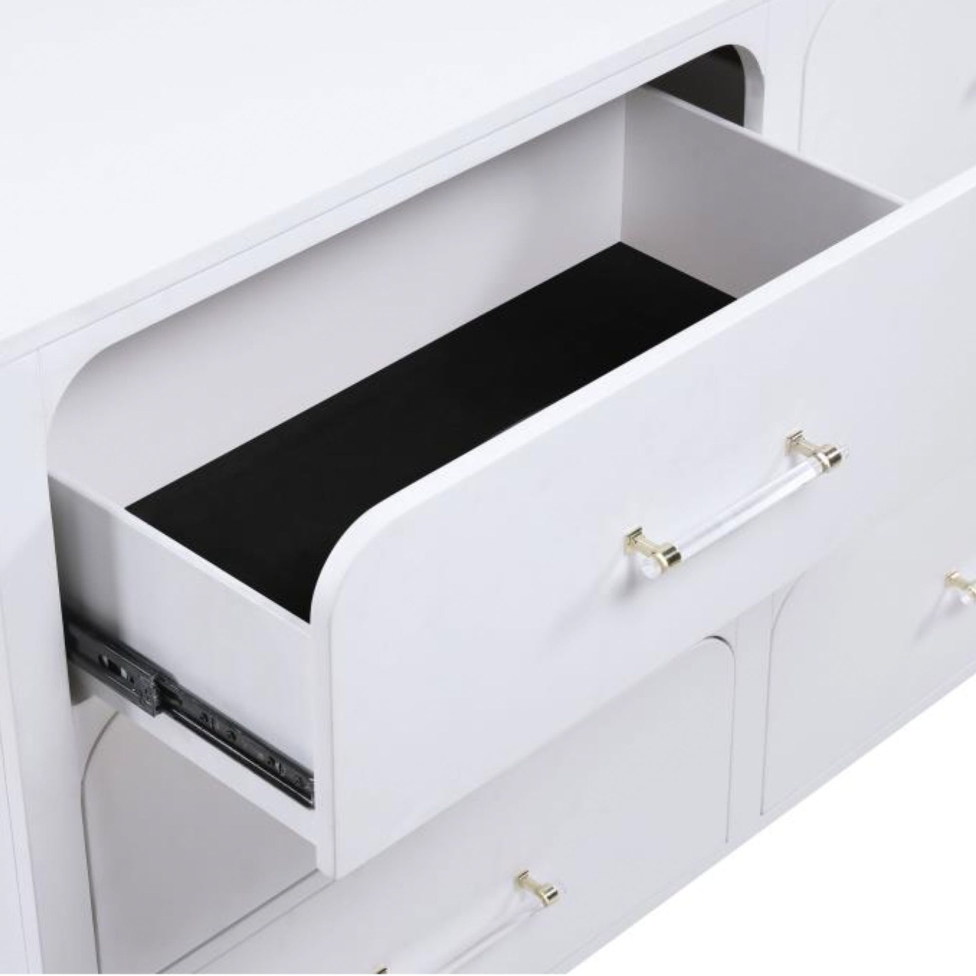 - Contrasting Hardware: Clear bar pulls add a touch of contrasting depth and glamour to the set, enhancing its visual appeal without overpowering the overall design.