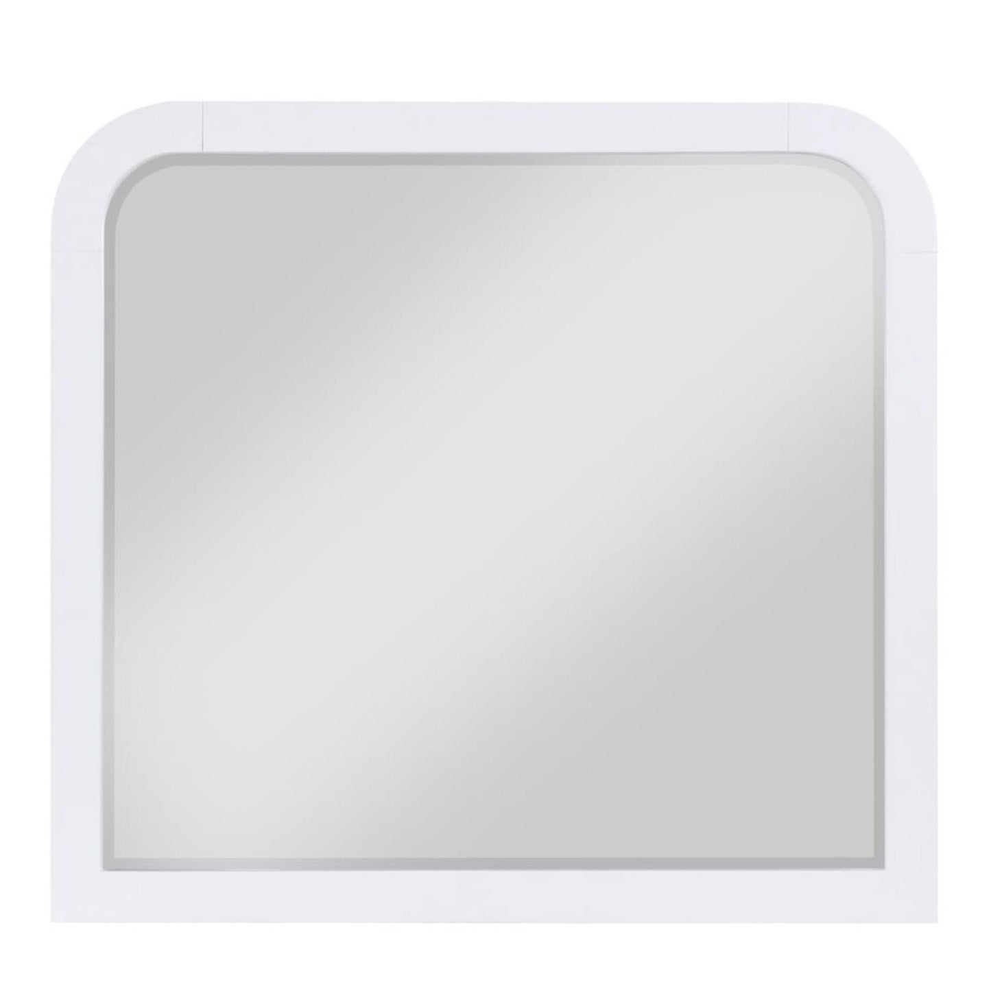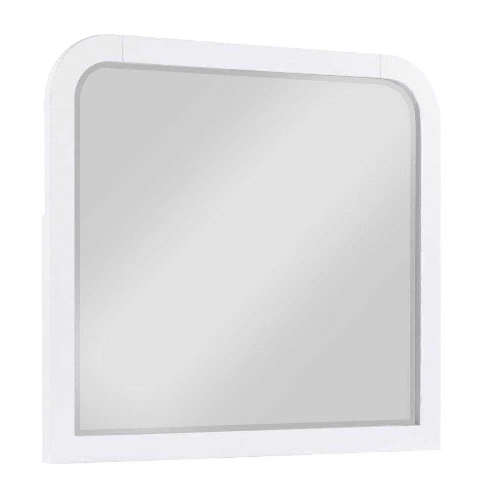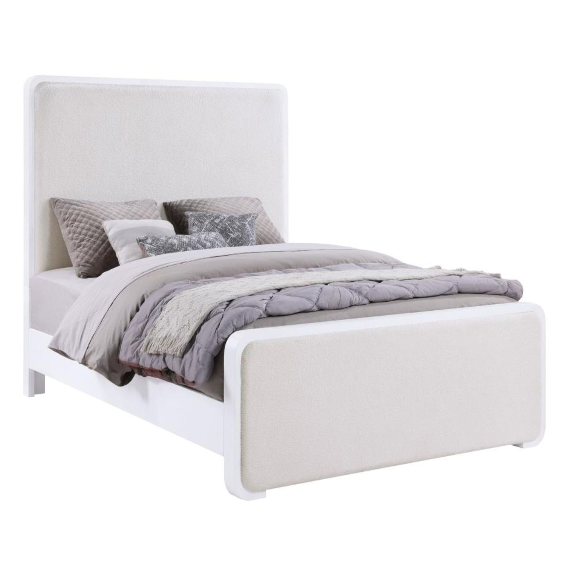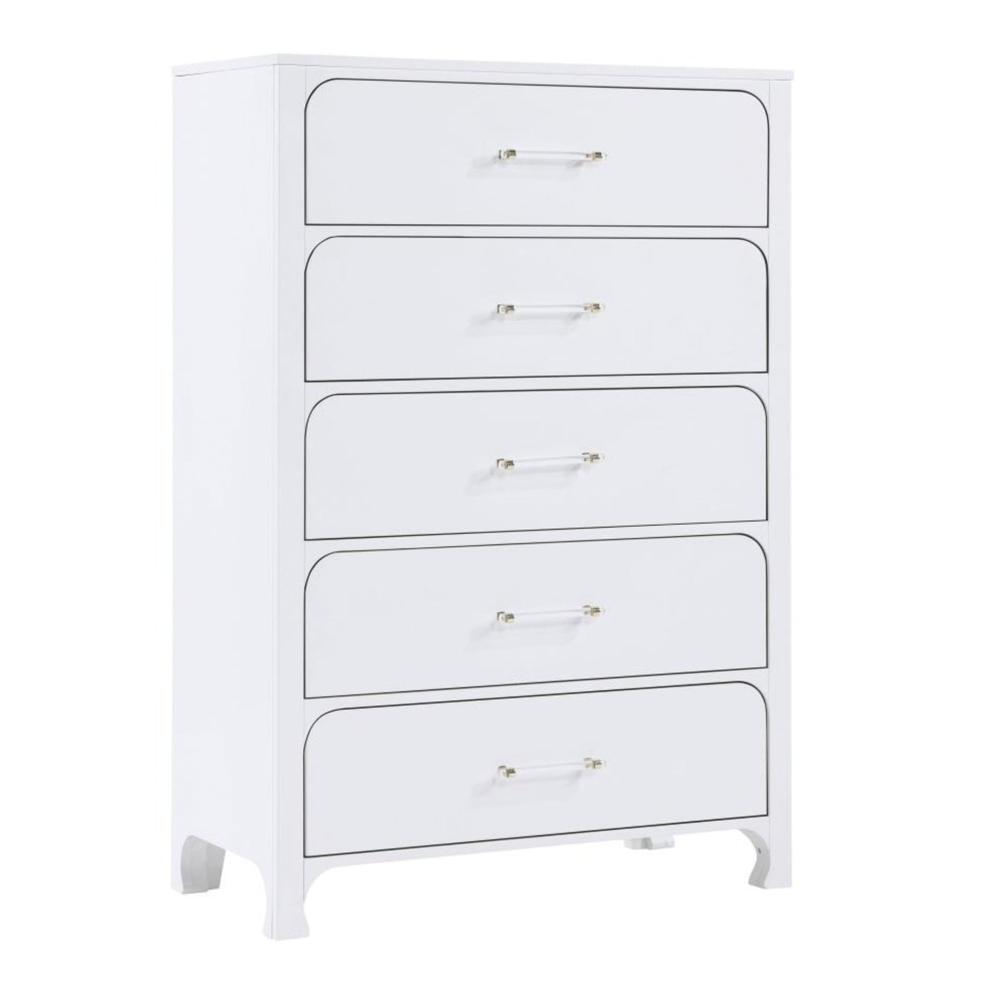 Transform your bedroom into a sanctuary of modern elegance with this five-piece bedroom set. The set includes an upholstered bed, nightstand, chest, dresser, and mirror combination, providing everything you need for a cohesive and stylish bedroom ensemble. Featuring a pearl white finish and light beige, textured upholstery, this set exudes a fresh and airy elegance that brightens up any space. The bed boasts a tall headboard and low footboard, complemented by rounded corners echoed in the drawer fronts of each storage piece, adding a touch of sophistication to the design. With ample storage space, including felt-lined top drawers for delicate items, this set offers both style and functionality. Complete with elegant curves and clear bar pulls, this set delivers a perfect blend of sophistication and simplicity to elevate your bedroom decor.