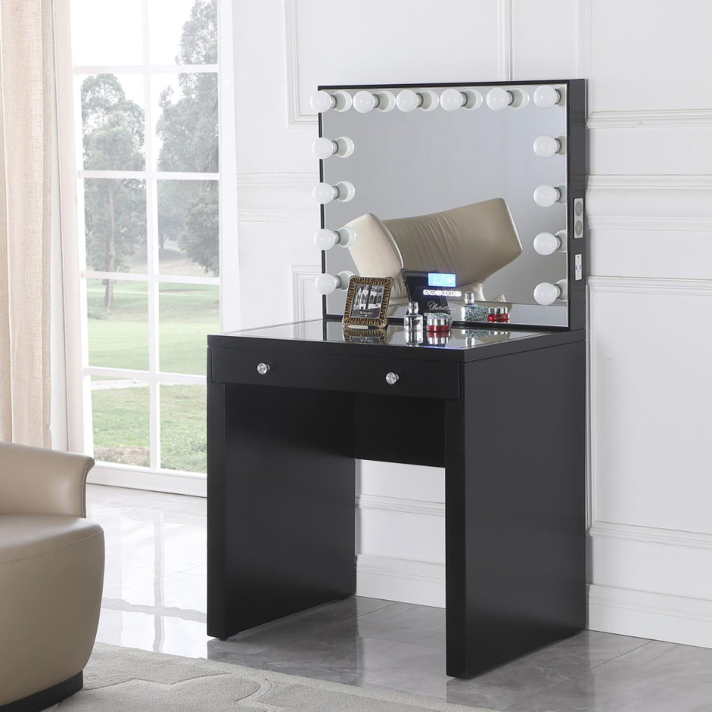 Upgrade your beauty routine with our Black Vanity Desk with Bluetooth Hollywood Mirror. This chic vanity desk combines modern technology with classic Hollywood glamour, featuring a Bluetooth-enabled mirror surrounded by dimmable LED bulbs for perfect lighting. Ideal for makeup application or a touch of luxury in any bedroom.