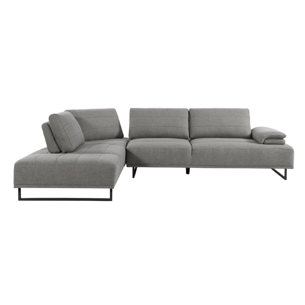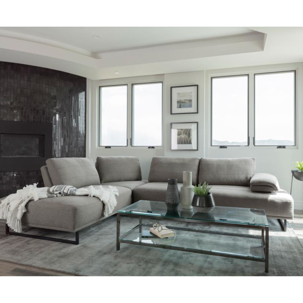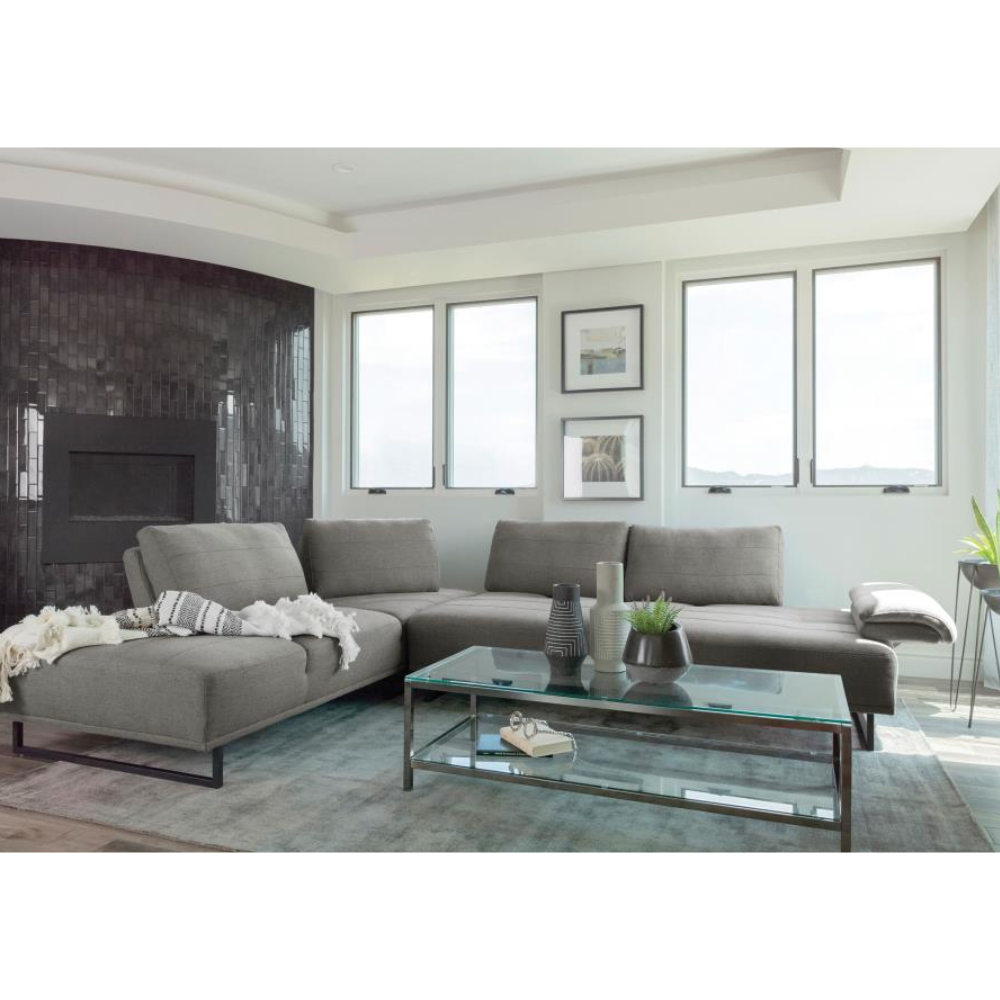 Add modern stylishness to your space with this magnificent contemporary sectional sofa. It is exceptionally upholstered in an elegant taupe woven fabric that's soft to the touch. The powder-coated black base features U-frame legs for sturdiness. One end has an open chaise-like design, while the opposite has an extension pillow top arm that can be used as a headrest when lounging. An added feature is the individual self-adjusting backrests, which allow for shortening and expanding seat depth.