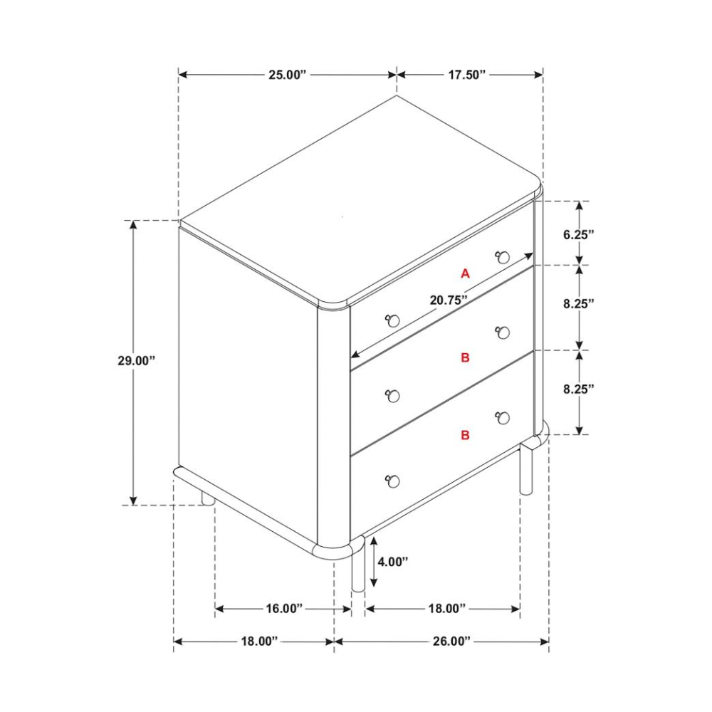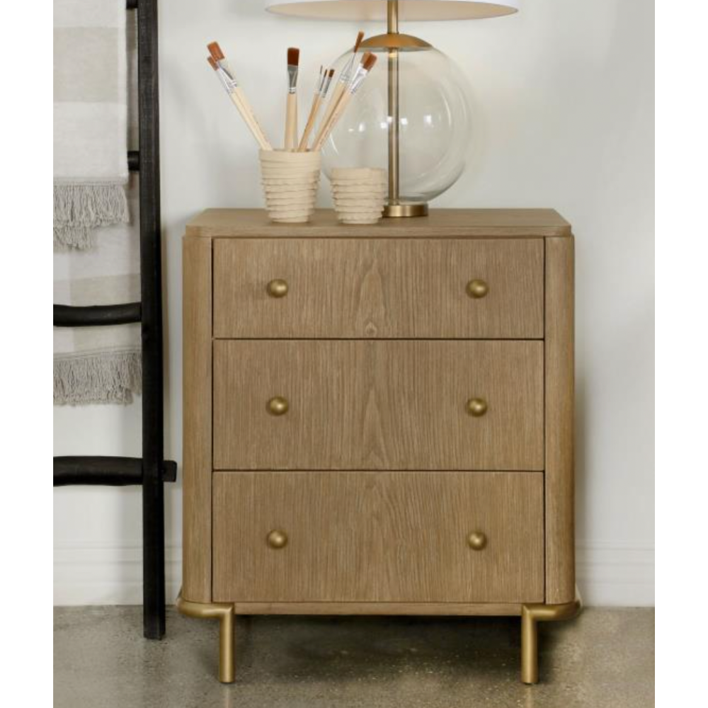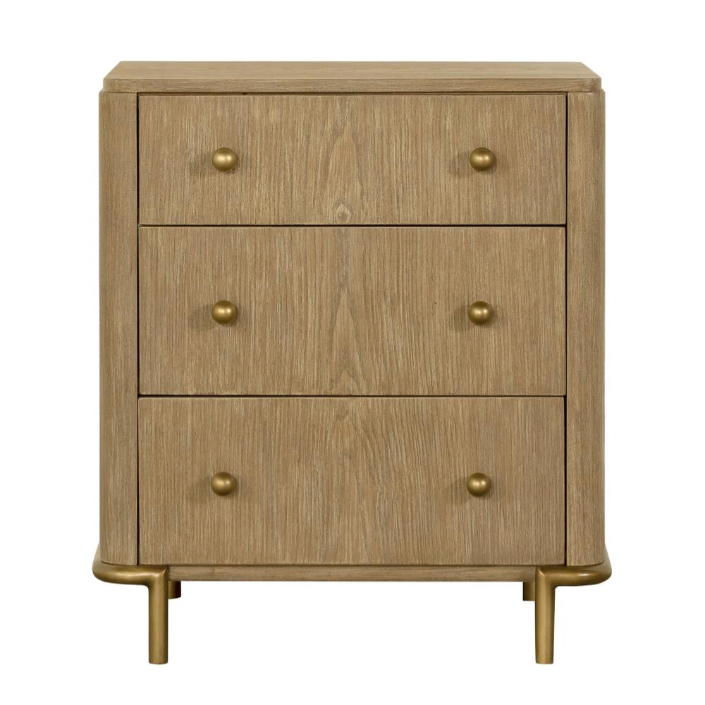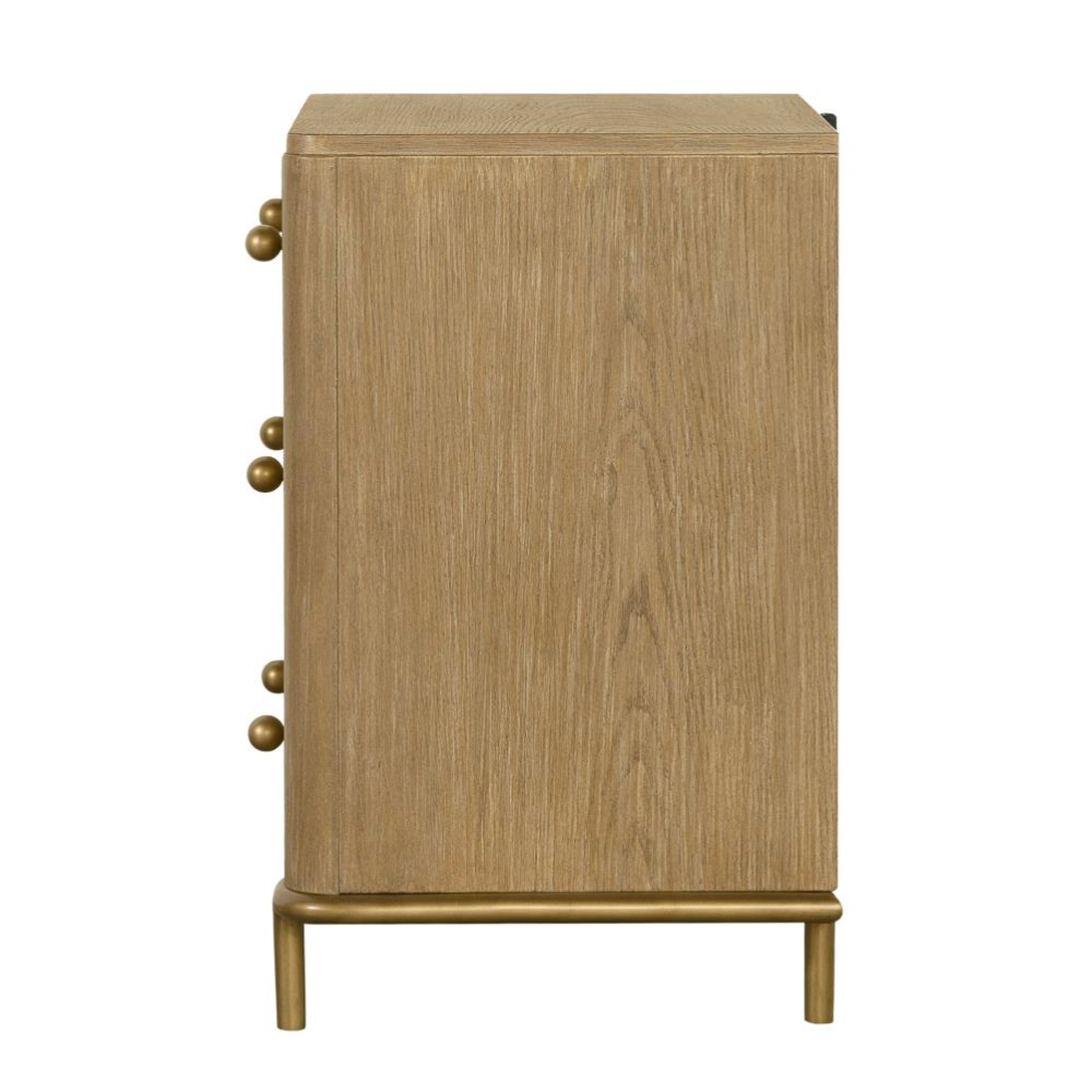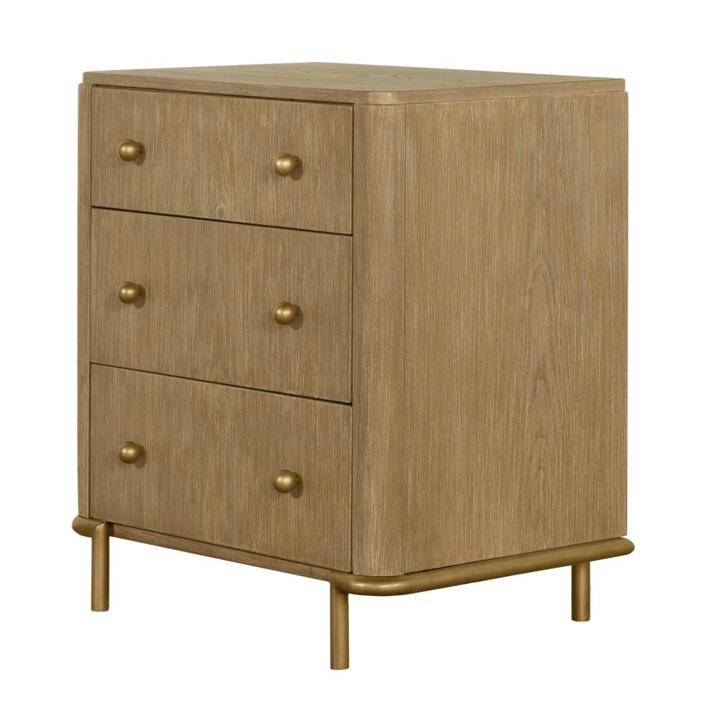 Retro charm meets modern convenience in this mid-century inspired three-drawer nightstand. A wire-brushed sand wash finish highlights its natural wood grain, while aged brass hardware and slender legs lend a touch of vintage elegance. Thoughtful features like a felt-lined top drawer and built-in dual USB ports make this piece as functional as it is stylish—perfect for bedrooms that blend organic textures with refined details.