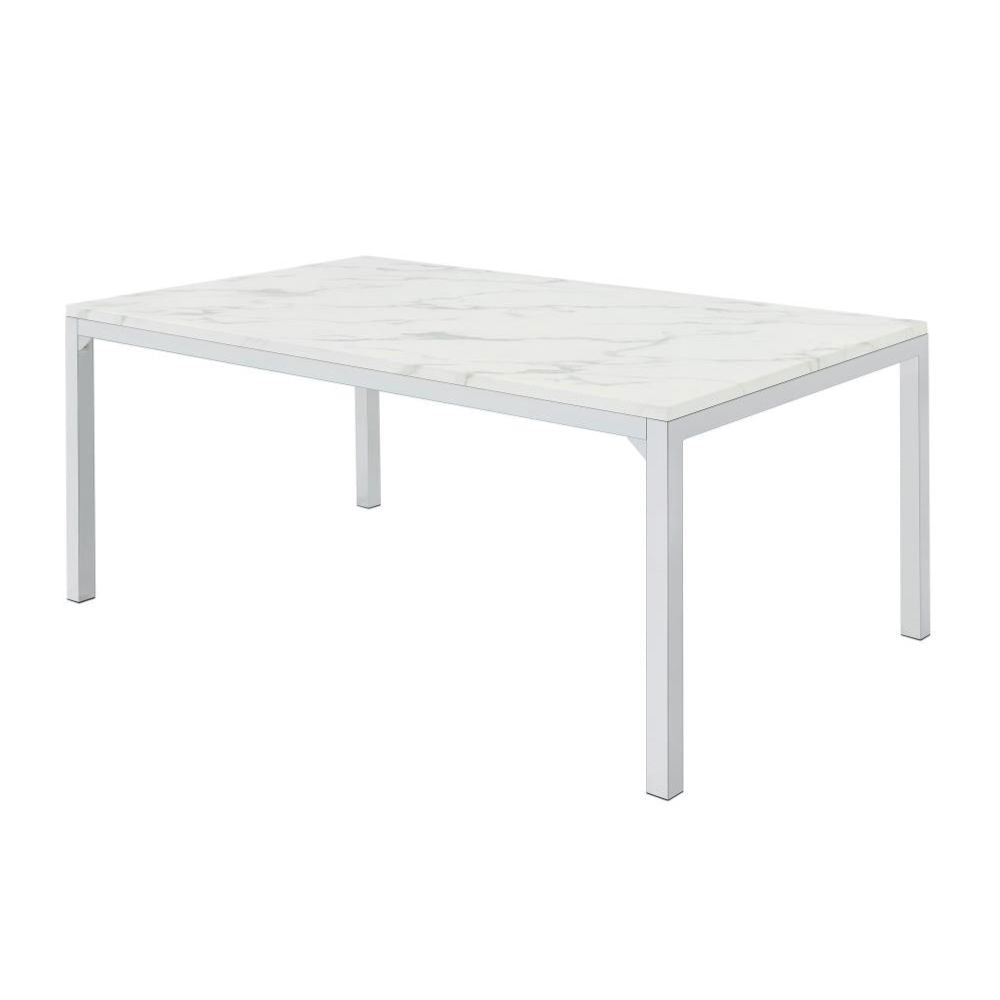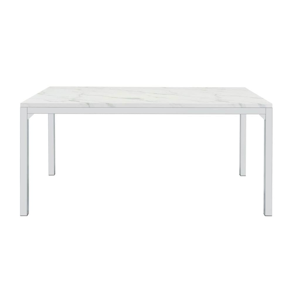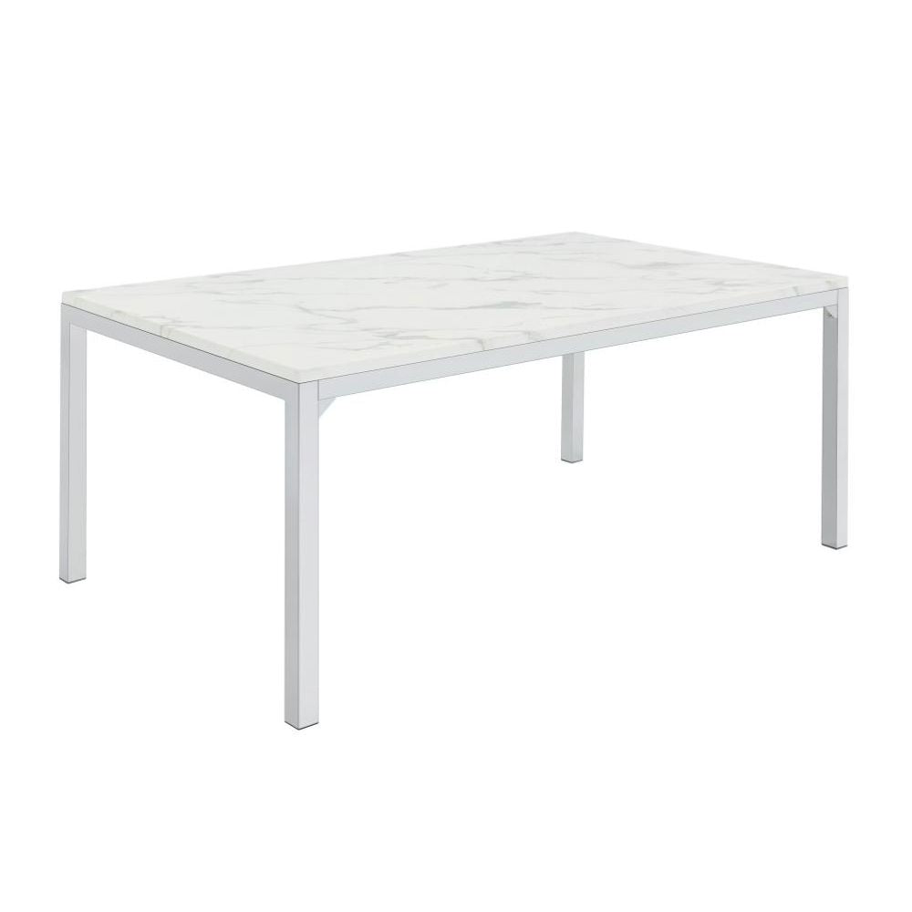 Dress up a dining room with striking, modern opulence. This gorgeous, contemporary dining table flaunts a smooth, white, marble top for a luxurious design that's sure to impress. The table base is made with top-quality metal in a gleaming chrome finish that shines in the light. From everyday dinners to elaborate feasts, the rectangular surface provides all the space you need for family dining enjoyment. Surround this modern table with your favorite chairs to complete a formal dining room in style.