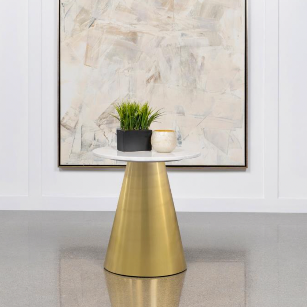 - Sculptural Pedestal Base: Gleaming gold metal base offers a modern, radiant touch
