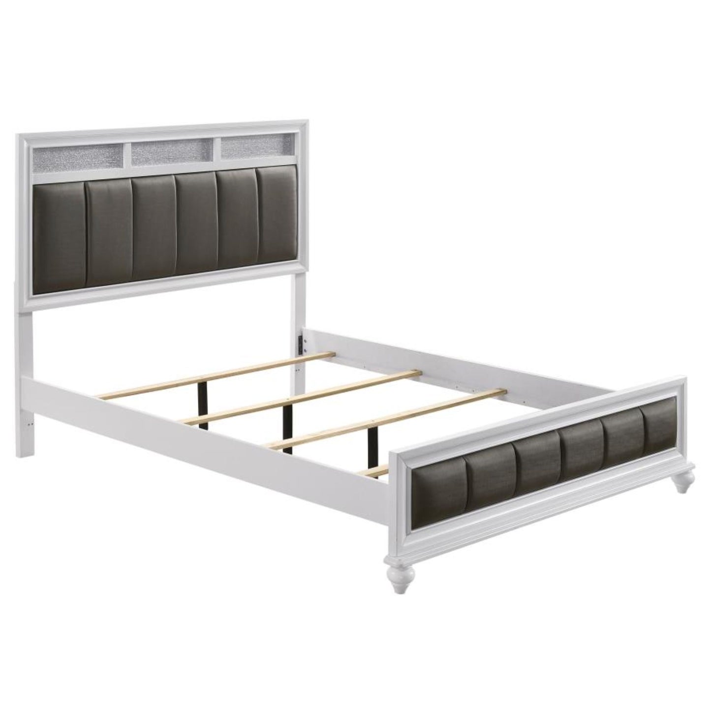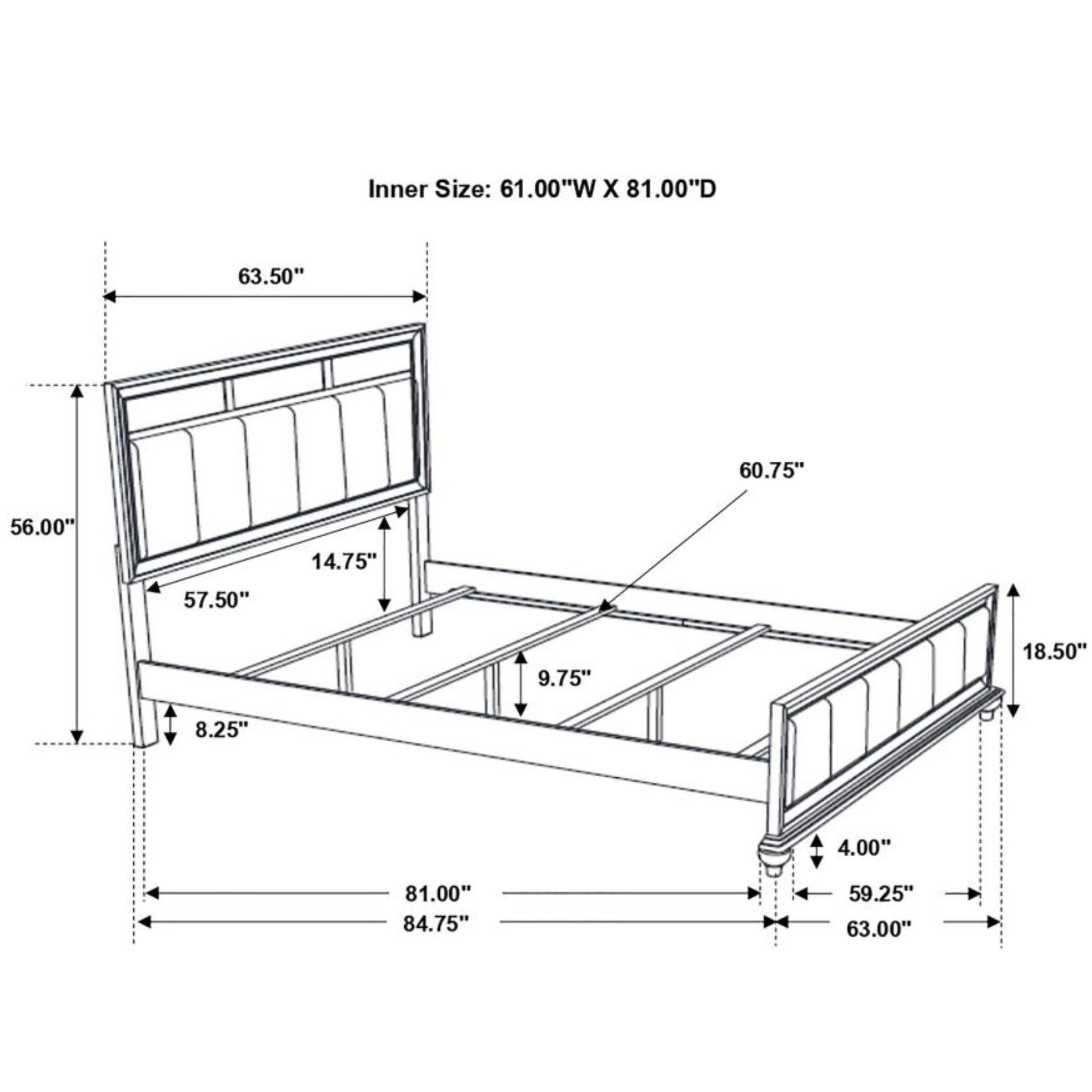 - Metallic Leatherette Upholstery: The bed features metallic leatherette-padded upholstery on the imposing headboard and low footboard, enhancing its opulent look.