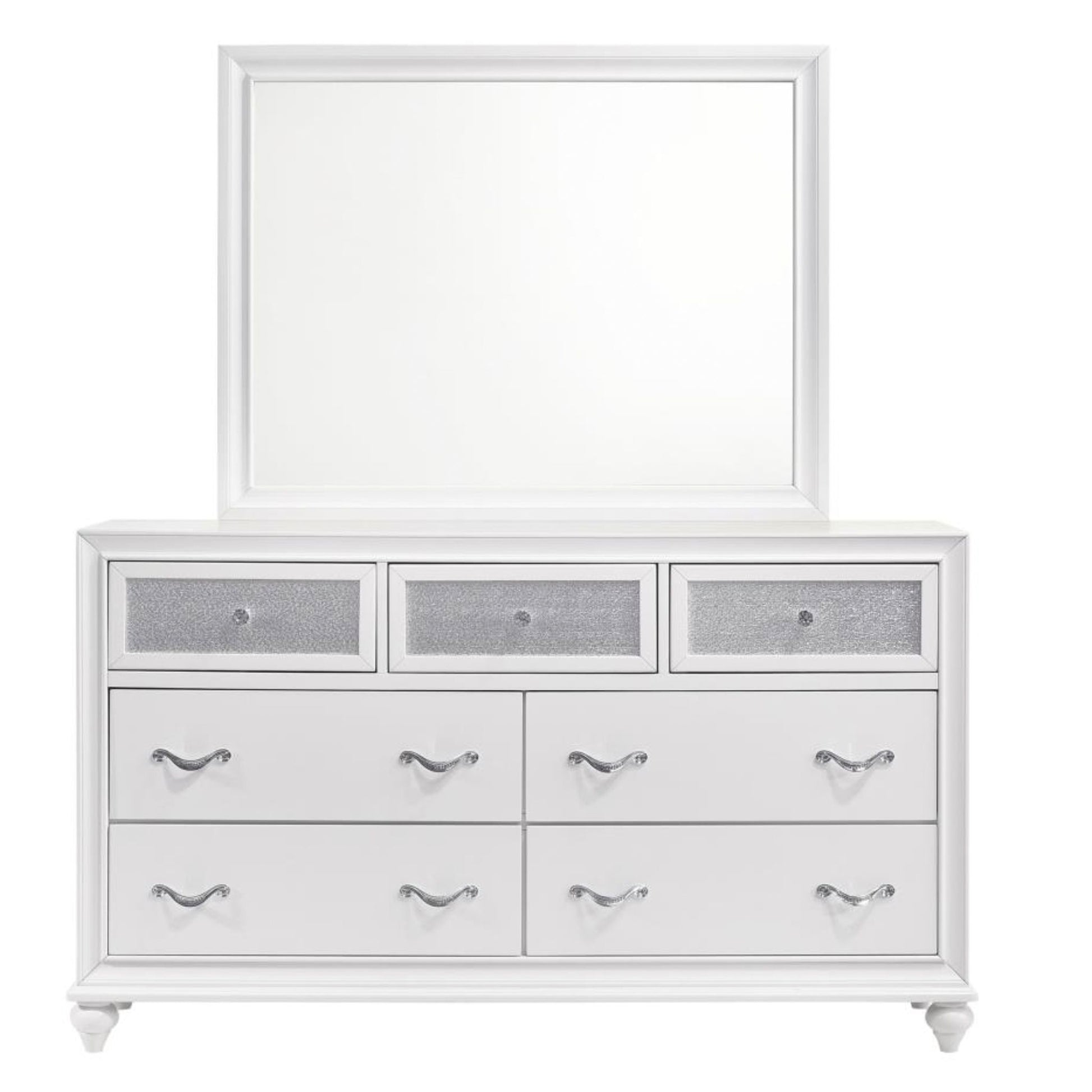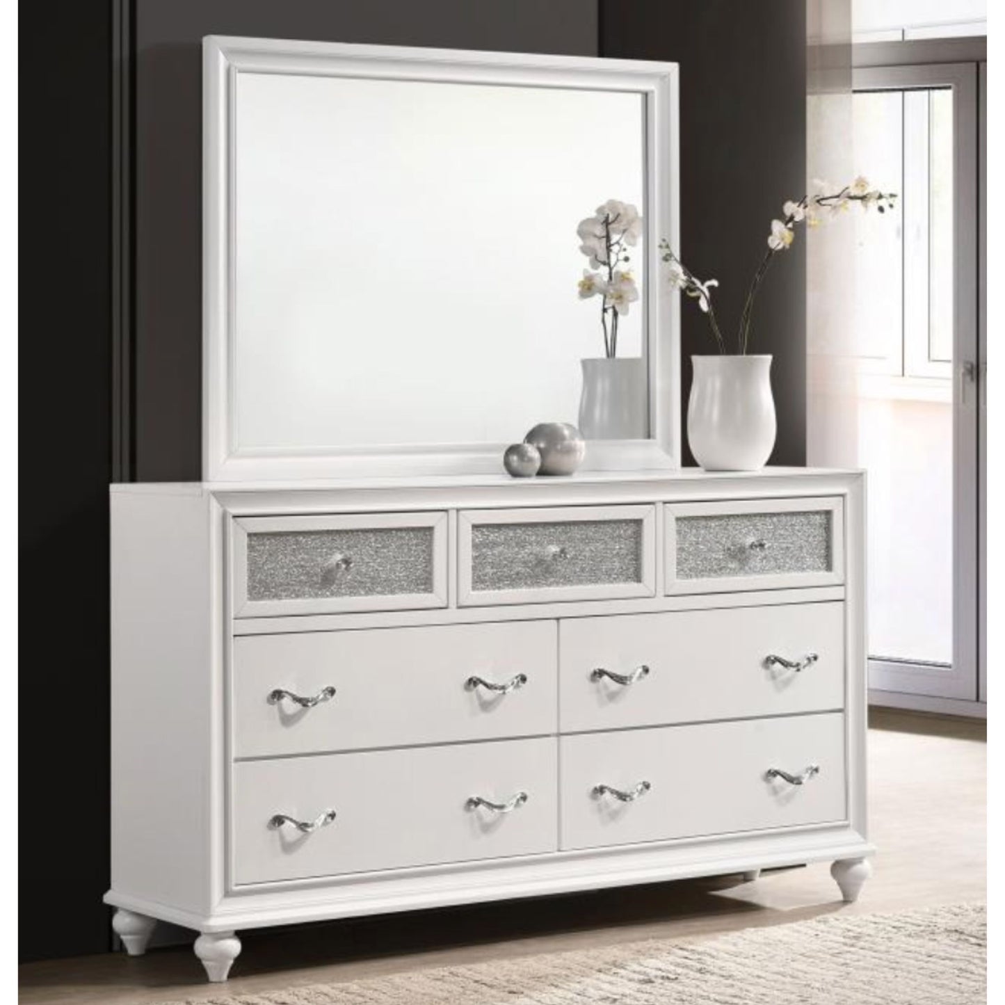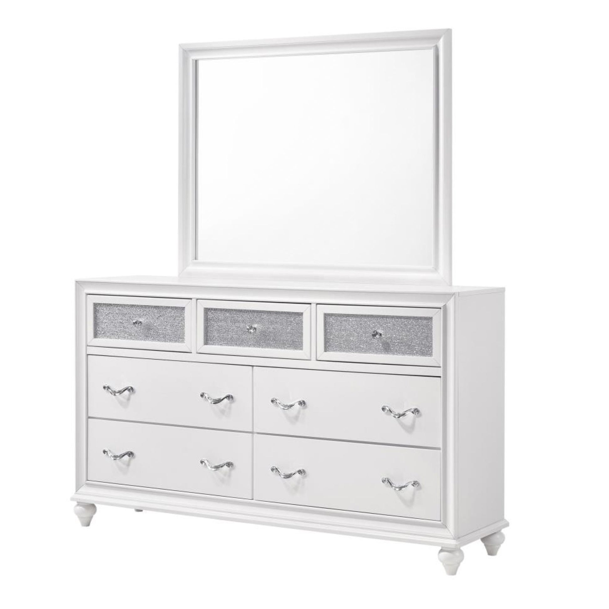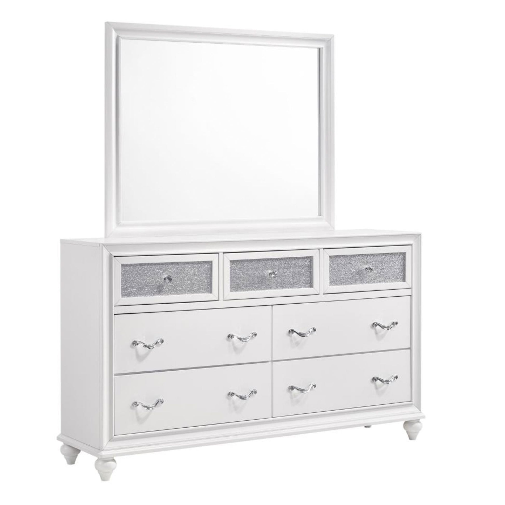 Elevate your space to new heights of glamour with our modern dresser and matching rectangular mirror set. The dresser's top drawer fronts are adorned with dazzling sparkling acrylic panels, while faceted crystal hardware enhances its luxurious appeal. With dainty turned feet adding a classic touch, this glamorous design is available in options of black or white finishes to suit any decor. Paired with the beveled wooden frame mirror, finished in crisp white, this set offers a light and airy complement to the dresser, bringing elegance and balance to any bedroom.