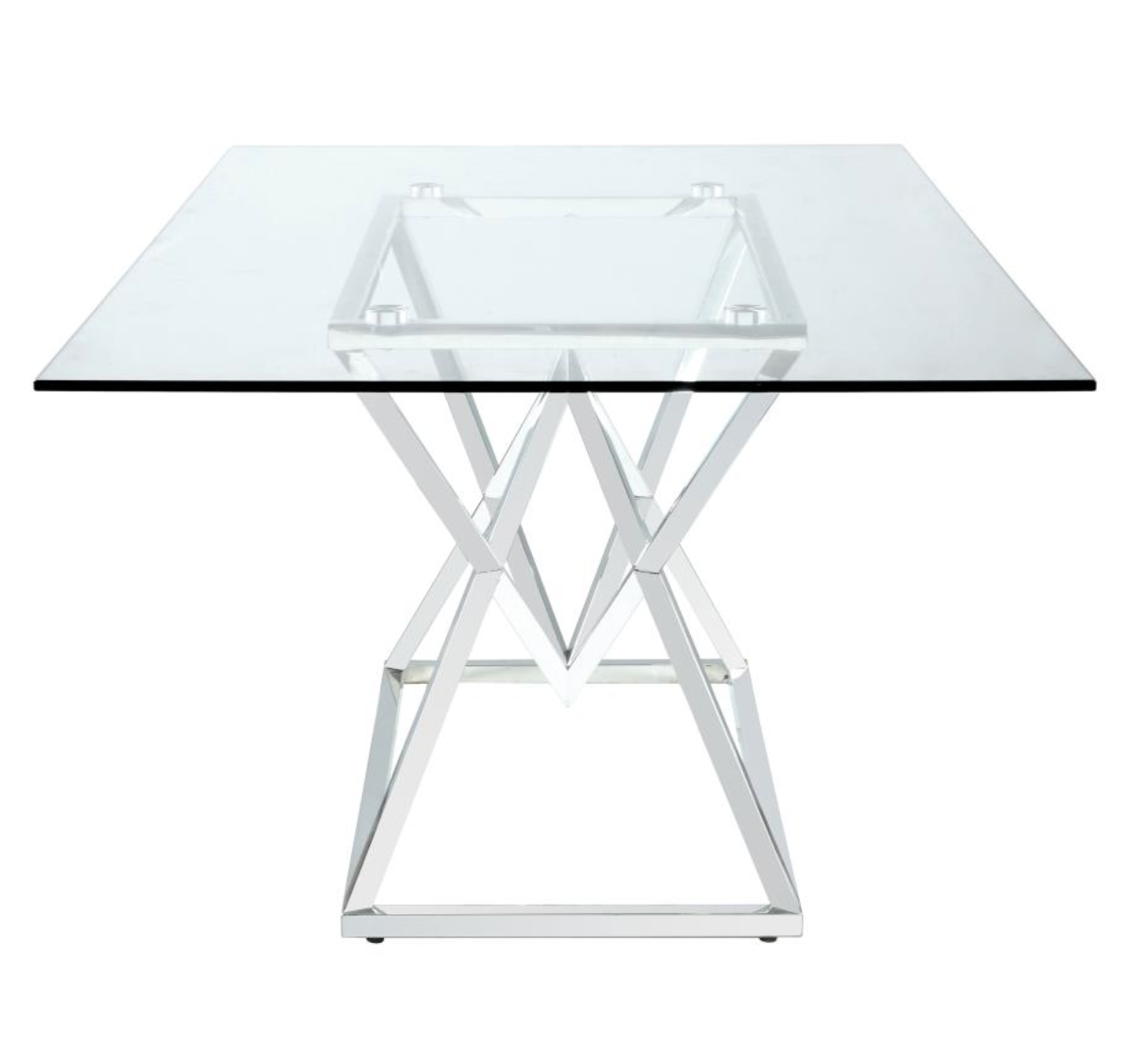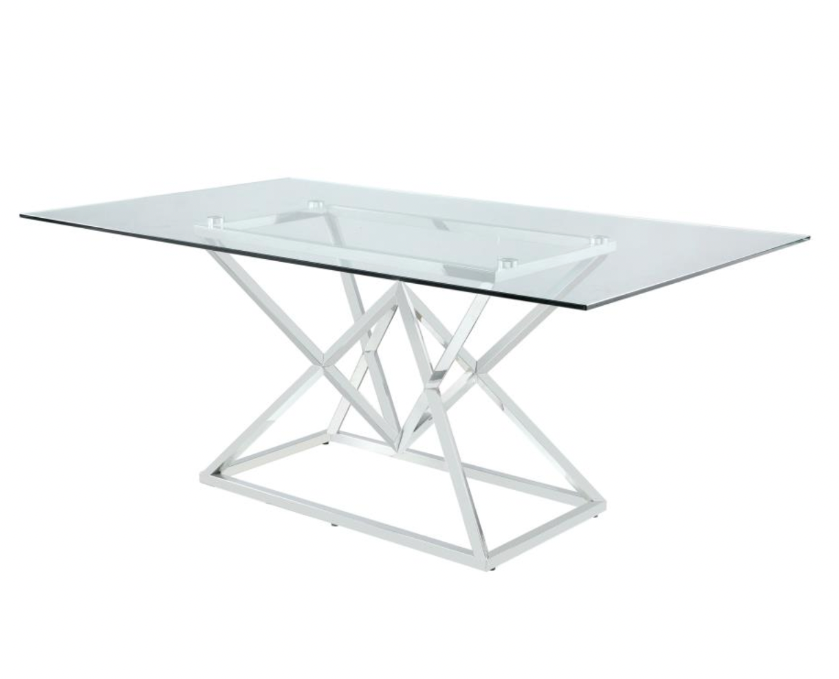 - Angular Geometric Base: The table boasts an angular, geometric base with a shiny chrome finish, adding a touch of Art Deco flair and modern sophistication to your dining area.