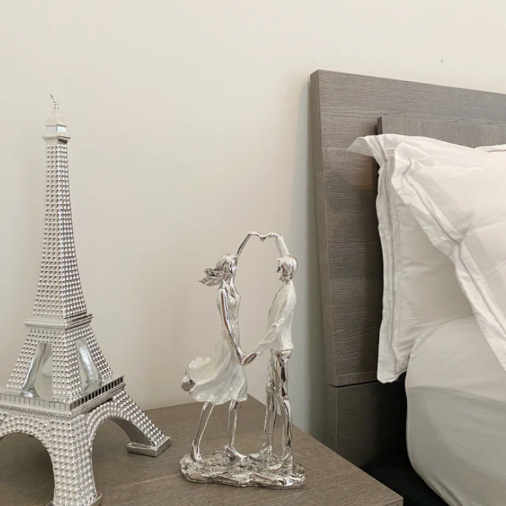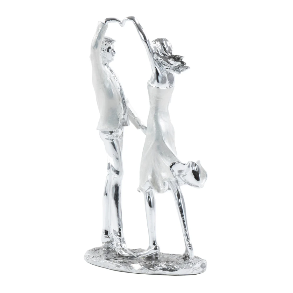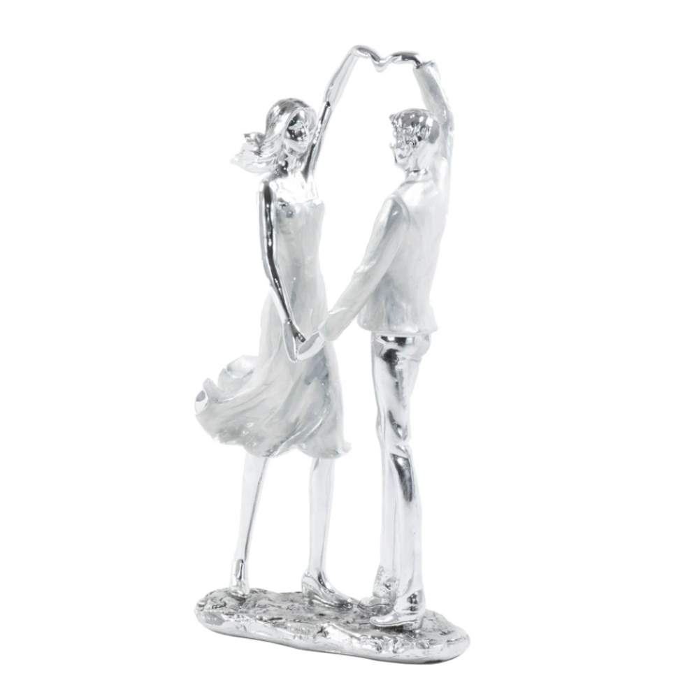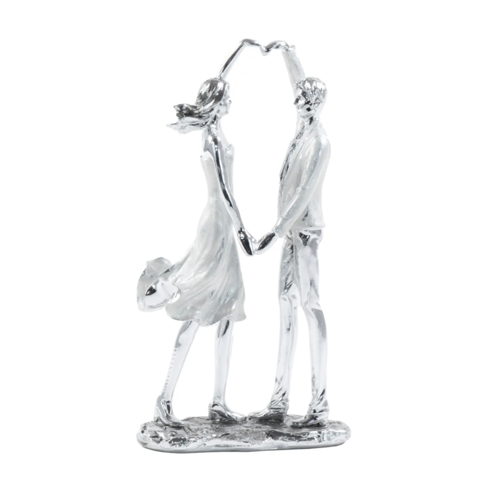 True love stories exist, and this contemporary couple's sculpture captures their essence beautifully. The unique design features a male figure forming a heart shape with his arms around the female figure, symbolizing the bond of love. Crafted from high-quality polystone material, this stunning piece is finished in a sleek gloss silver, making it the perfect accent for any side or console table. Add a touch of romance and modern art to your home decor with this elegant sculpture.