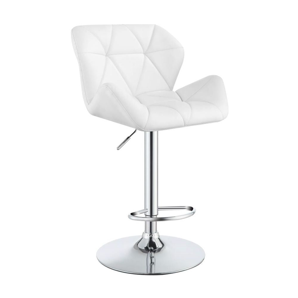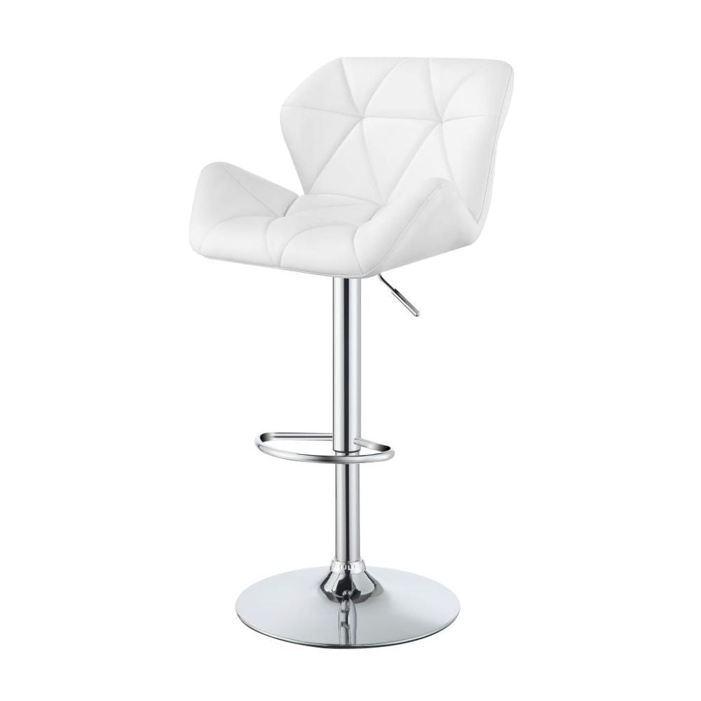 Enhance the look and feel of a breakfast bar with casual comfort and understated glamour. This stylish white bar stool blends appealingly with a variety of decor and color schemes. A simple, round footrest provides an extra level of comfy relaxation. Elegant tufting enhances the modern design of its plush, cozy seat, while a gleaming chrome finish base adds a pleasing touch of polish. Its height is conveniently adjustable, opening up a variety of placement options to meet your seating needs.