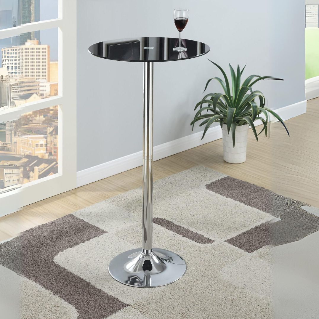 Elevate your dining or socializing experience with our Black Top Bar Table. Its black tempered glass top, sturdy chrome base, contemporary design, space-saving features, ease of cleaning, versatility, and durability make it a perfect addition to your home. Whether you're creating a cozy dining nook or upgrading your entertainment area, this bar table combines style and function to enhance your living space. Enjoy meals, drinks, and conversations in style with this sophisticated and modern bar table.