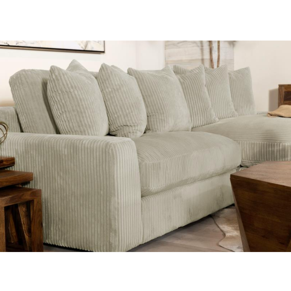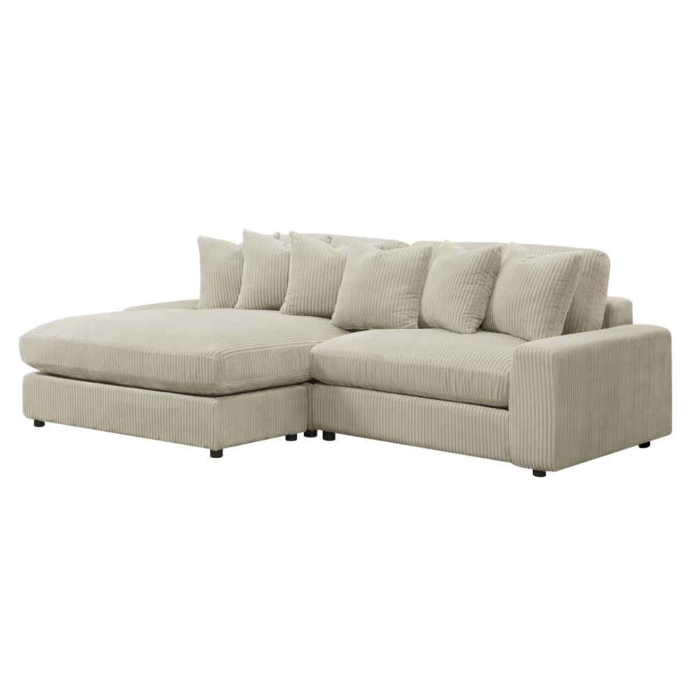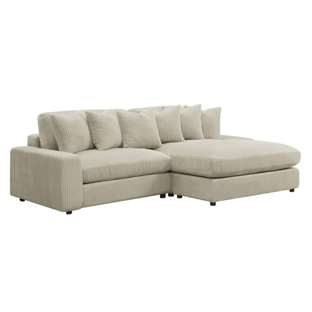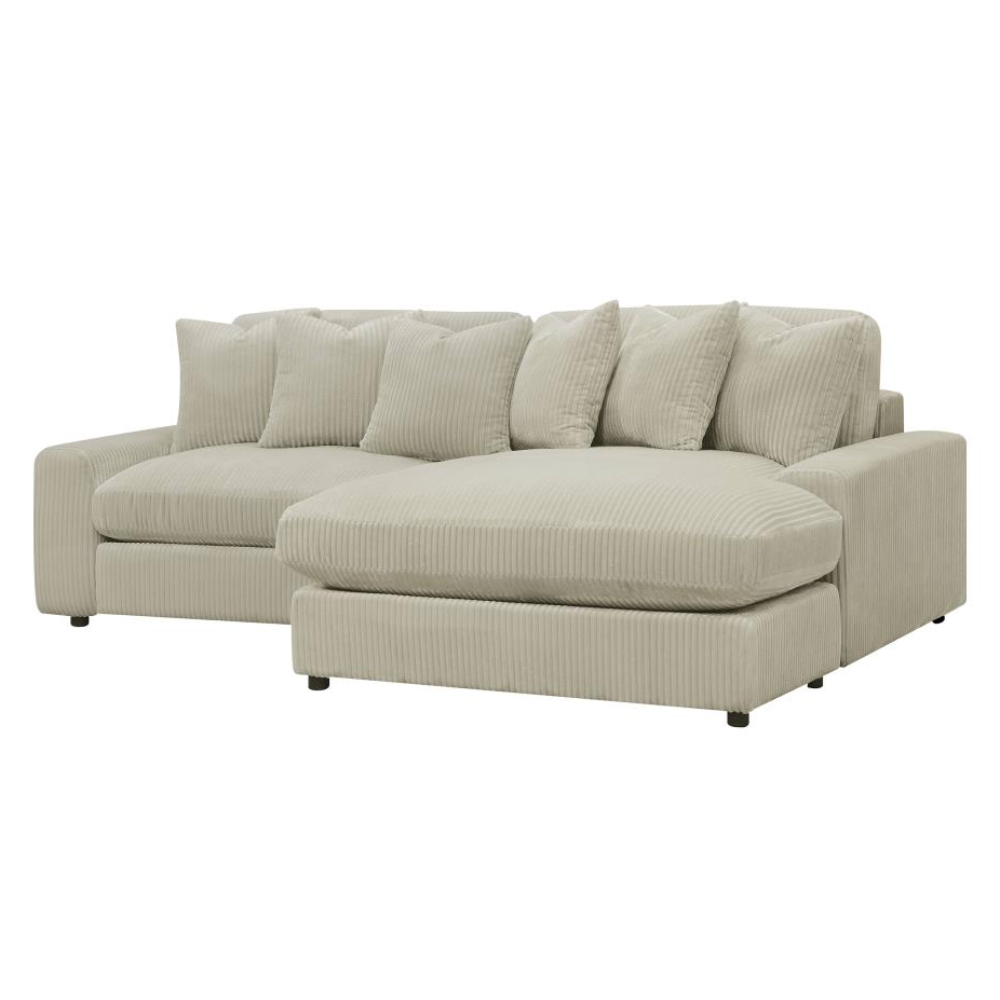 Bring retro-inspired elegance to your contemporary seating environment with this modern reversible sofa and oversized chaise. Upholstered in vintage-like wide corduroy fabric, it offers a soft texture in elegant fog or sand tones. The two-piece design features reversible cushions, wide track arms, black legs, and non-slip grips for stability. Experience endless comfort with premium down-like filled cushions and pillows.