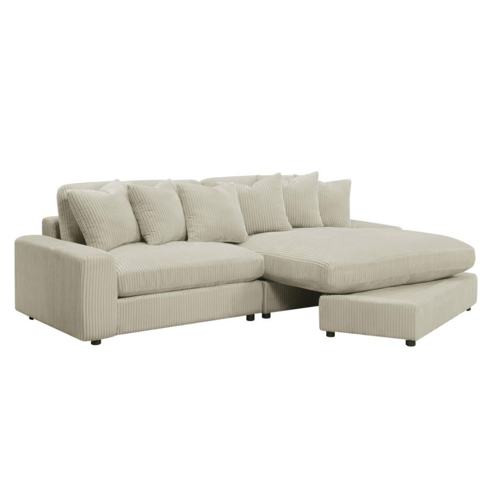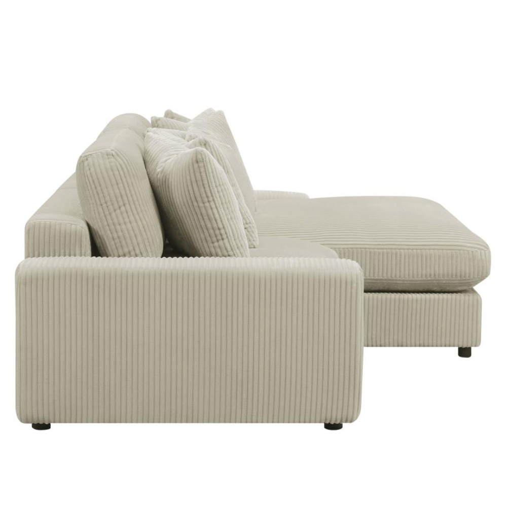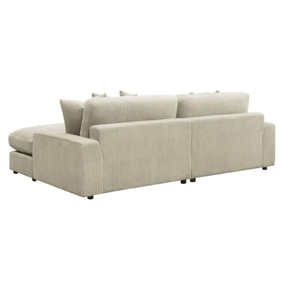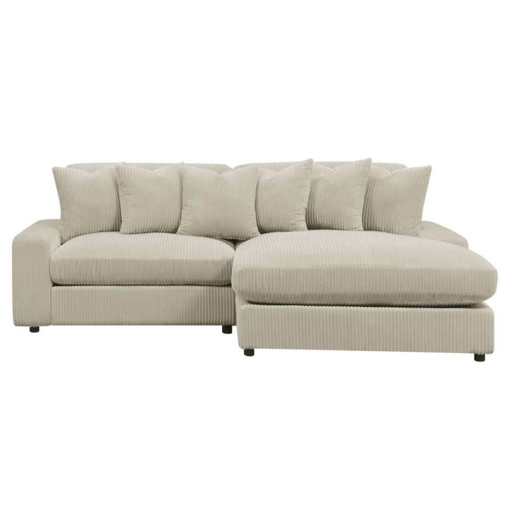 Bring retro-inspired elegance to your contemporary seating environment with this modern reversible sofa and oversized chaise. Upholstered in vintage-like wide corduroy fabric, it offers a soft texture in elegant fog or sand tones. The two-piece design features reversible cushions, wide track arms, black legs, and non-slip grips for stability. Experience endless comfort with premium down-like filled cushions and pillows.