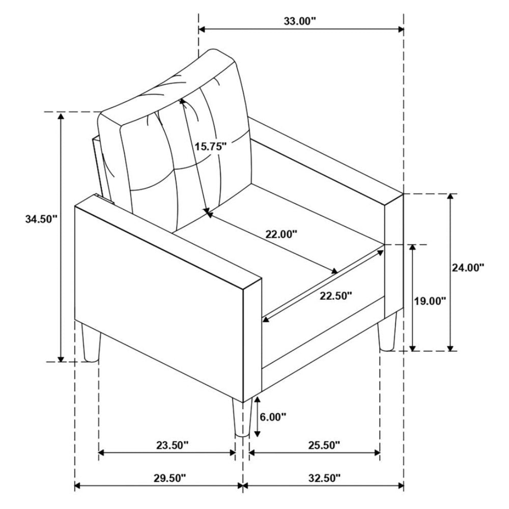 Ideal for studio apartments or small rooms, this chair boasts a perfect small-scale design. Its classic track arm and self-welt detailing highlight the superior tailoring. The grid-tufted boxed back cushions and pocket coil spring cushion construction ensure comfort and support. With brown tall round tapered legs, it offers a sturdy foundation. Assembly is a breeze, and its solution-dyed performance fabric is easy to clean.