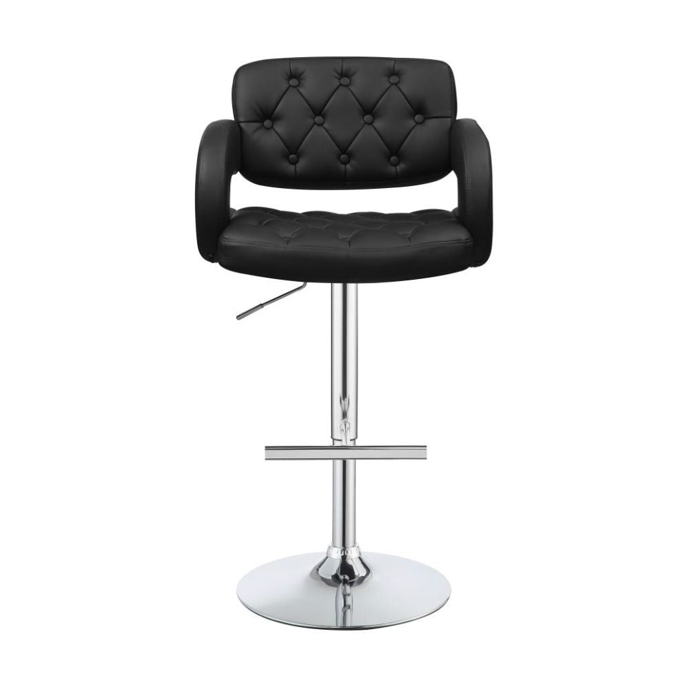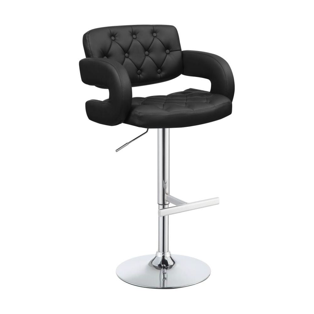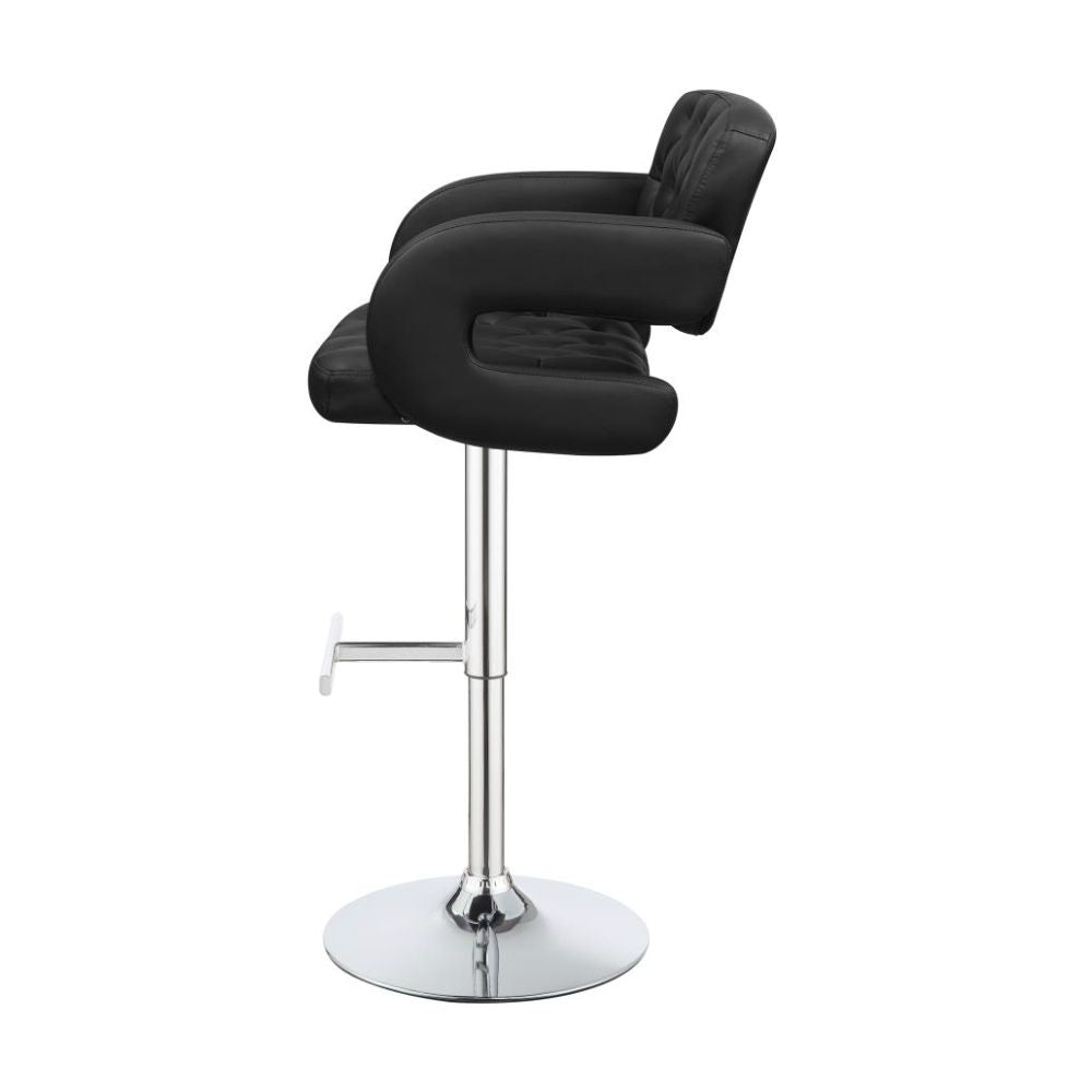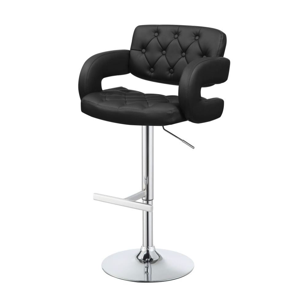 Expressive and interesting design elements team up to deliver a fun look. Make a modern or transitional space flush with style. This bar stool borrows from a retro theme with a hint of barbershop charm. An ergonomically positive seat, back, and arms encased in black upholstery match with virtually any palette. A bright, shiny chrome base with a bar footrest looks sleek and dynamic, and adjustable seat heights accommodate a bar table or counter.