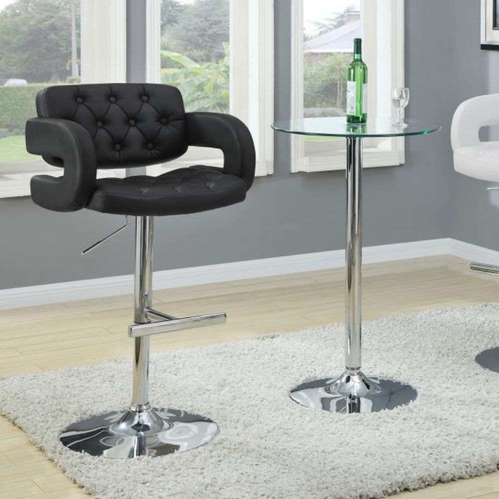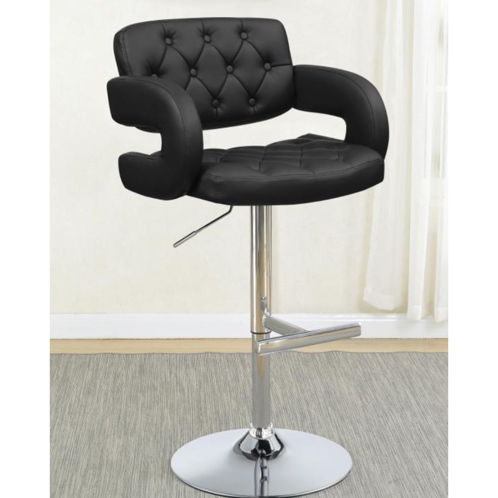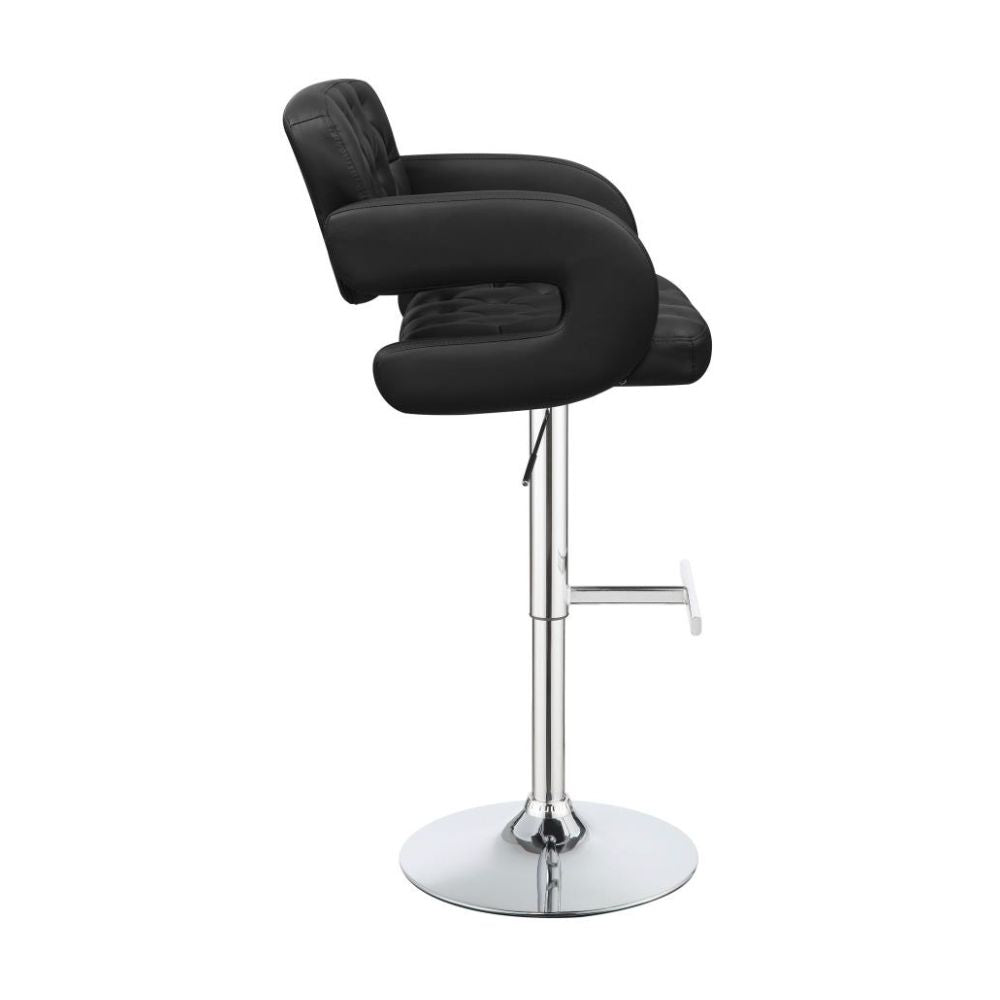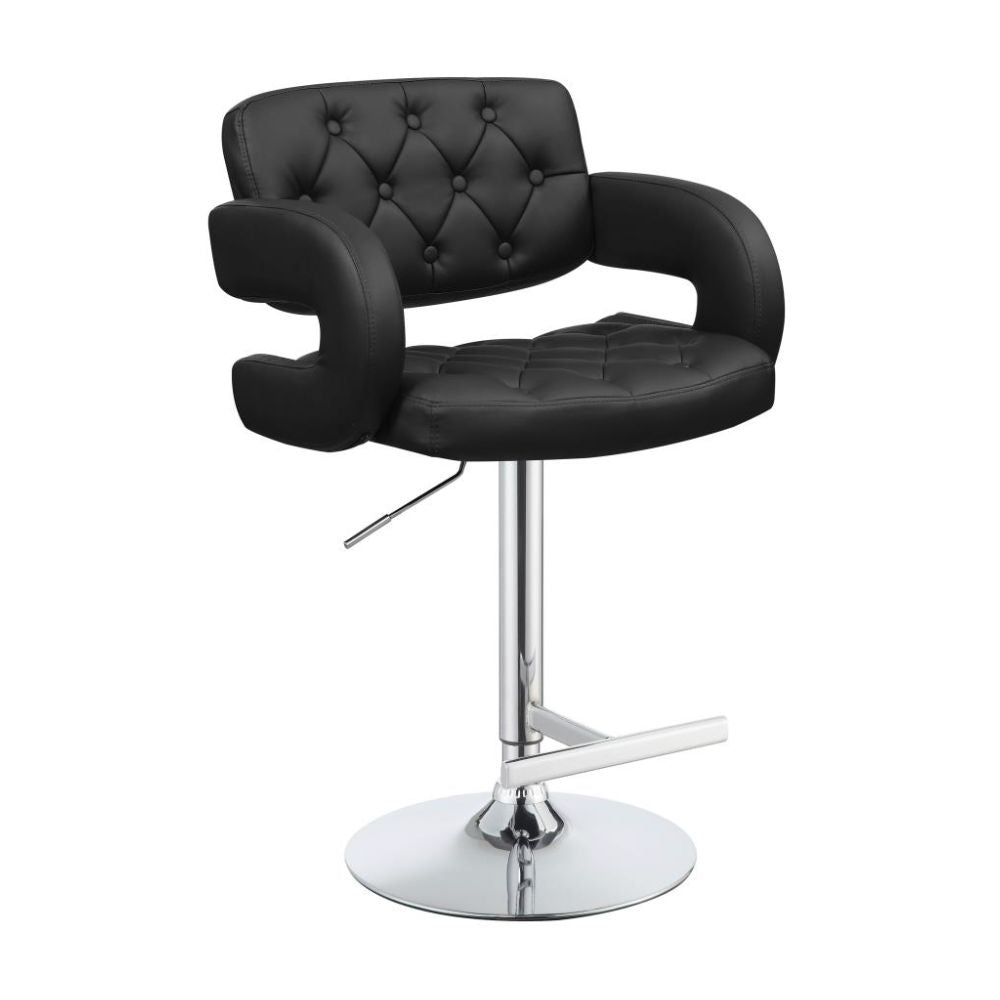 Expressive and interesting design elements team up to deliver a fun look. Make a modern or transitional space flush with style. This bar stool borrows from a retro theme with a hint of barbershop charm. An ergonomically positive seat, back, and arms encased in black upholstery match with virtually any palette. A bright, shiny chrome base with a bar footrest looks sleek and dynamic, and adjustable seat heights accommodate a bar table or counter.