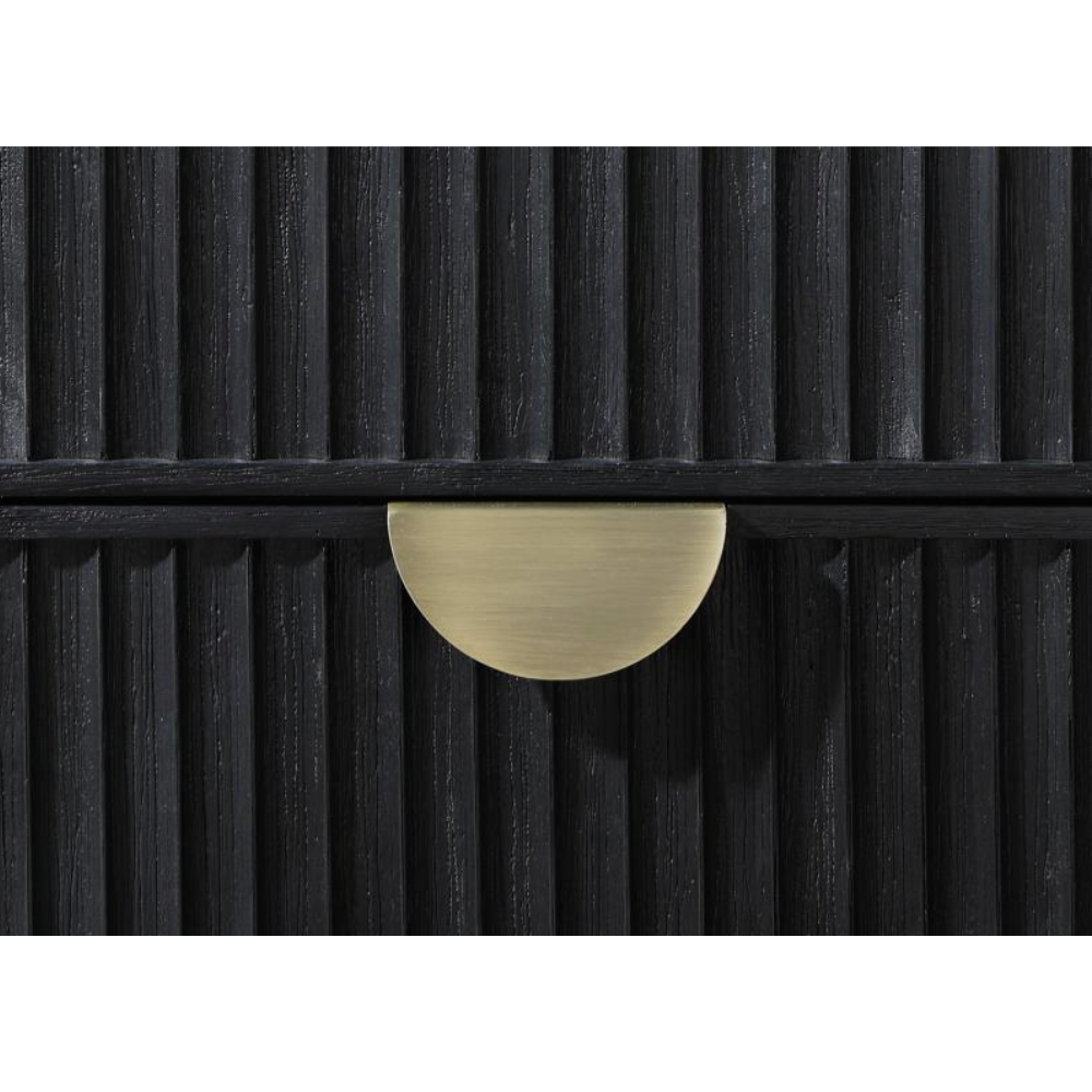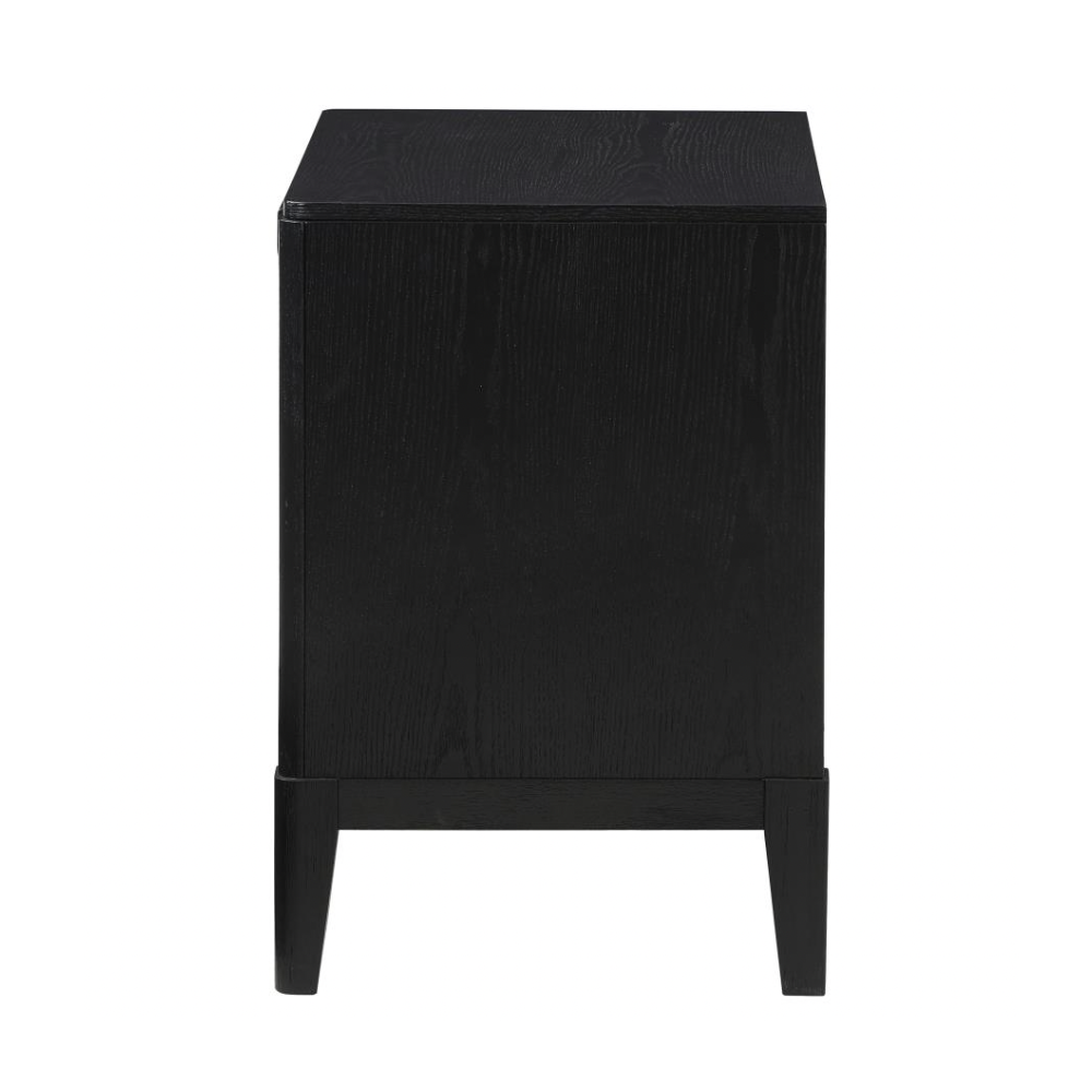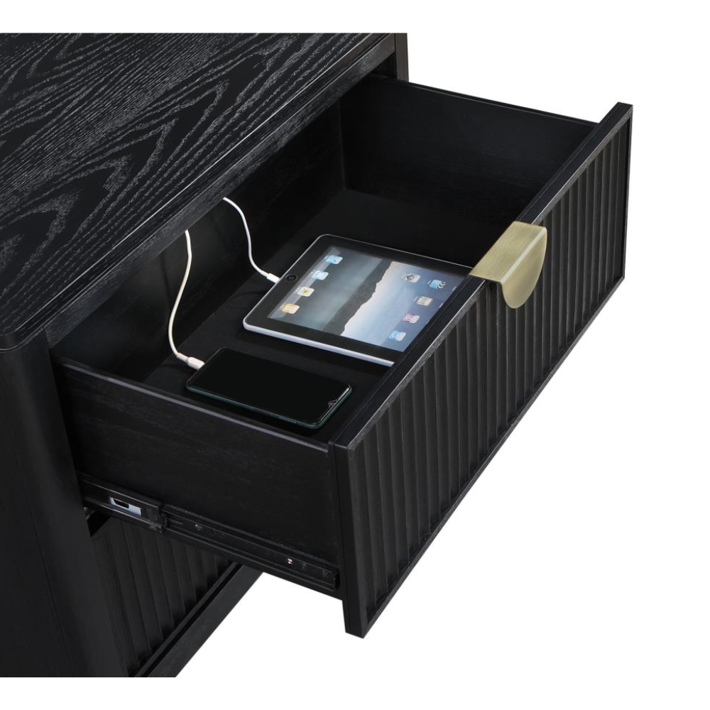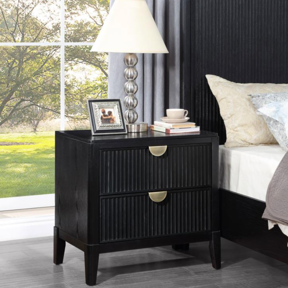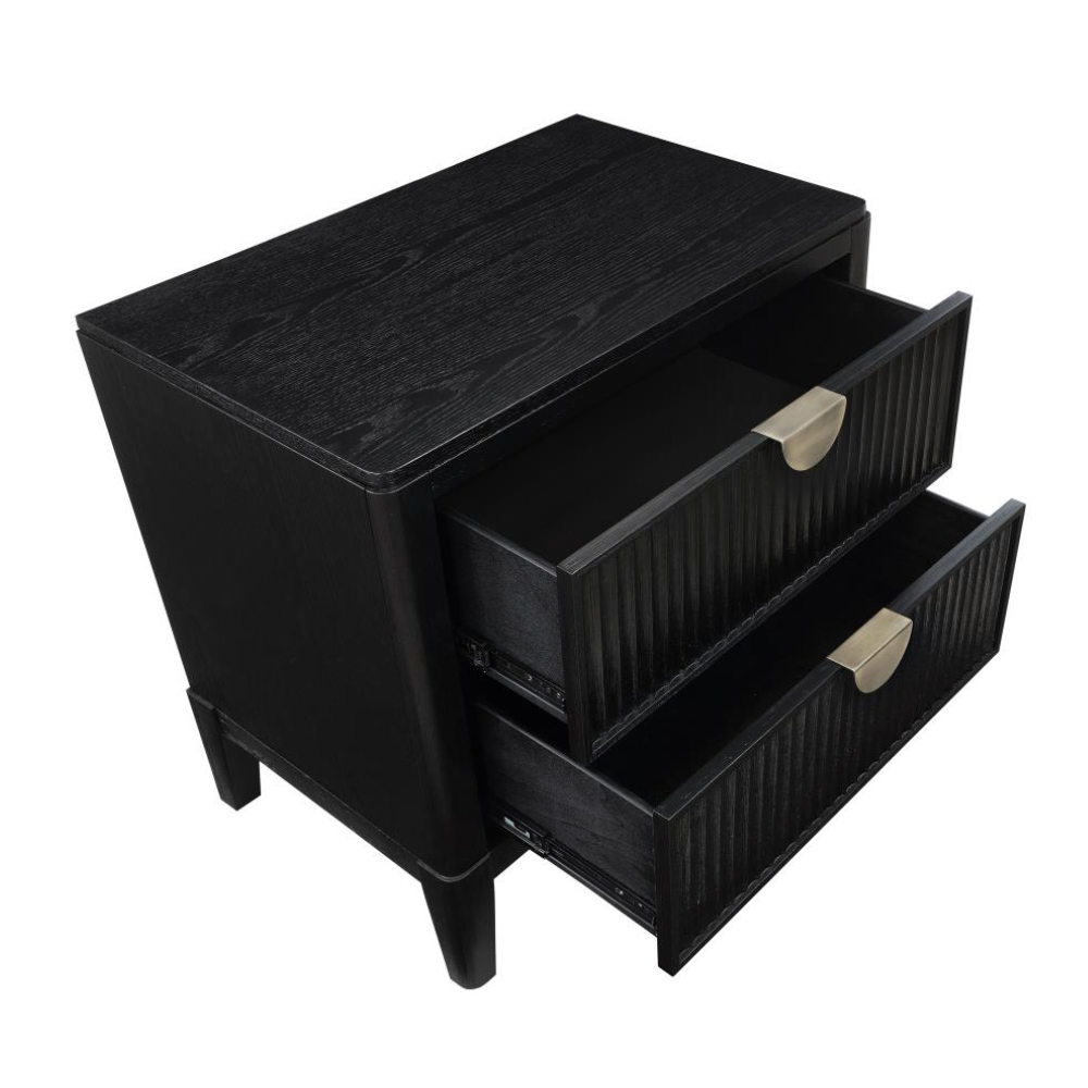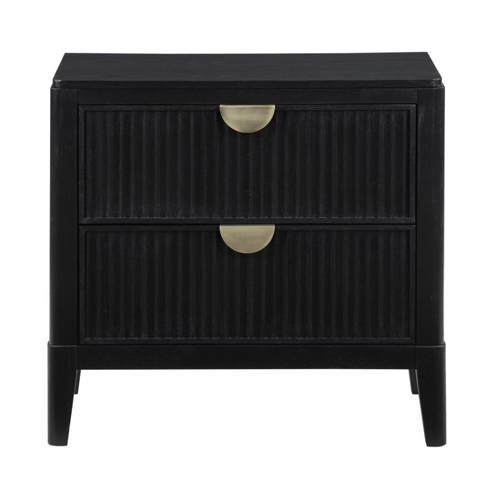 Enhance your sophisticated bedroom with this modern two-drawer nightstand. Combining functionality with style, it features a wire-brushed black finish for added depth and texture. Fluted drawer fronts add a touch of dimensionality, while demi-lune golden metal pulls offer a chic contrast. The top drawer is felt-lined to protect delicate items, making it both practical and elegant. Tapered legs provide stability, completing the refined look of this bedside essential.