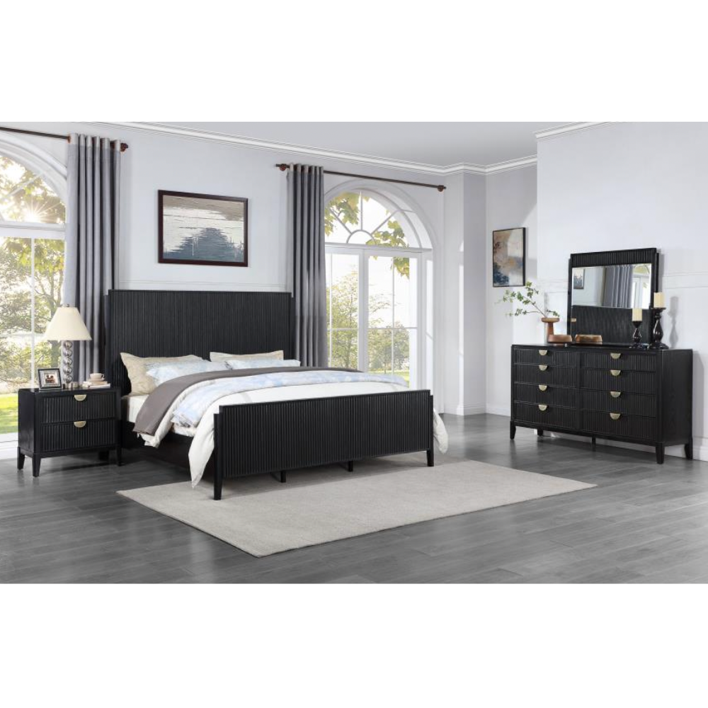 Create a sophisticated bedroom retreat with this four-piece modern bedroom set in a rich black finish. Featuring wire brushing for texture, the set includes fluted details that elevate its contemporary appeal. The bed boasts an open silhouette with a tall headboard and low footboard, offering a centerpiece for your space. A two-drawer nightstand features a felt-lined top drawer for delicate items, while the dresser and mirror provide ample storage with eight drawers, including felt lining in the top two. Golden demi-lune handles add a refined finishing touch to this stylish ensemble.
