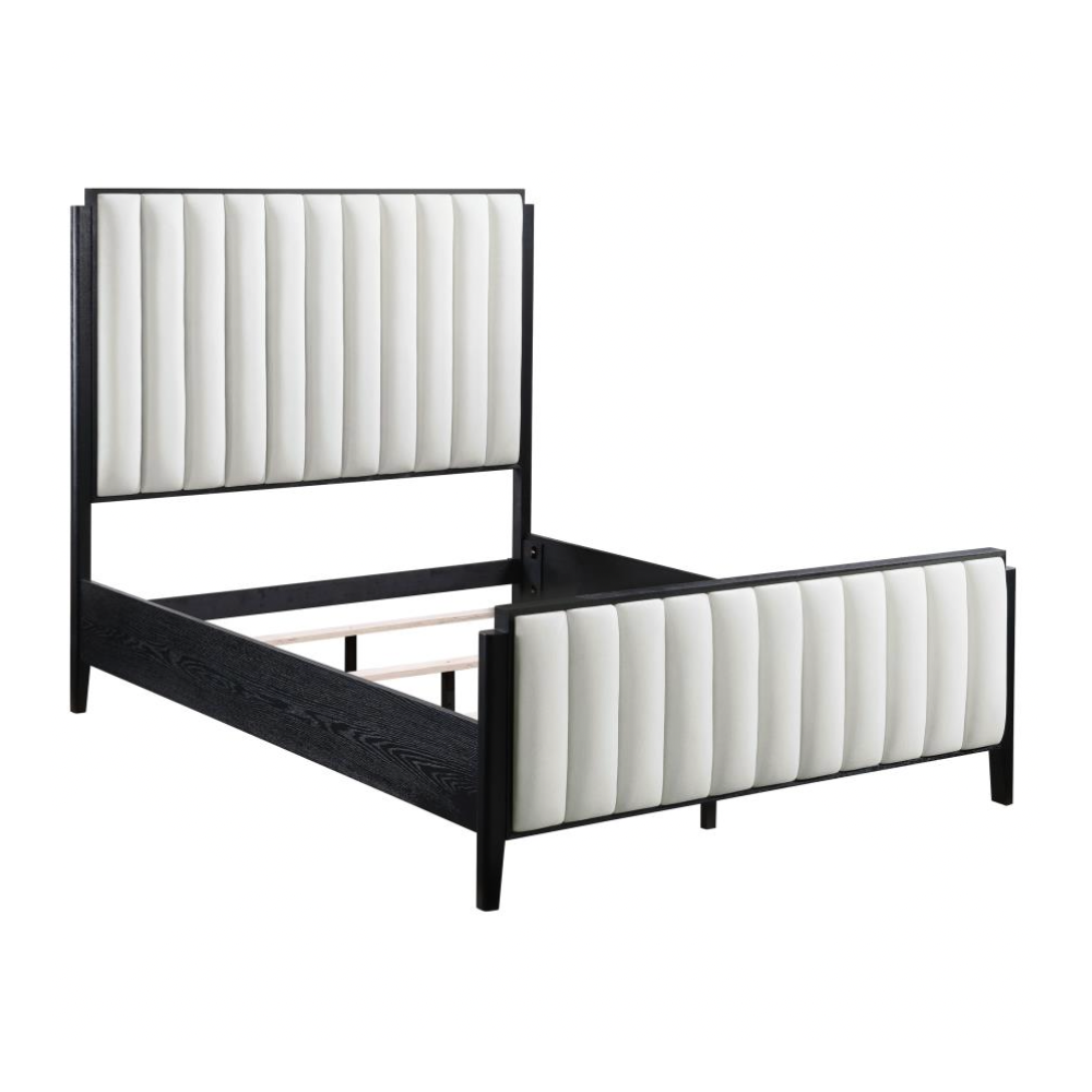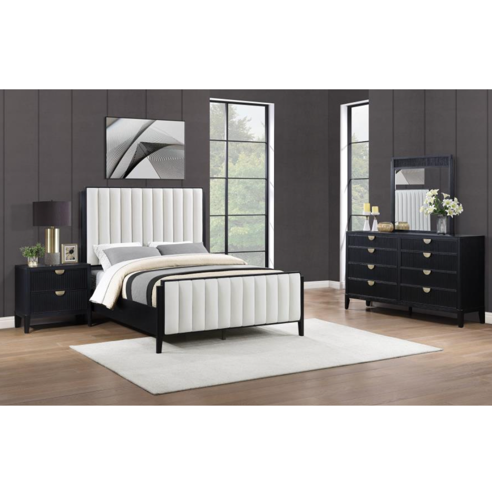 Transform your bedroom with the sleek sophistication of this four-piece modern bedroom set. Featuring a chic upholstered bed with vertical channel tufting in ivory, it becomes a stylish focal point. Fluted details and gold-tone demi-lune pulls add textural elegance to the coordinating nightstand and dresser, while the framed mirror atop the dresser adds depth and brightness. A black wood grain finish and tapered legs complete the set, combining contemporary design with timeless charm.