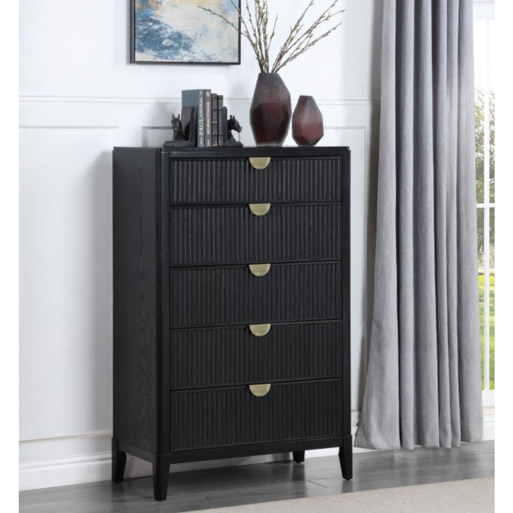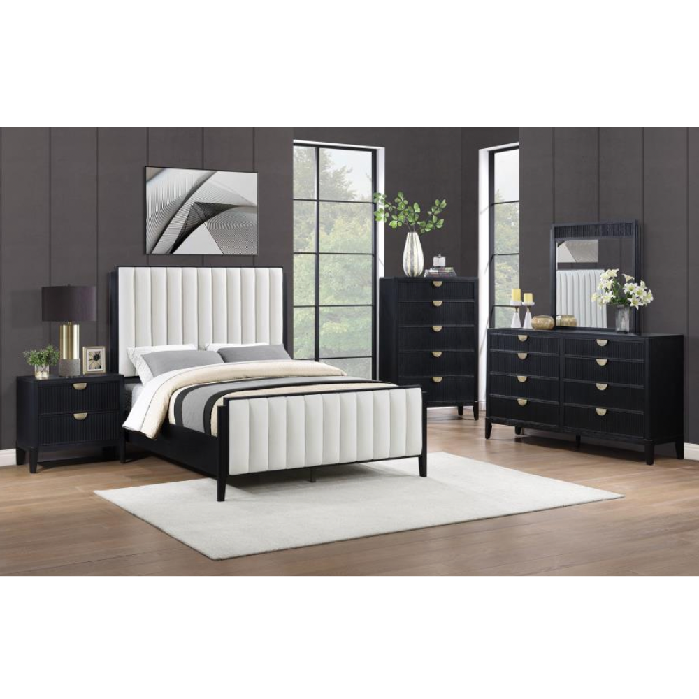 Create a luxurious retreat with this sophisticated five-piece modern bedroom set. Ivory upholstery and black finishes are accented with gleaming gold for a refined and elegant design. The upholstered bed features vertical channel tufting and a tall headboard for a striking yet airy profile. Fluted drawer fronts and demi-lune gold-tone pulls on the nightstand, dresser, and chest bring texture and glamour. A framed mirror atop the dresser completes the set, adding depth and functionality to your space.