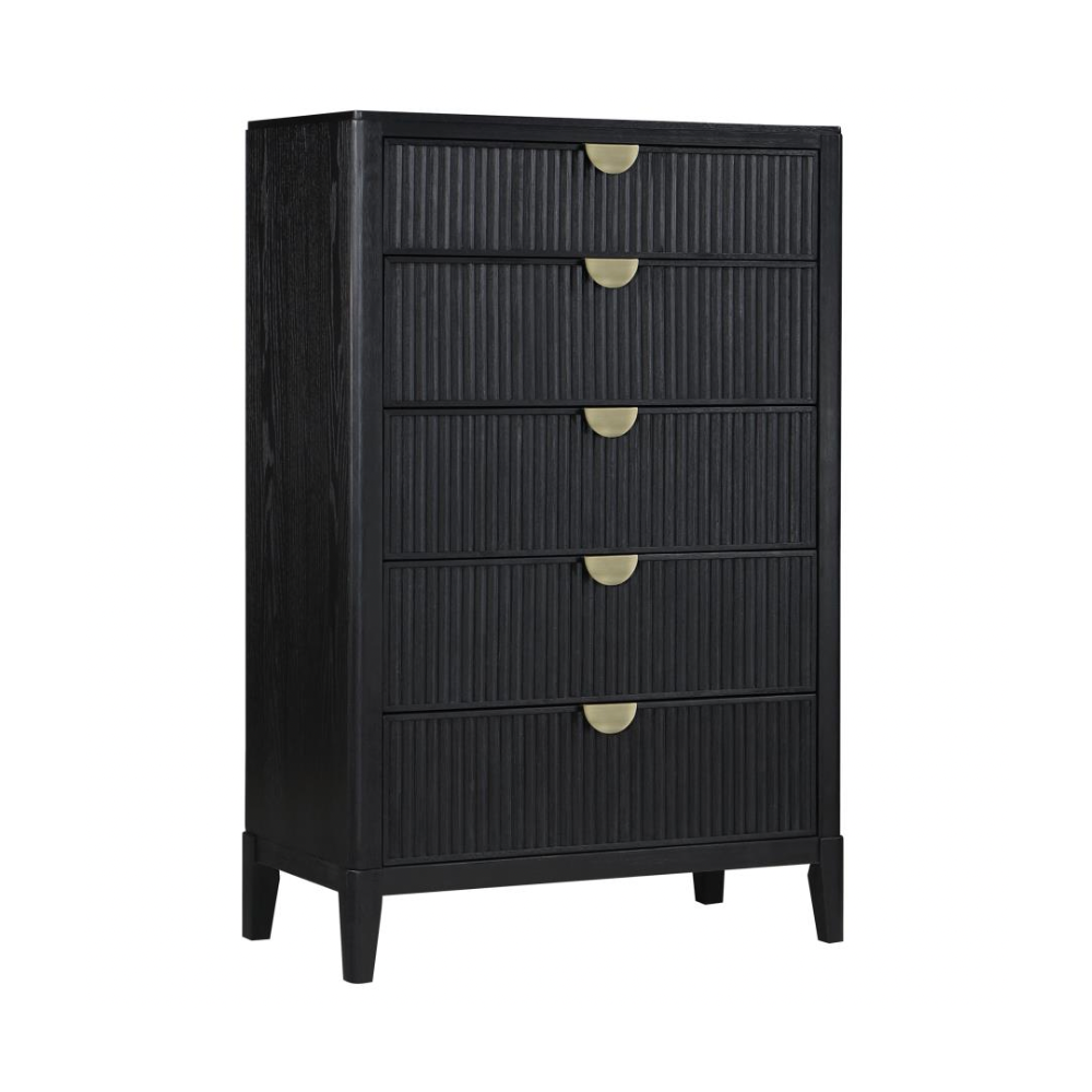- Refined Storage: Fluted drawer fronts and gold-tone demi-lune pulls elevate the nightstand, dresser, and chest.