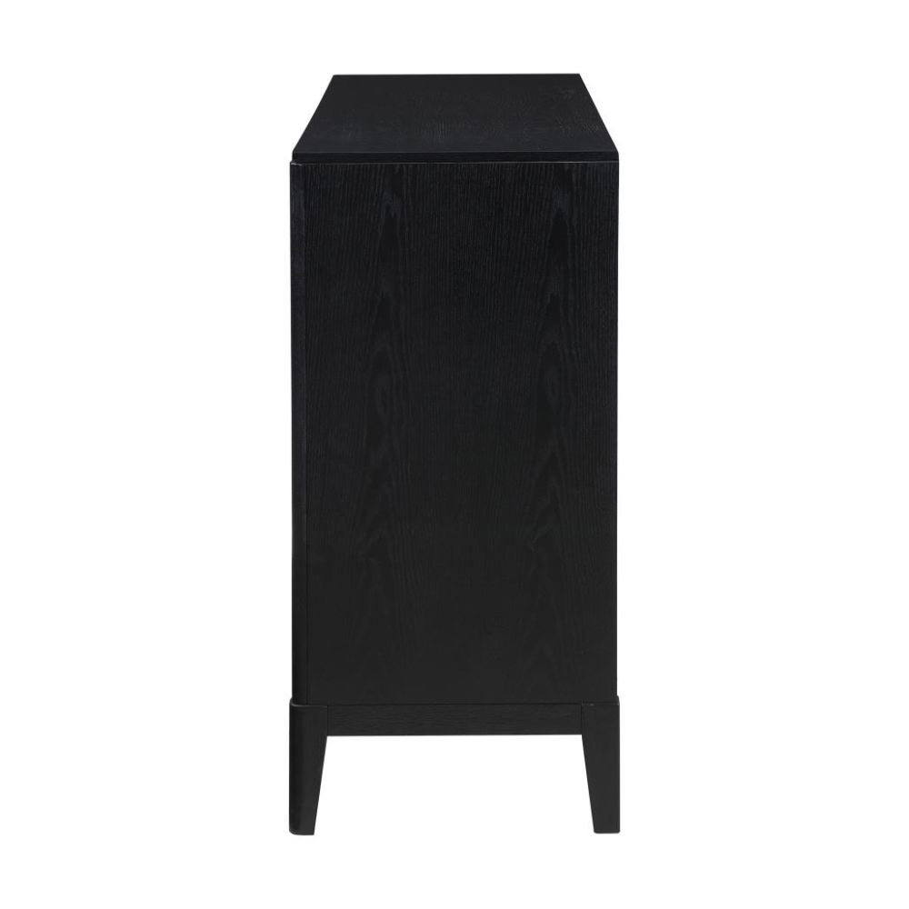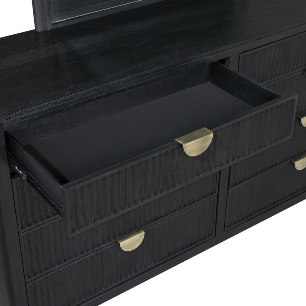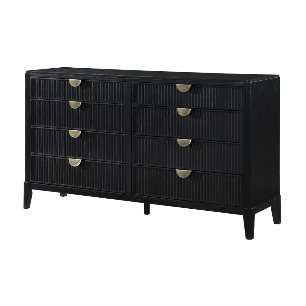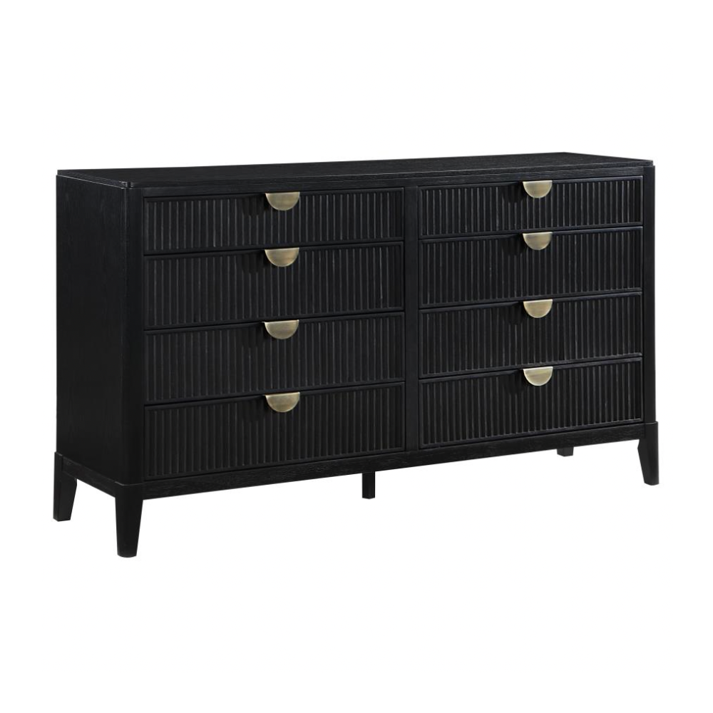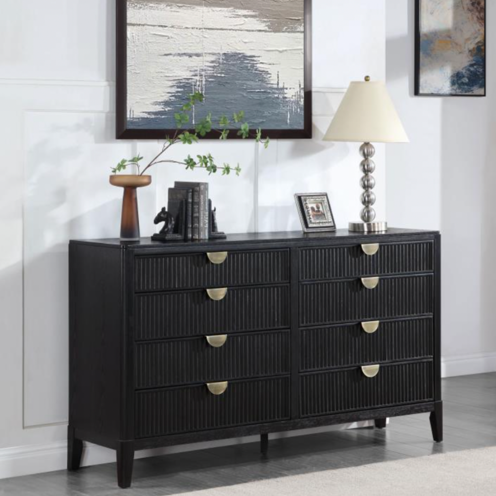 Elevate your bedroom with the sophistication of this modern eight-drawer dresser. Designed for style and functionality, it boasts a timeless black finish enhanced with wire brushing for subtle texture and depth. Fluted drawer fronts add movement and visual interest, while demi-lune golden metal pulls provide a warm, gleaming contrast. Felt-lined top drawers protect delicate items, and spacious lower drawers are ideal for bulkier clothing or linens. Tapered legs and English dovetail joinery ensure lasting stability and elegance.