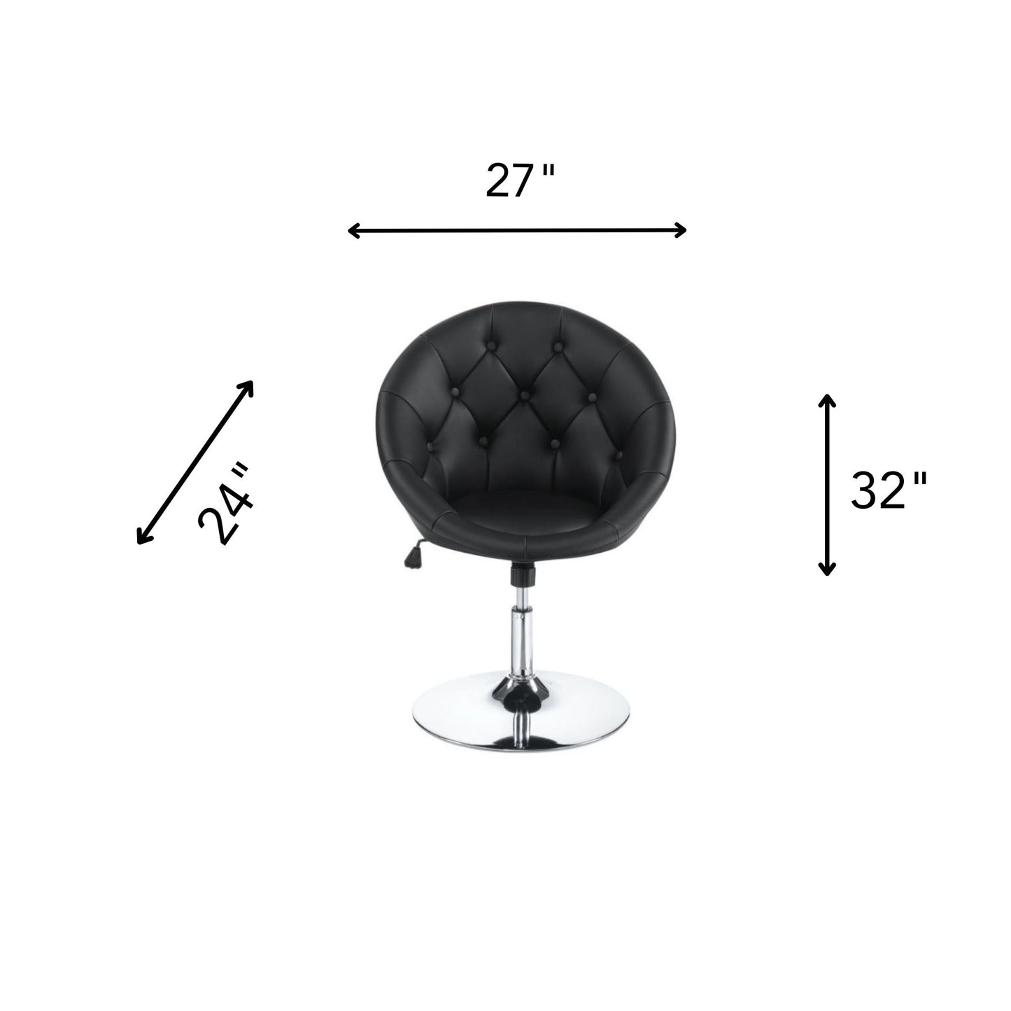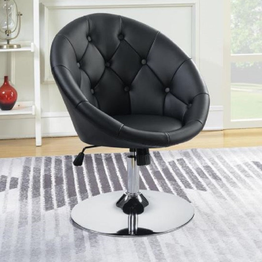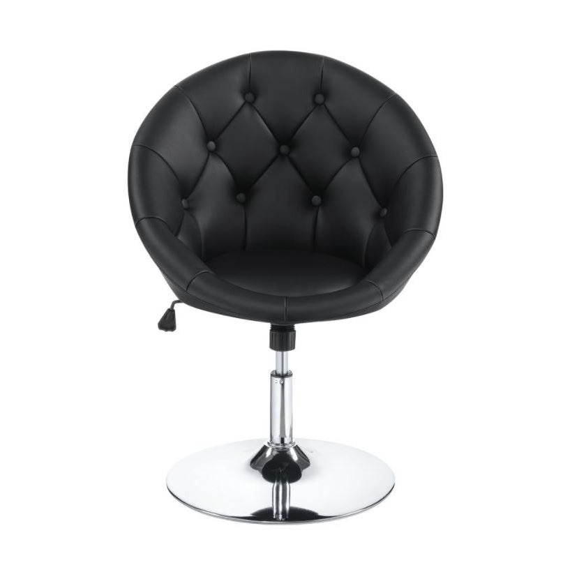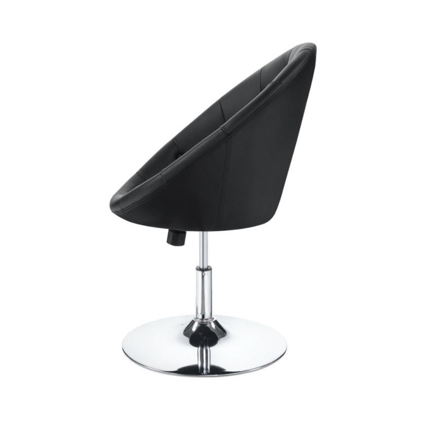 Experience the future of seating with our funky and futuristic accent chair. Upholstered in sleek leatherette, this chair features a convenient height-adjustable swivel base on a chrome frame, allowing you to customize your comfort. With a rounded silhouette, it's not just a chair; it's a stylish and comfortable statement piece that adds a bold, contemporary touch to any room