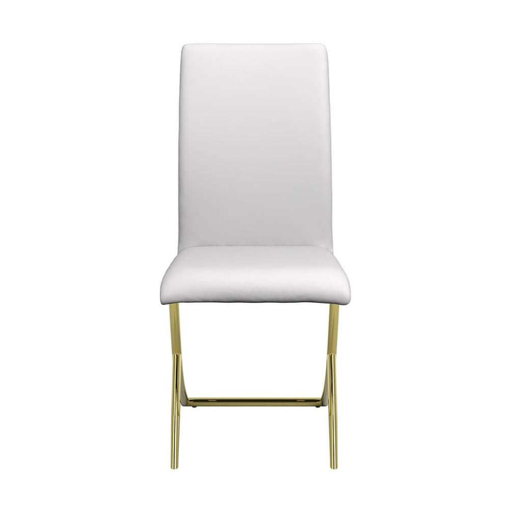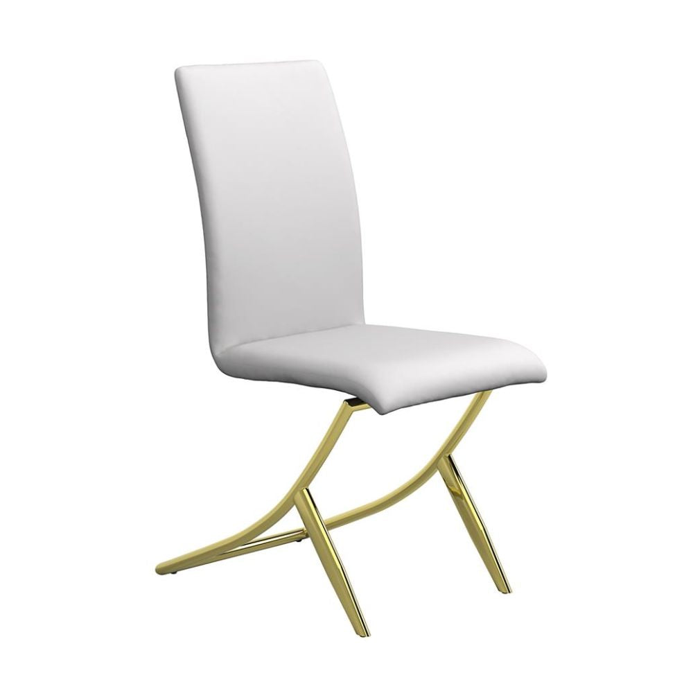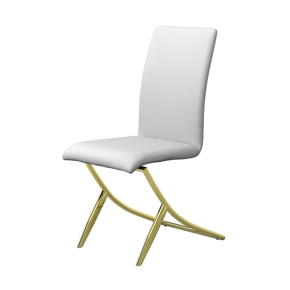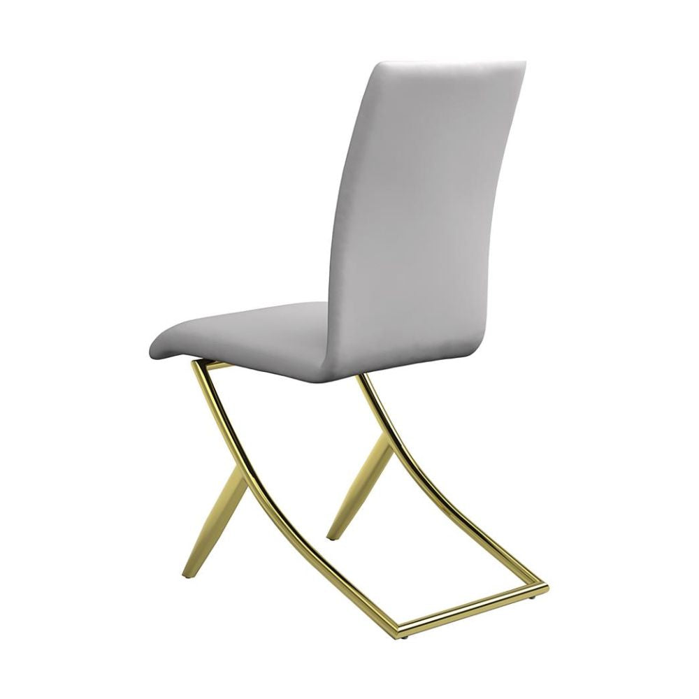 Embrace contemporary elegance in the dining room with this armless dining chair. The sleek design boasts a gracefully contoured leg frame with an upholstered seat and back. The classic glamour of a shiny brass finish on the legs complements the leatherette upholstery. Choose the color that suits your decor, or mix and match for a fun look. Perfect with a glass top dining table for a dramatic contemporary feel.