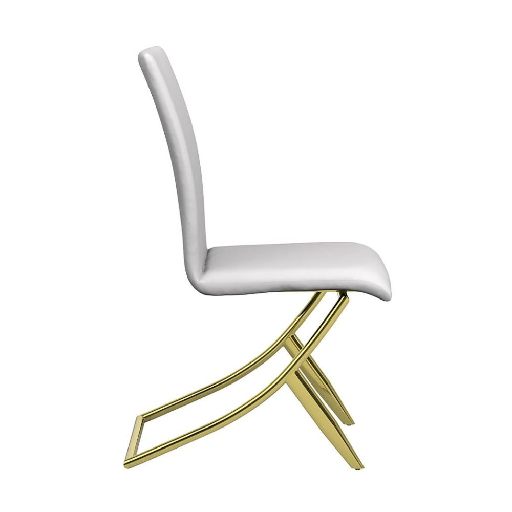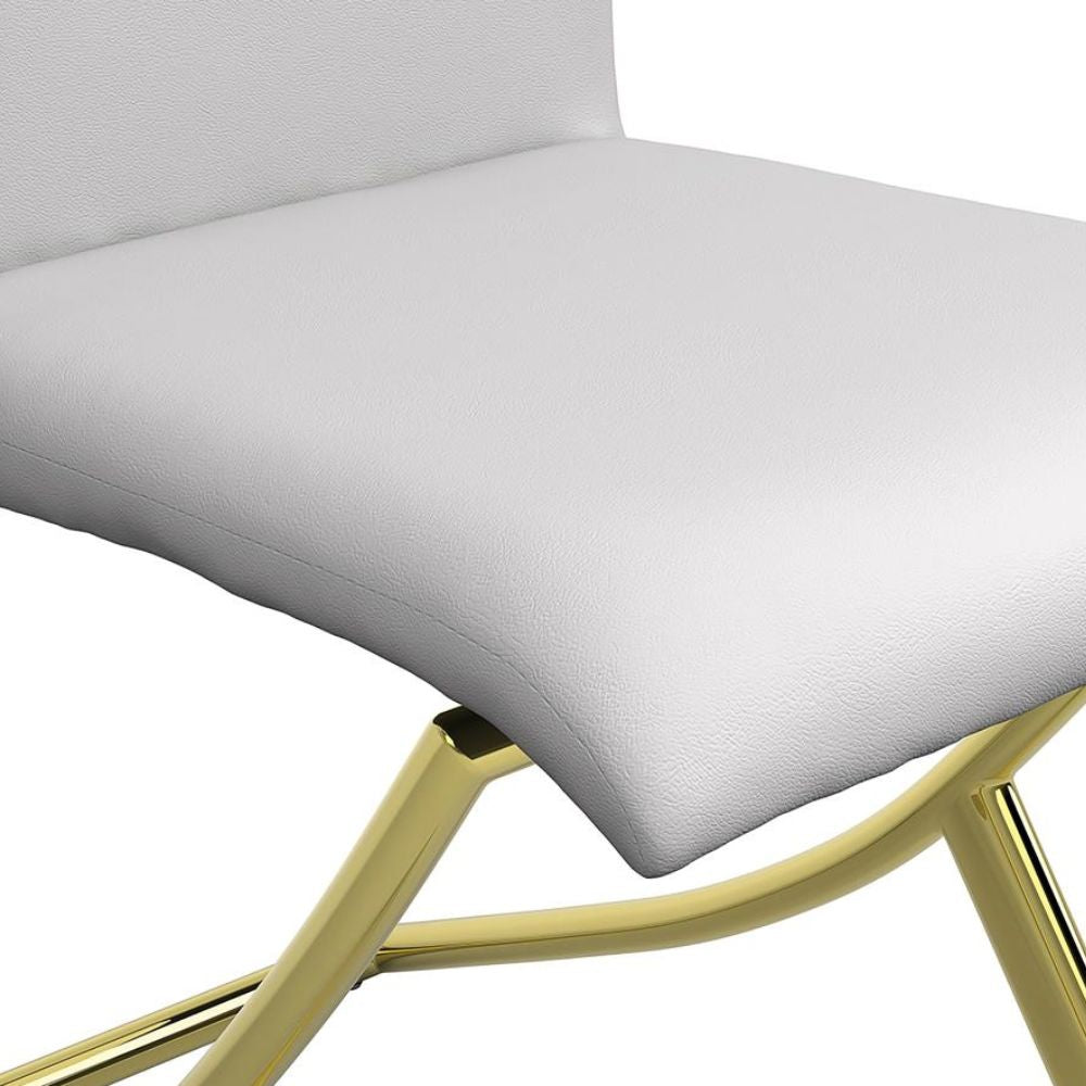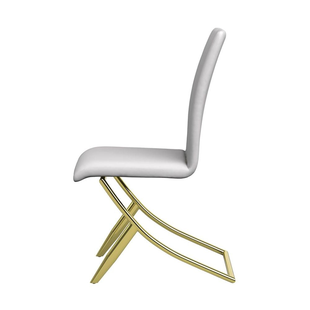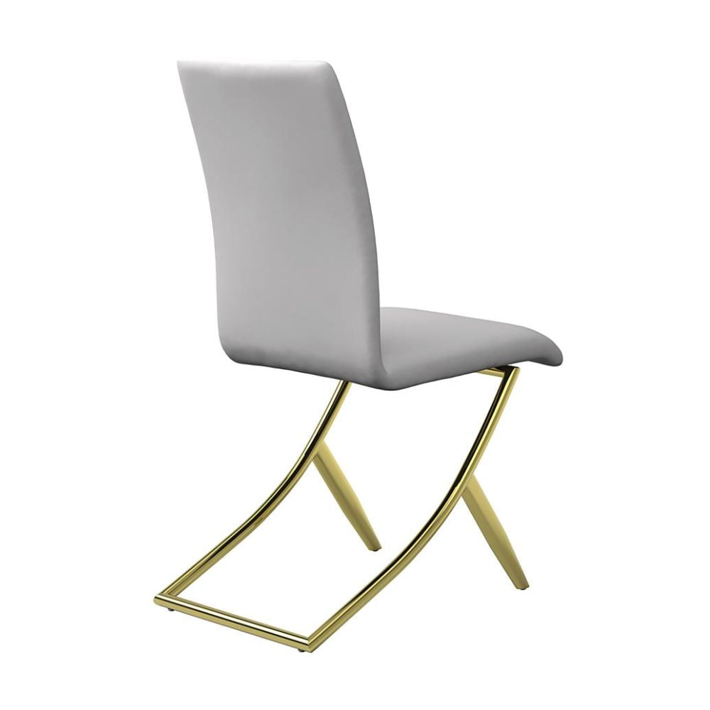 Embrace contemporary elegance in the dining room with this armless dining chair. The sleek design boasts a gracefully contoured leg frame with an upholstered seat and back. The classic glamour of a shiny brass finish on the legs complements the leatherette upholstery. Choose the color that suits your decor, or mix and match for a fun look. Perfect with a glass top dining table for a dramatic contemporary feel.