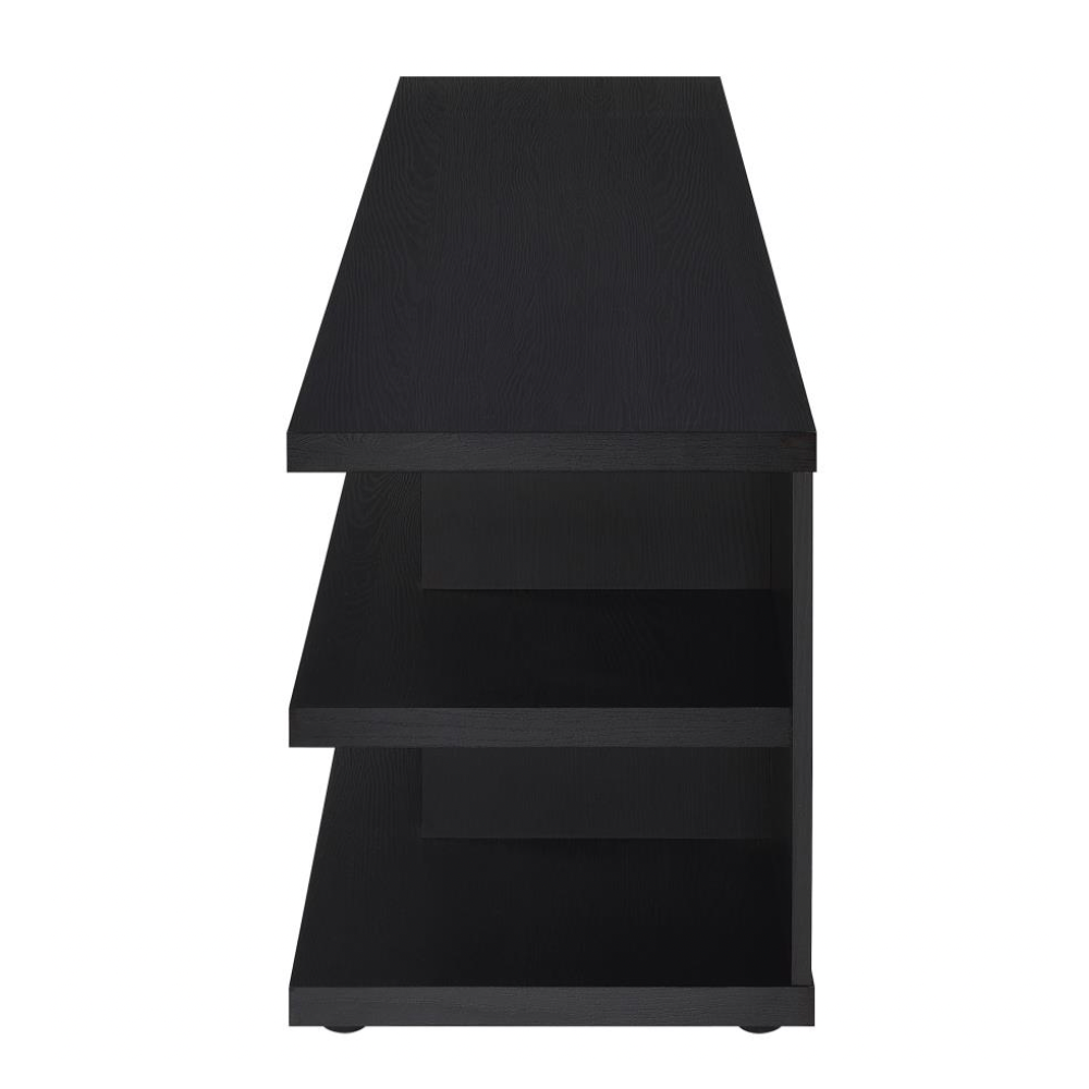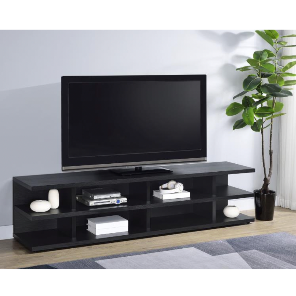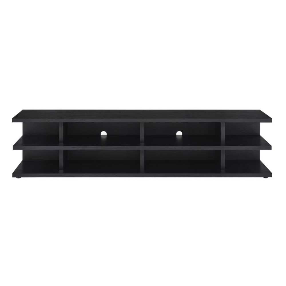 Transform your living room with this expansive entertainment center that seamlessly blends style and functionality. Designed to accommodate TVs up to 80 inches, this versatile unit acts as a media console, TV stand, and display cabinet all in one. Its engineered wood construction is wrapped in a scratch-resistant, eco-friendly laminate veneer with a refined black woodgrain finish, offering both durability and contemporary appeal. Multiple open shelves provide ample space for consoles, speakers, and decorative accents, while built-in cable management ensures a clean and organized look.