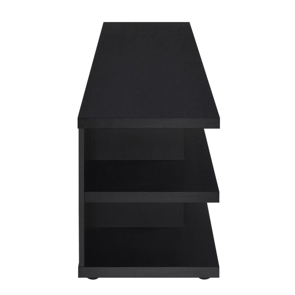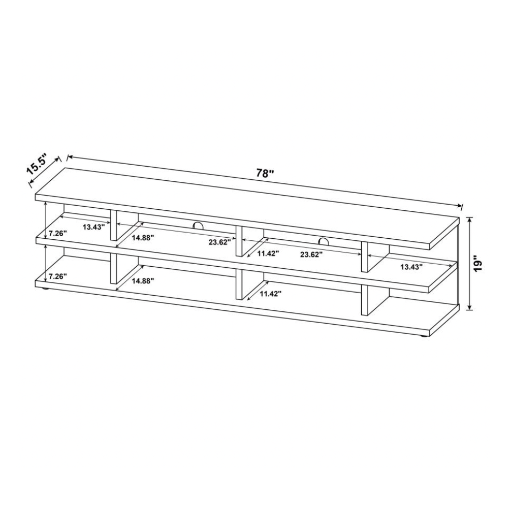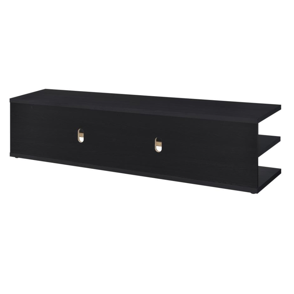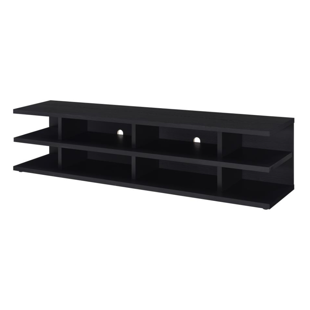 • Ample Storage: Open shelving holds media consoles, speakers, and décor