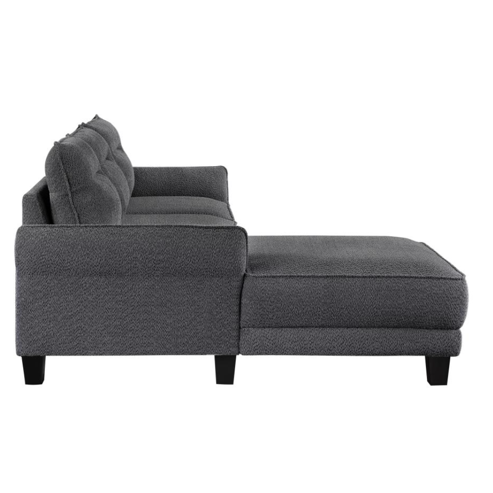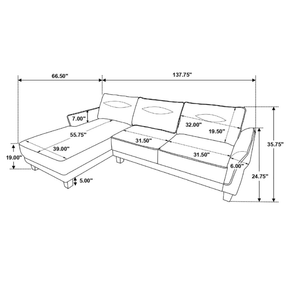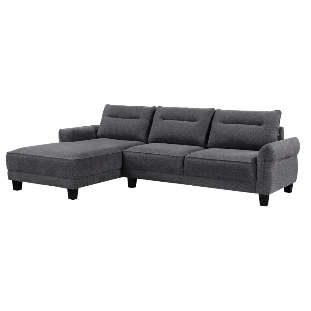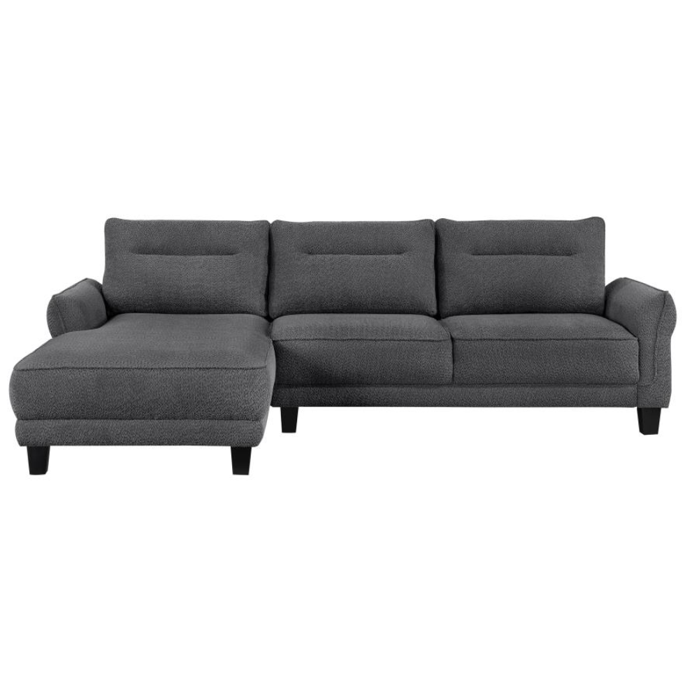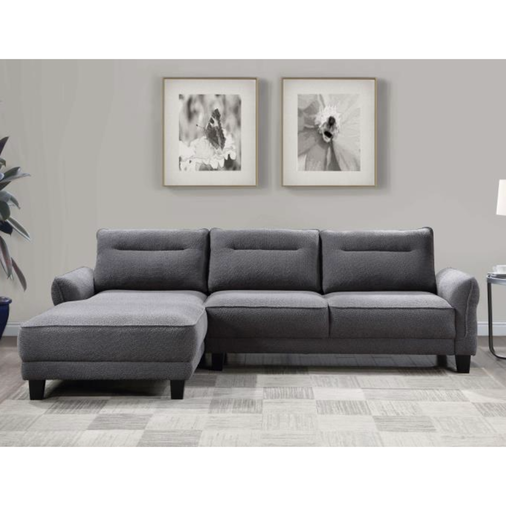 Experience ultimate comfort with this modern two-piece sofa chaise, available in grey or white. The fuzzy teddy bear-like textured fabric upholstery creates a cozy atmosphere. The softly rounded arms and welt-framed reversible back cushions add a touch of sophistication. With attached welt-accented boxed seats and solid wood tapered legs, this sectional ensures a well-kept appearance and sturdy foundation.