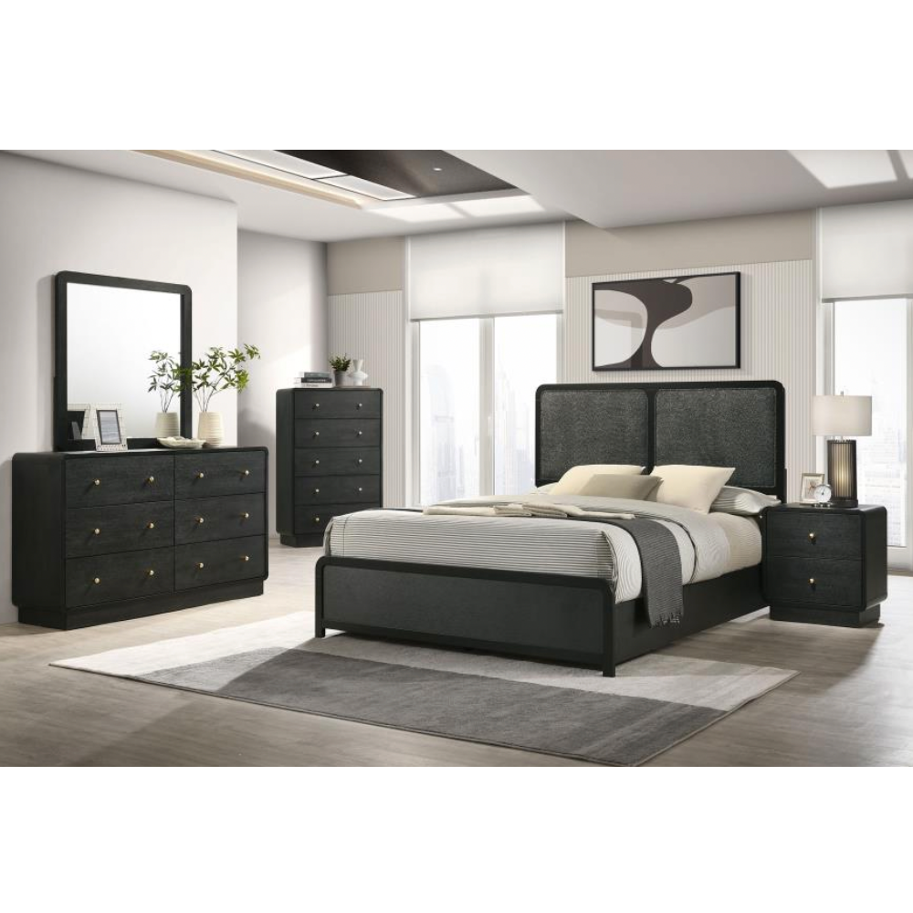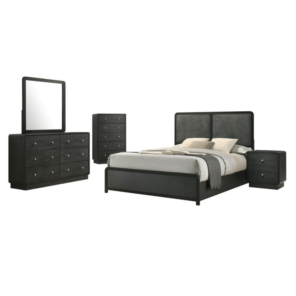 Reimagine your bedroom with the sophisticated charm of this modern bedroom set. The chic upholstered bed features padded charcoal fabric panels that offer a soft, inviting presence, perfect for lounging while maintaining a sleek, refined aesthetic. The storage pieces, including a dresser with an integrated mirror, provide ample organization space and brighten the room. Finished in black with antique hardware, this set adds a touch of glam allure, bringing timeless elegance and functionality to your space.