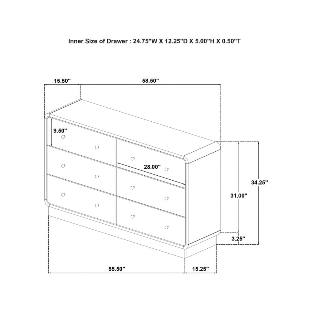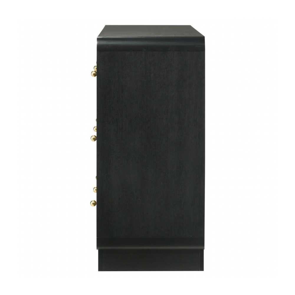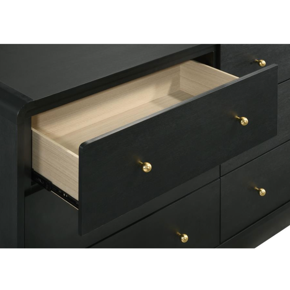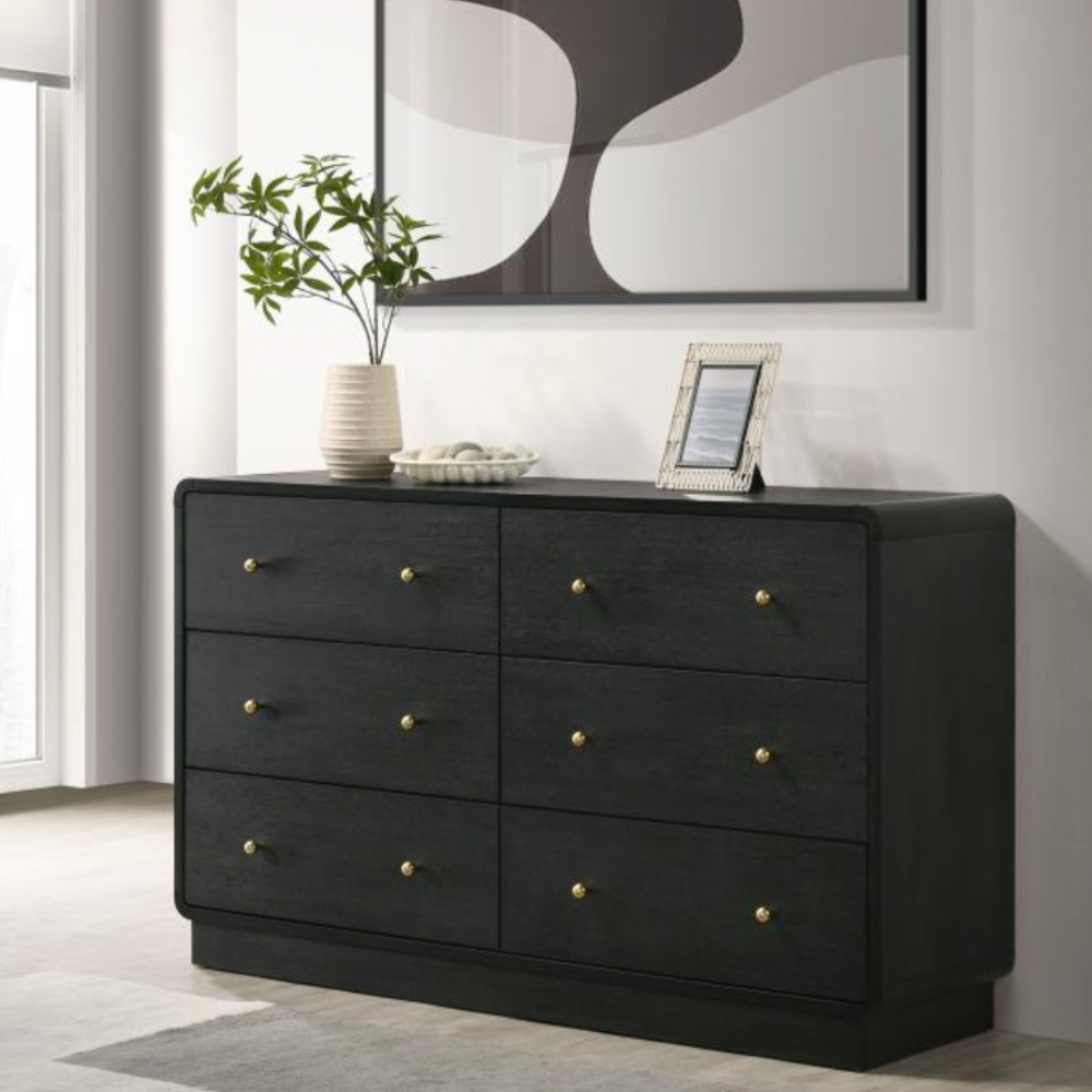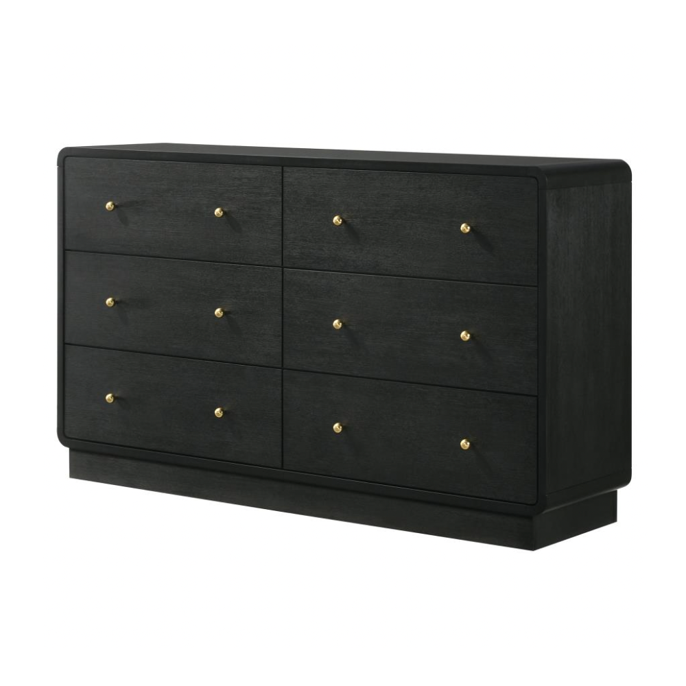 Elevate your bedroom with the modern elegance of this six-drawer dresser, designed to offer abundant storage and a sophisticated presentation. Finished in a sleek black melamine veneer, this dresser is crafted to resist scratches and dents, ensuring it remains looking pristine for years to come. The rounded corners of the case create a soft, inviting aesthetic, while the petite brass-finished ball knobs add a touch of glamour and warmth to each drawer. The wide top provides ample space for personal touches, like jewelry boxes or decorative items, making it a stylish and functional addition to your bedroom.