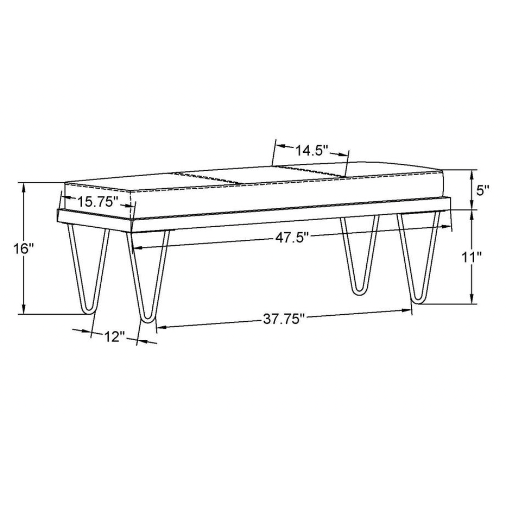 Add a touch of casual charm and functionality to your space with this versatile upholstered bench. Designed for both style and comfort, it features a cozy cushion wrapped in dark blue denim upholstery, making it a standout piece in any entryway or bedroom. Retro-inspired hairpin metal legs bring an industrial flair, while their deep black finish offers a bold contrast. A natural wood accent adds a rustic touch, completing the bench's modern-meets-rustic appeal. Perfect for seating or decorative purposes, this bench effortlessly enhances mid-century or transitional decor.