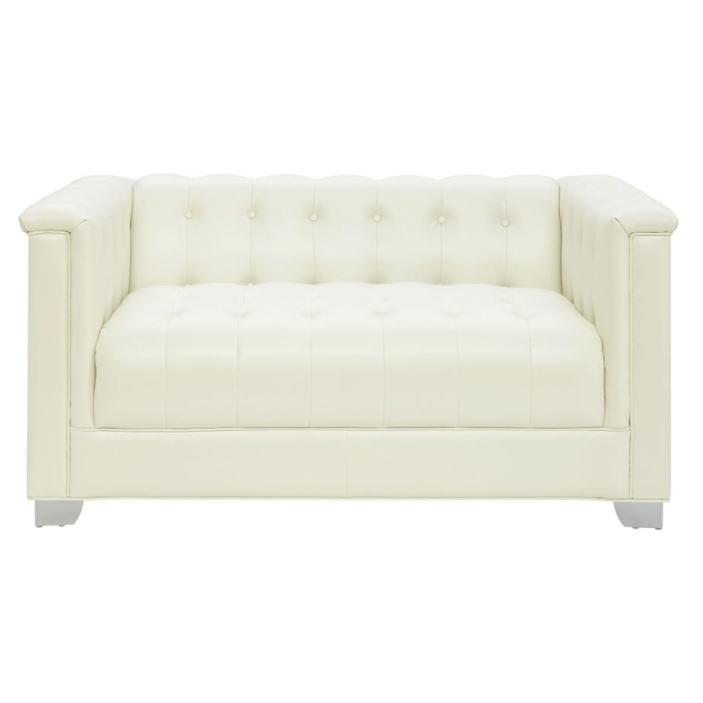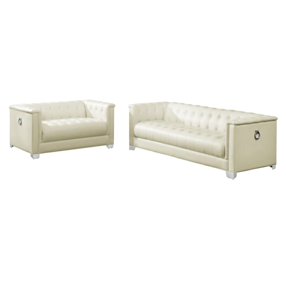 This two-piece living room set combines sleek, low-profile design with a touch of glamour. Upholstered in crisp, white padded leatherette with deep button tufting and quilted detailing, it exudes modern sophistication. Chrome accents, including doorknocker handles and legs, enhance its luxe appeal.