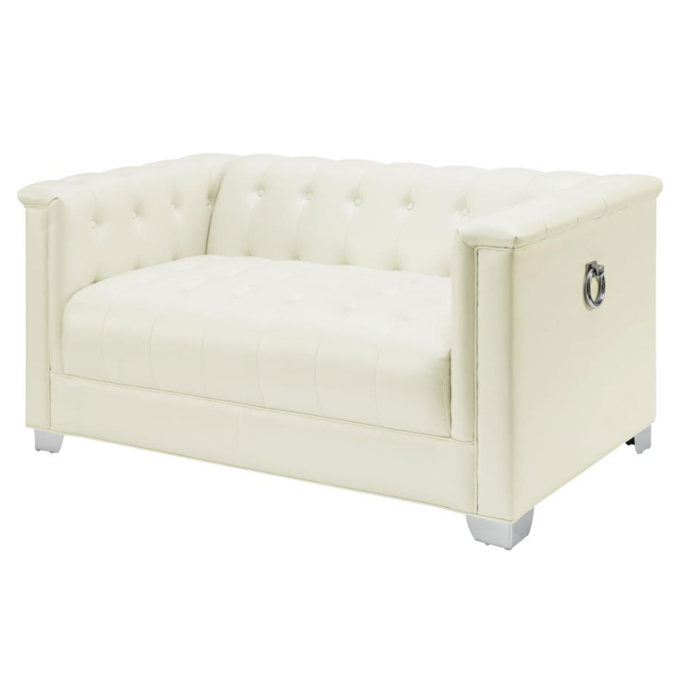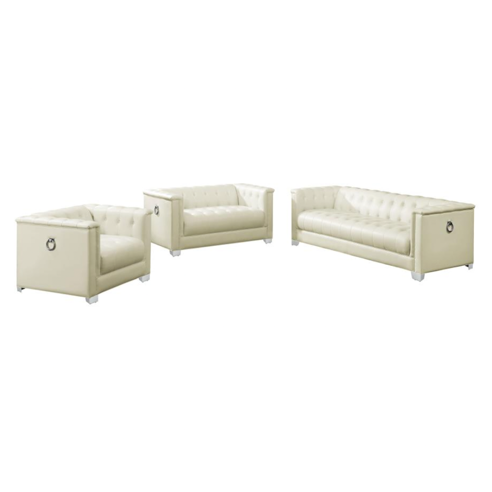 This glamorous three-piece living room set features sleek lines and chic details for a contemporary, low-profile design. Upholstered in white padded leatherette with deep button tufting and quilted detailing, the set is complemented by chrome doorknocker handles and legs for a radiant, modern look. Perfect for dressing up any room with its luxe appeal.
