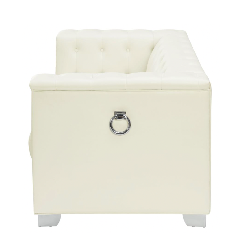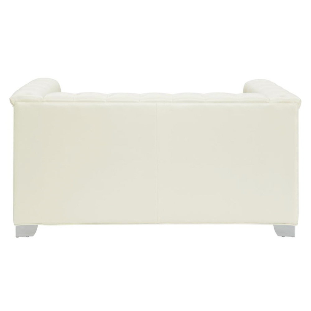 Add modern glamour to your living space with this sleek, stylish loveseat. Upholstered in breathable pearl white leatherette, it combines comfort with a contemporary design, featuring heavy-duty chrome doorknocker handles and deep button tufting for a fashionable flair.