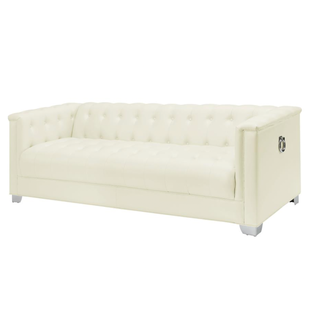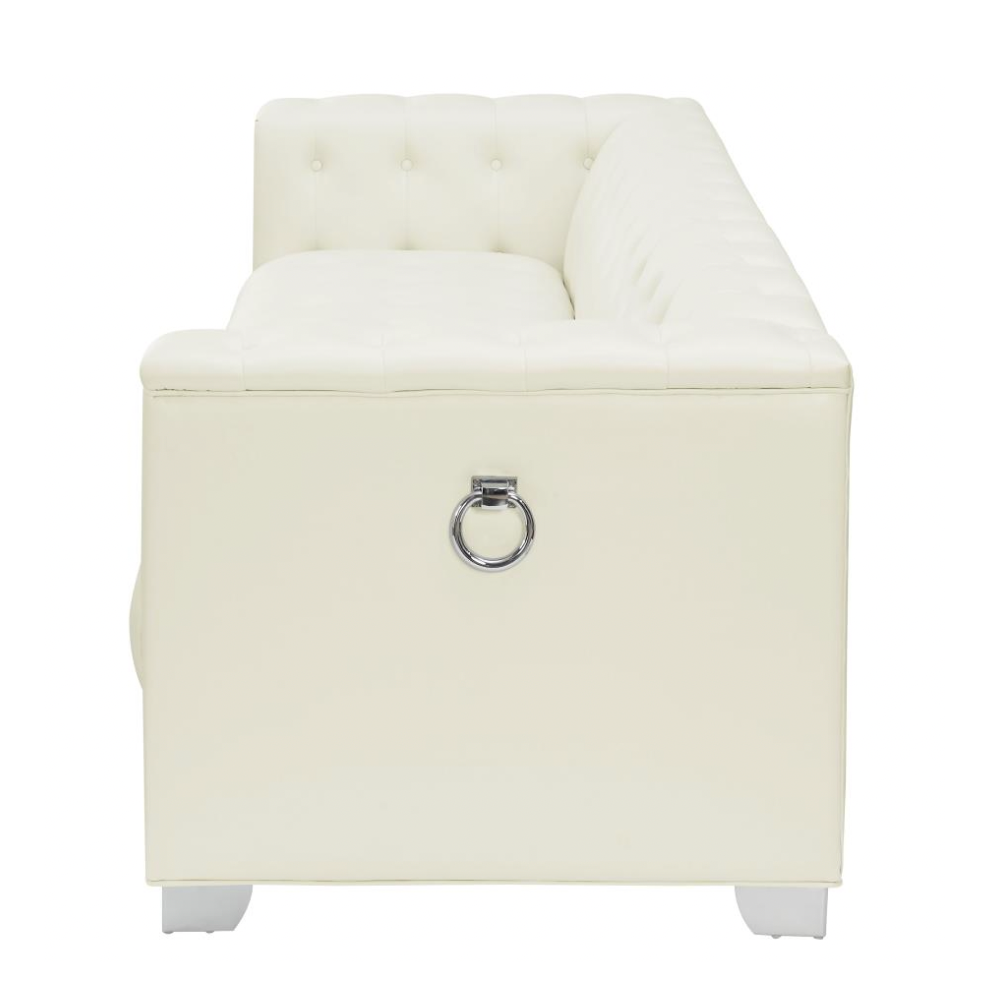 Elevate your living room with this chic, contemporary sofa. Upholstered in pearl white leatherette with deep button tufting, it offers both style and comfort. The sleek silhouette, chrome doorknocker handles, and high-shine chrome legs add a bold, modern edge to your space.