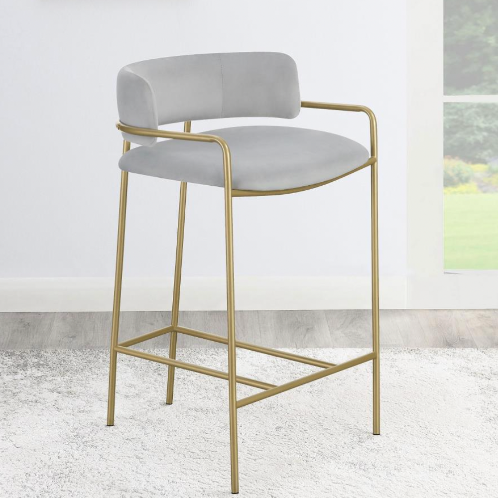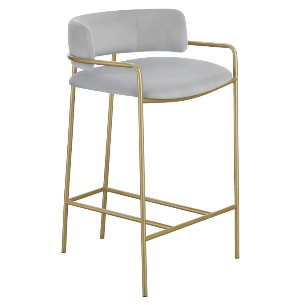Elevate your home bar or kitchen island with this chic and glamorous stool, enveloped in soft and supple grey velvet. The padded seat and linear backrest provide both comfort and style, perfectly suited for a mid-century or contemporary space. Supported by a slim, rod-like frame in a striking gold finish, this stool exudes sophistication and offers a retro flair with a glam vibe. The cool grey upholstery contrasts beautifully with the warm metallic frame, creating a stunning visual effect that enhances any setting. Whether you're enjoying a cocktail or unwinding with a glass of wine, this elegant stool invites relaxation.